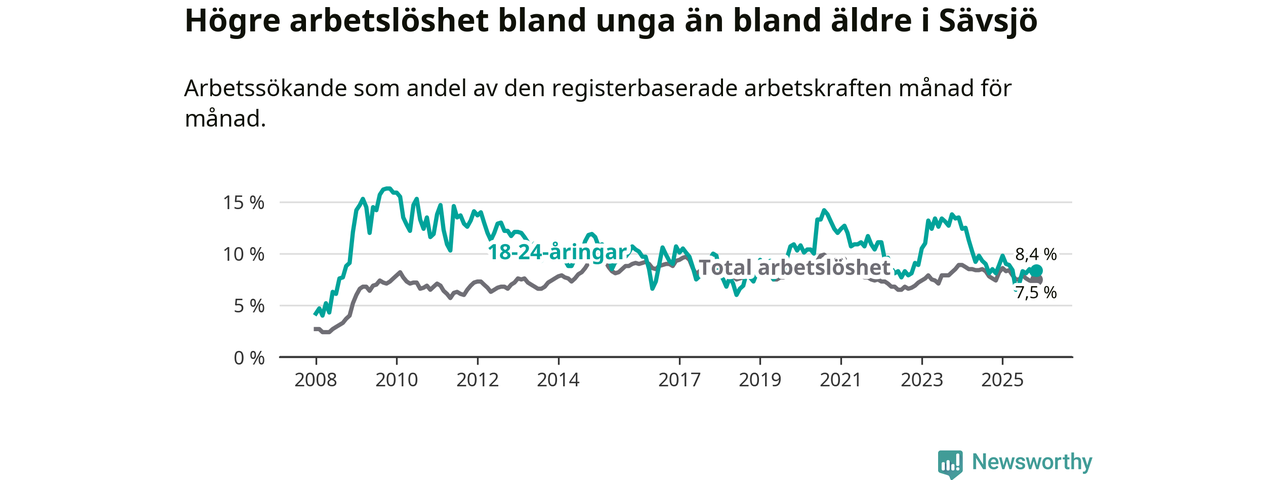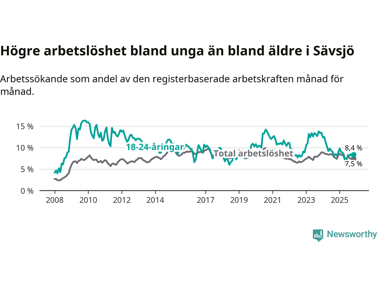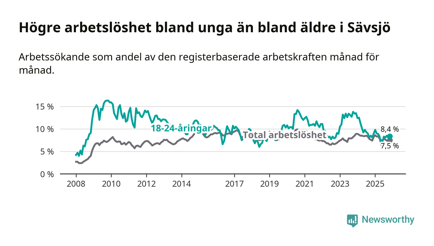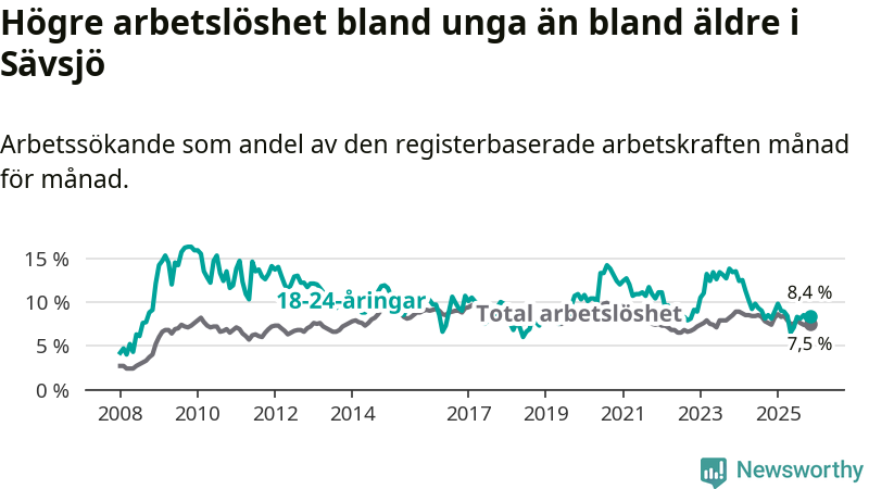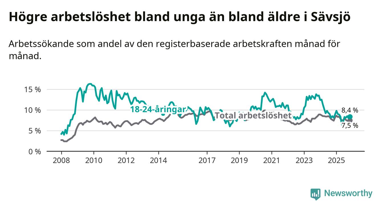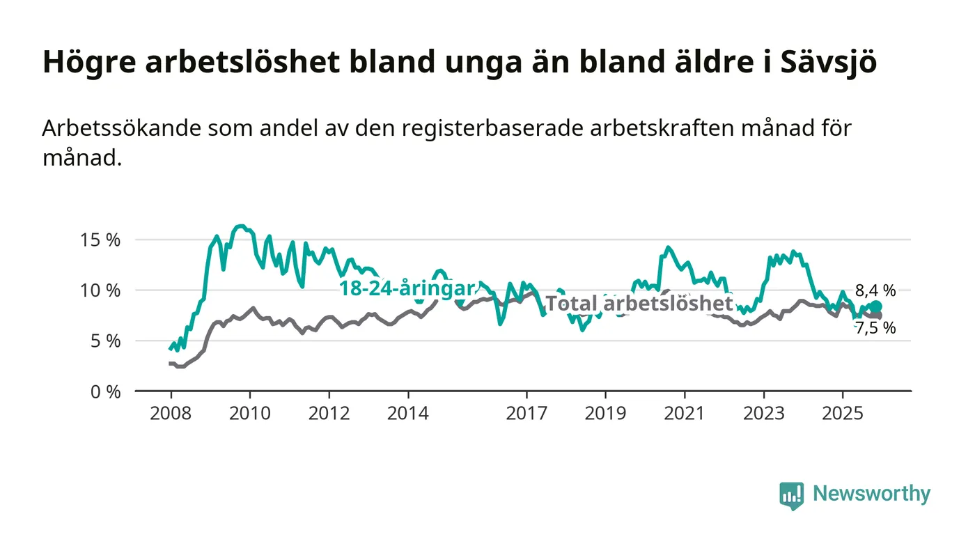 Precis som den totala arbetslösheten ligger ungdomsarbetslösheten i Sävsjö högre än i Jönköpings län som helhet. Skillnaden mellan kommunen och länet är 1,7 procentenheter.