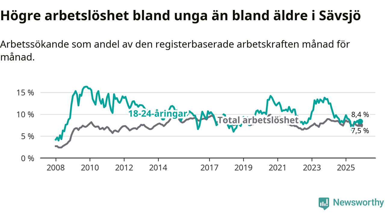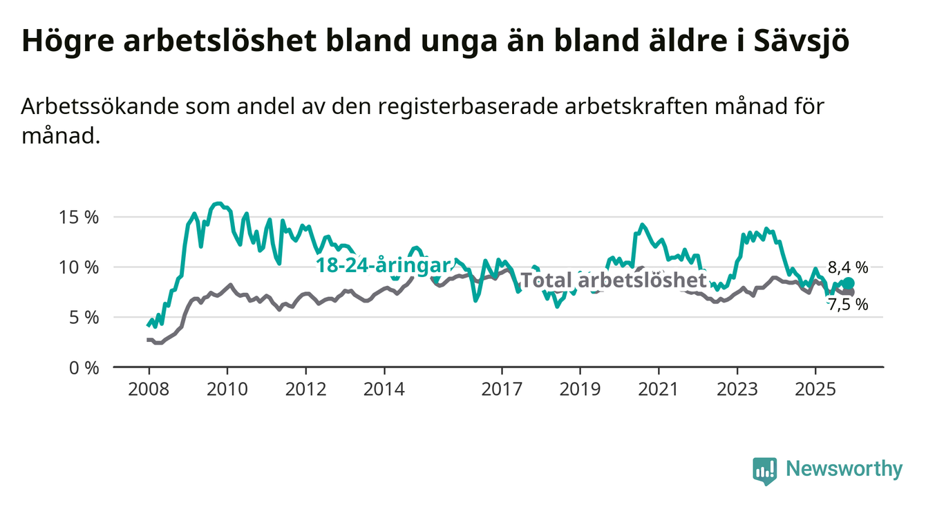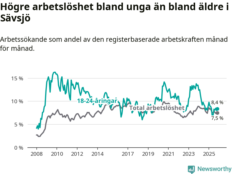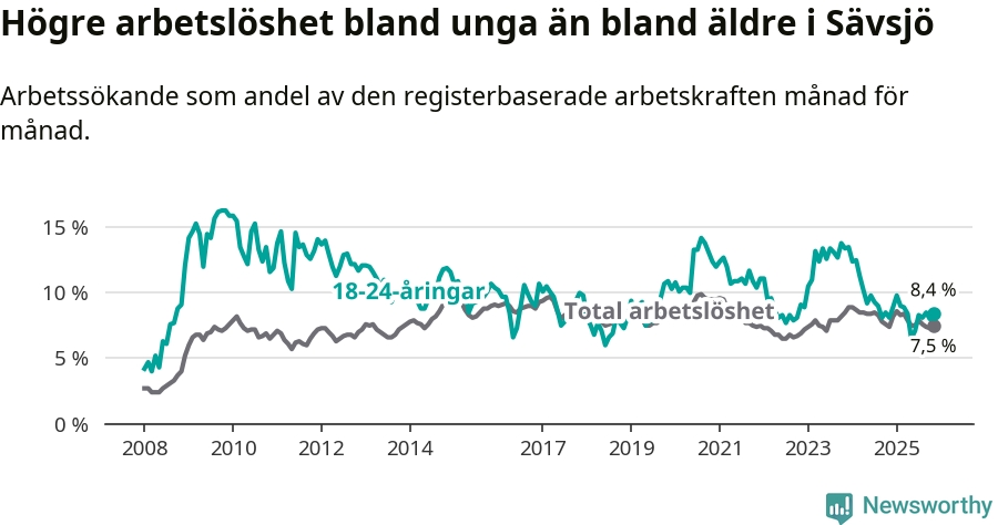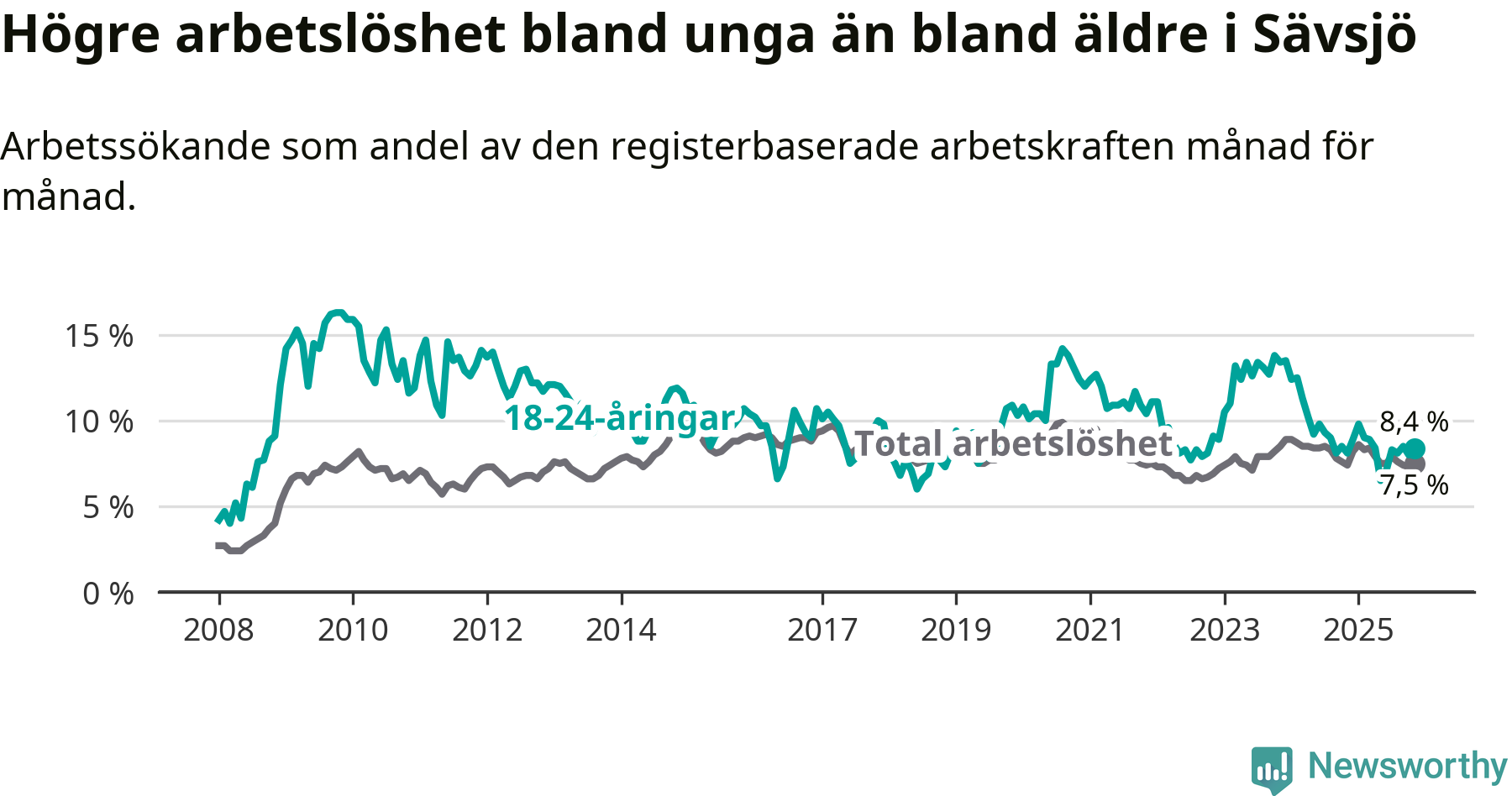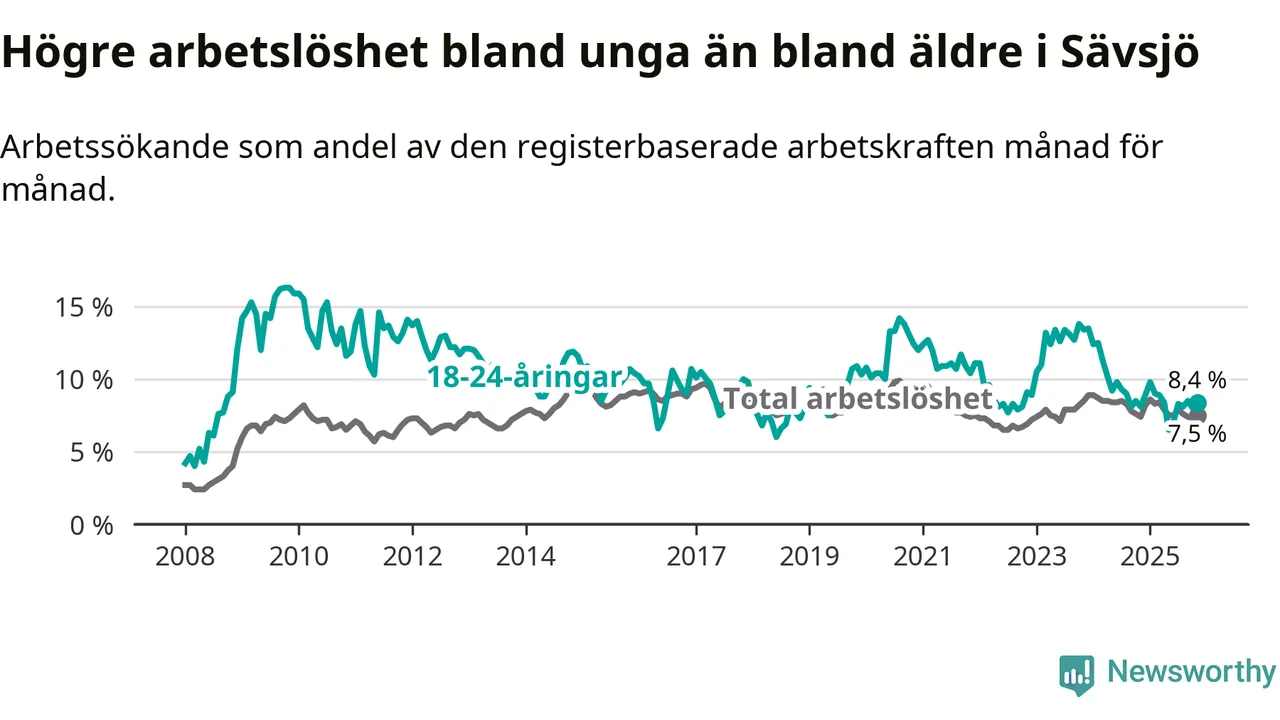 Precis som den totala arbetslösheten ligger ungdomsarbetslösheten i Sävsjö högre än i Jönköpings län som helhet. Skillnaden mellan kommunen och länet är 1,7 procentenheter.