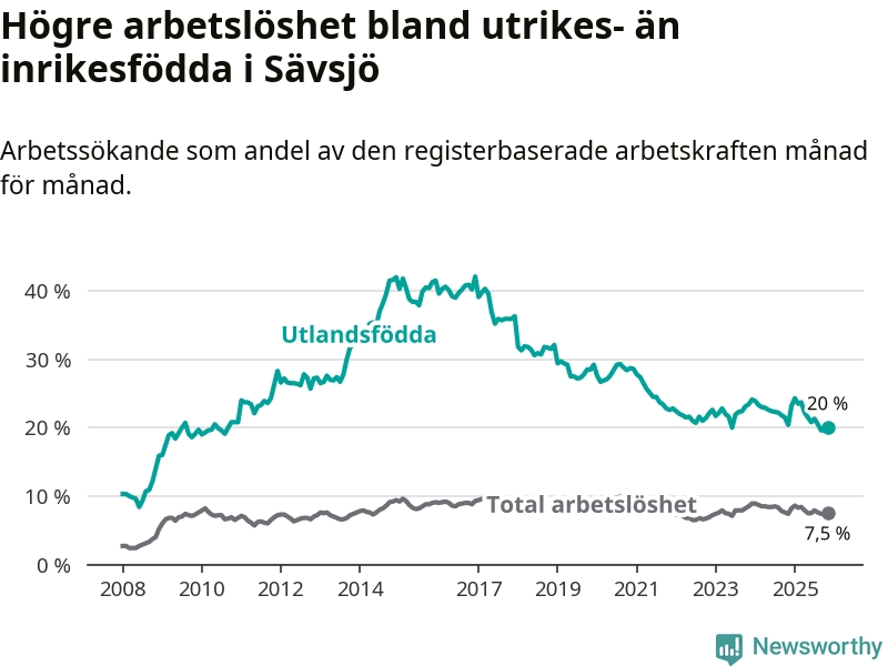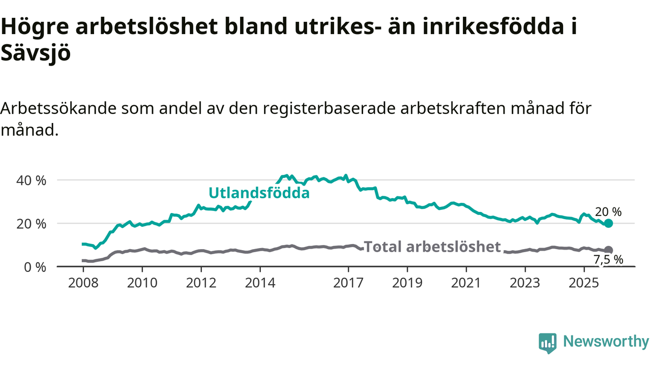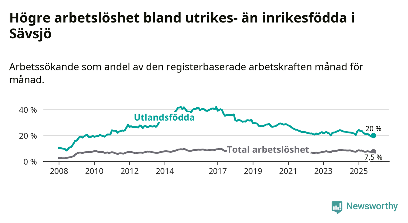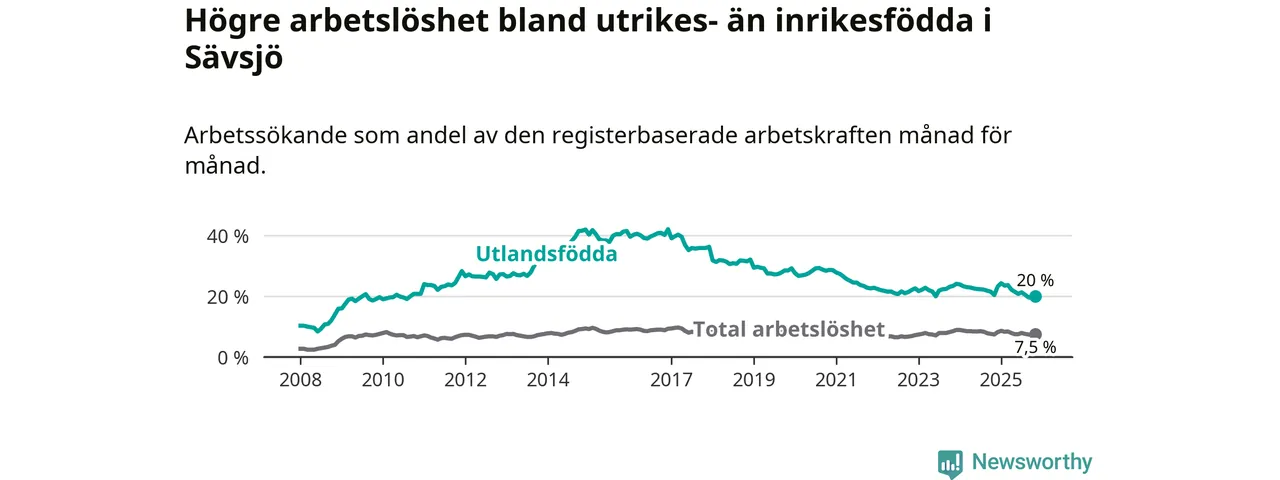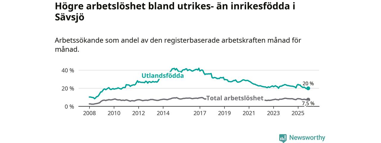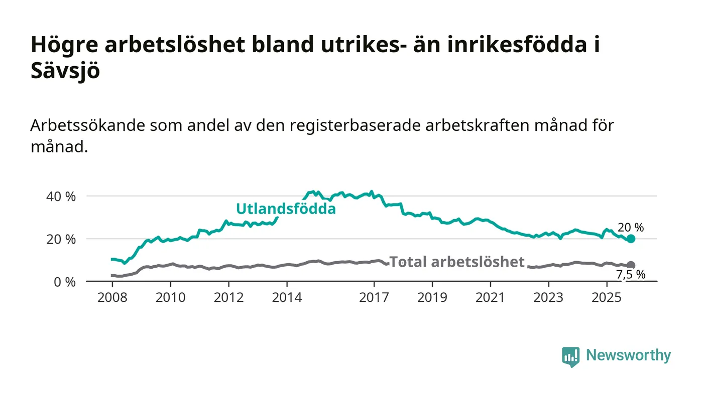 Skillnaden i arbetslöshet mellan utrikesfödda och hela befolkningen är 12,5 procentenheter i Sävsjö. Det är en mindre skillnad än för ett år sedan (−0,5 procentenheter).