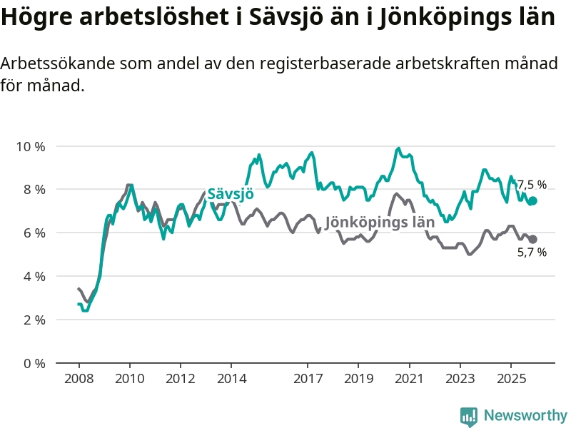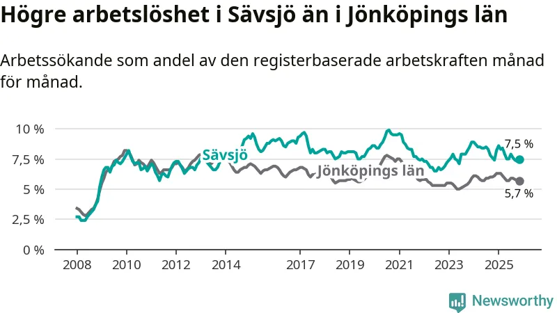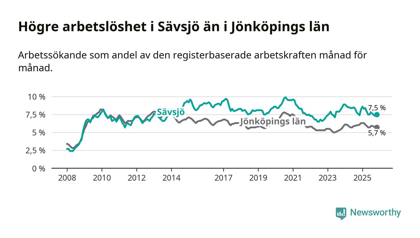 Sävsjö hade redan tidigare högre arbetslöshet än snittet i hela Jönköpings län och nu växer klyftan (7,5 procent i kommunen, jämfört med 5,7 procent i hela länet). Habo har den lägsta arbetslösheten i länet (3,3 procent), medan Nässjö har den högsta (7,6 procent). För att Sävsjö skulle komma ner i samma arbetslöshetsnivå som Habo skulle 225 personer behöva sysselsättas.