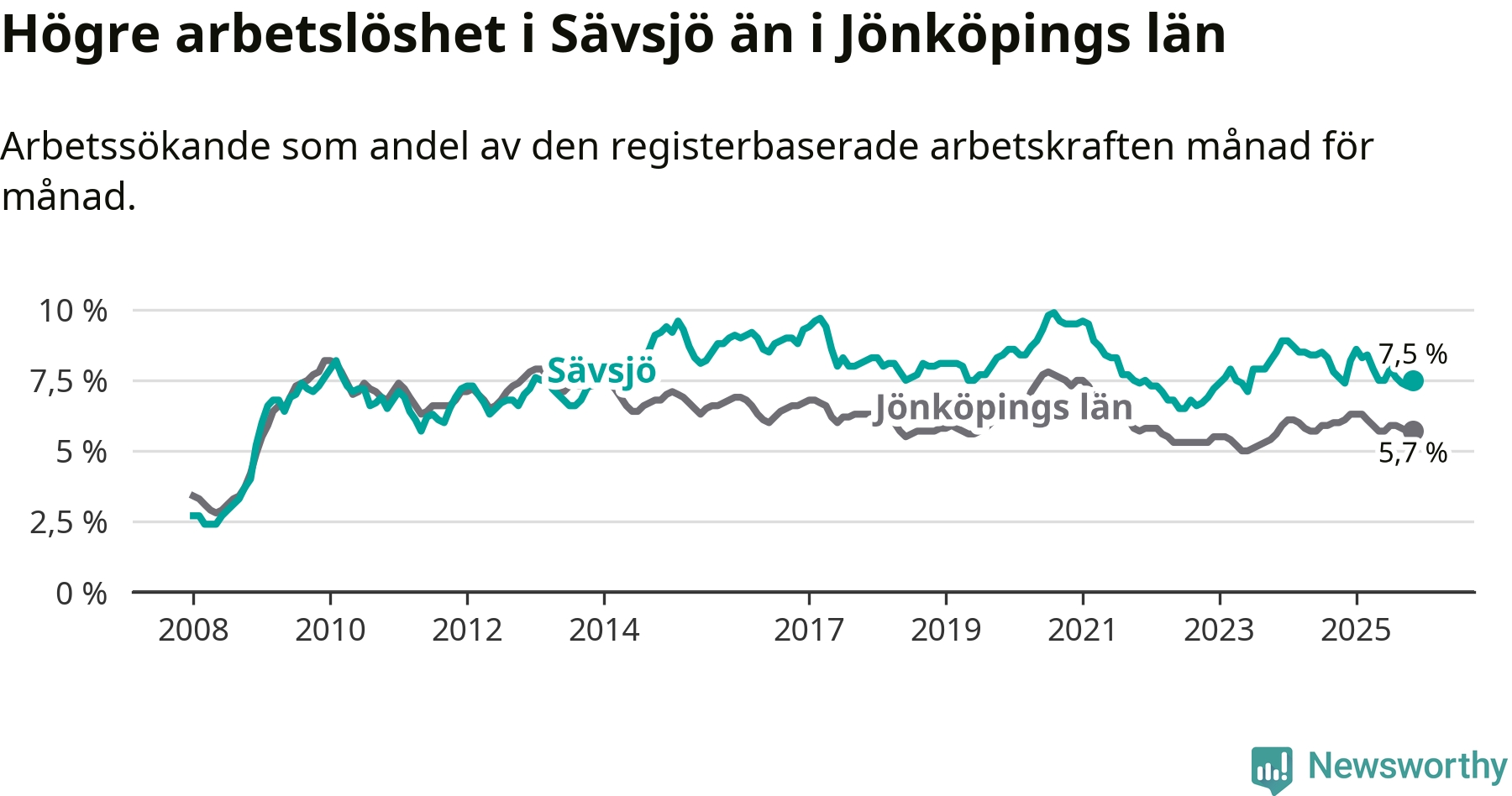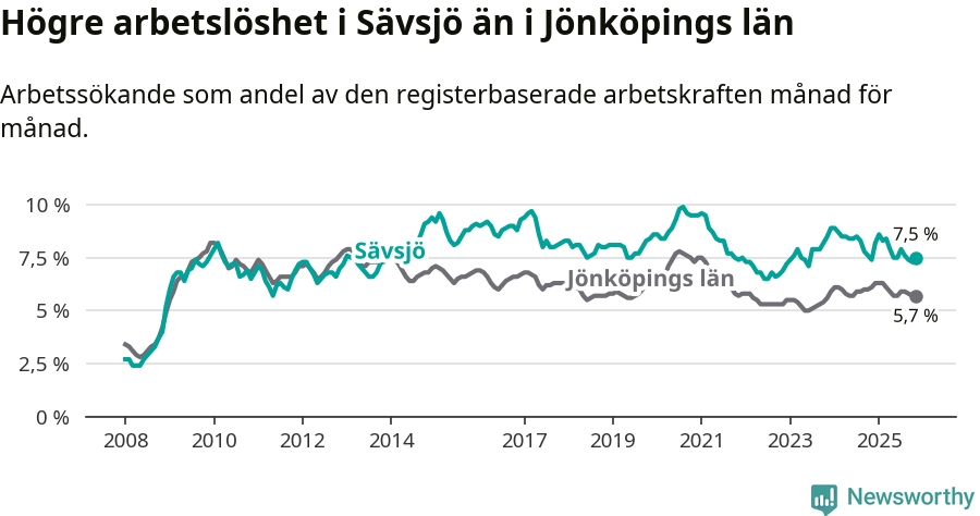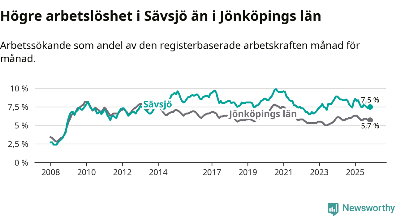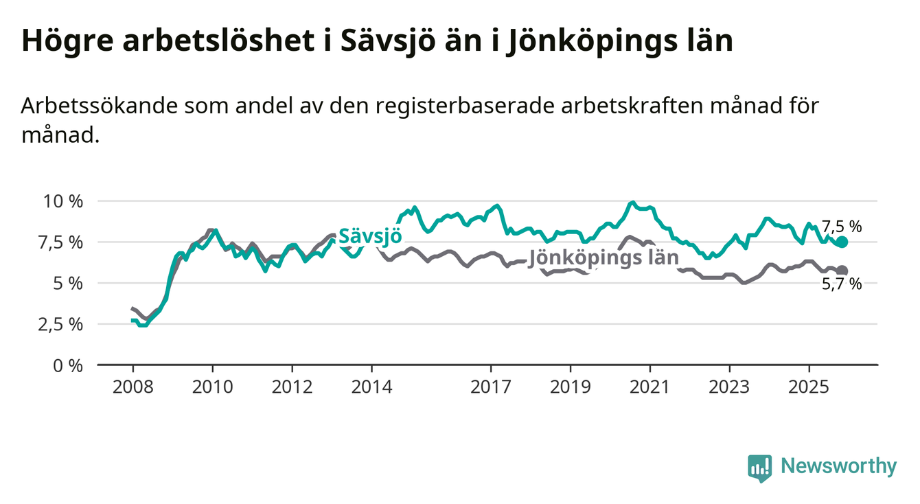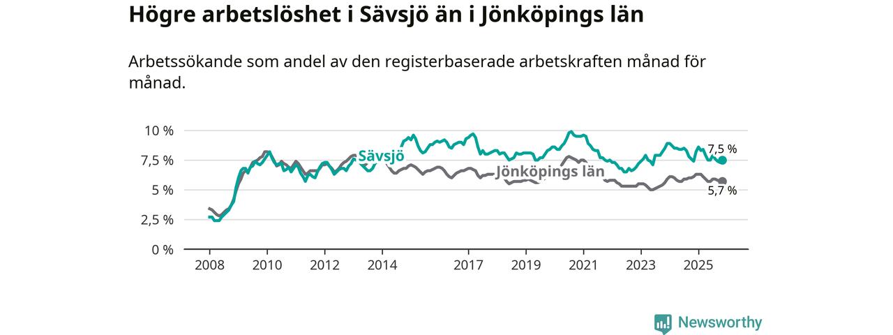 Under november månad rapporterade Sävsjö kommun en total arbetslöshet på 7,5 procent. Det är en ökning jämfört med samma tidpunkt i fjol (+0,1 procentenheter). I Jönköpings län däremot sjunker arbetslösheten .