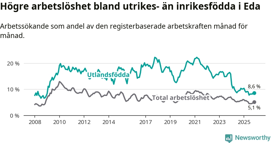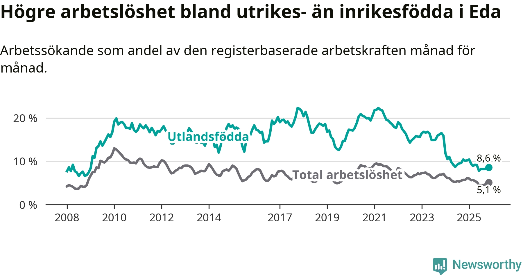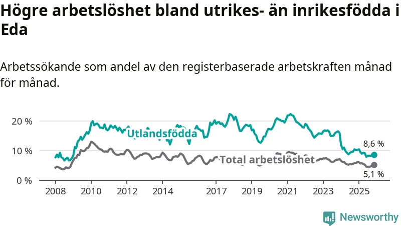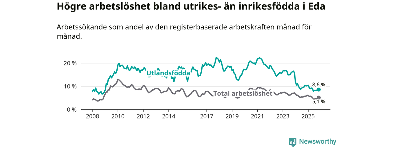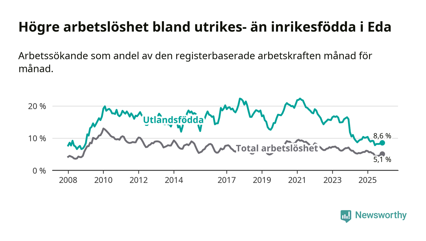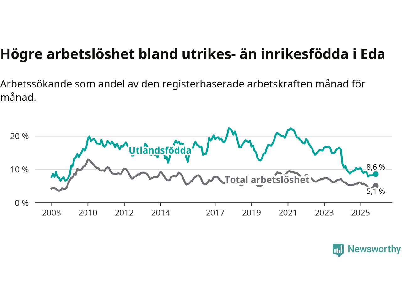 Arbetslösheten bland utlandsfödda var 8,6 procent i Eda under november månad, motsvarande 94 av 1 093 personer. Det är 1,5 procentenheter färre än vid samma tidpunkt i fjol (−19 om man räknar personer). Därmed är de utlandsföddas arbetslöshet lägre än vid samma tidpunkt i fjol för 23:e månaden i följd. Sedan december 2023 har arbetslösheten bland utlandsfödda minskat från 15,9 till 8,6 procent.