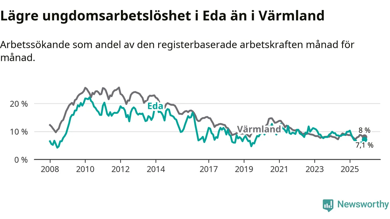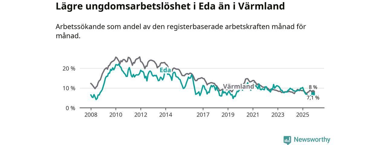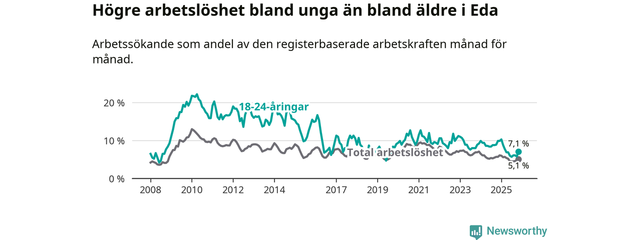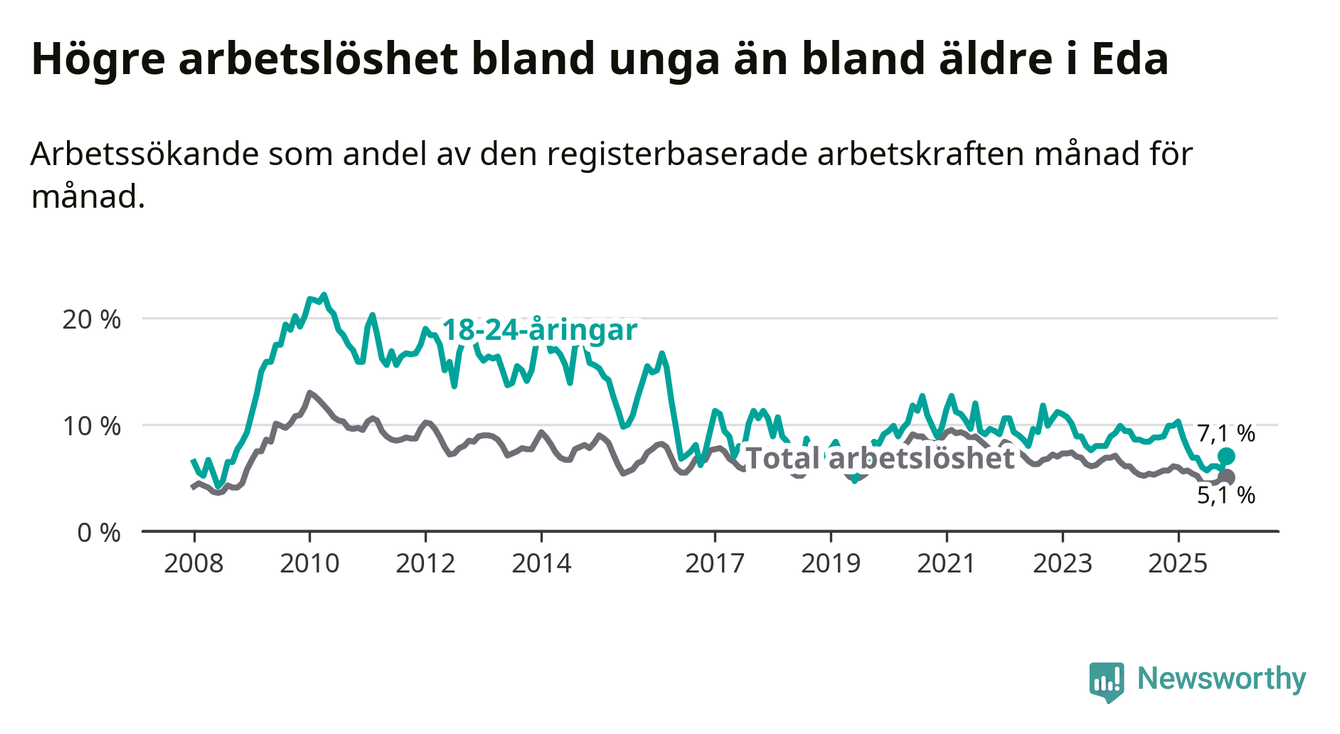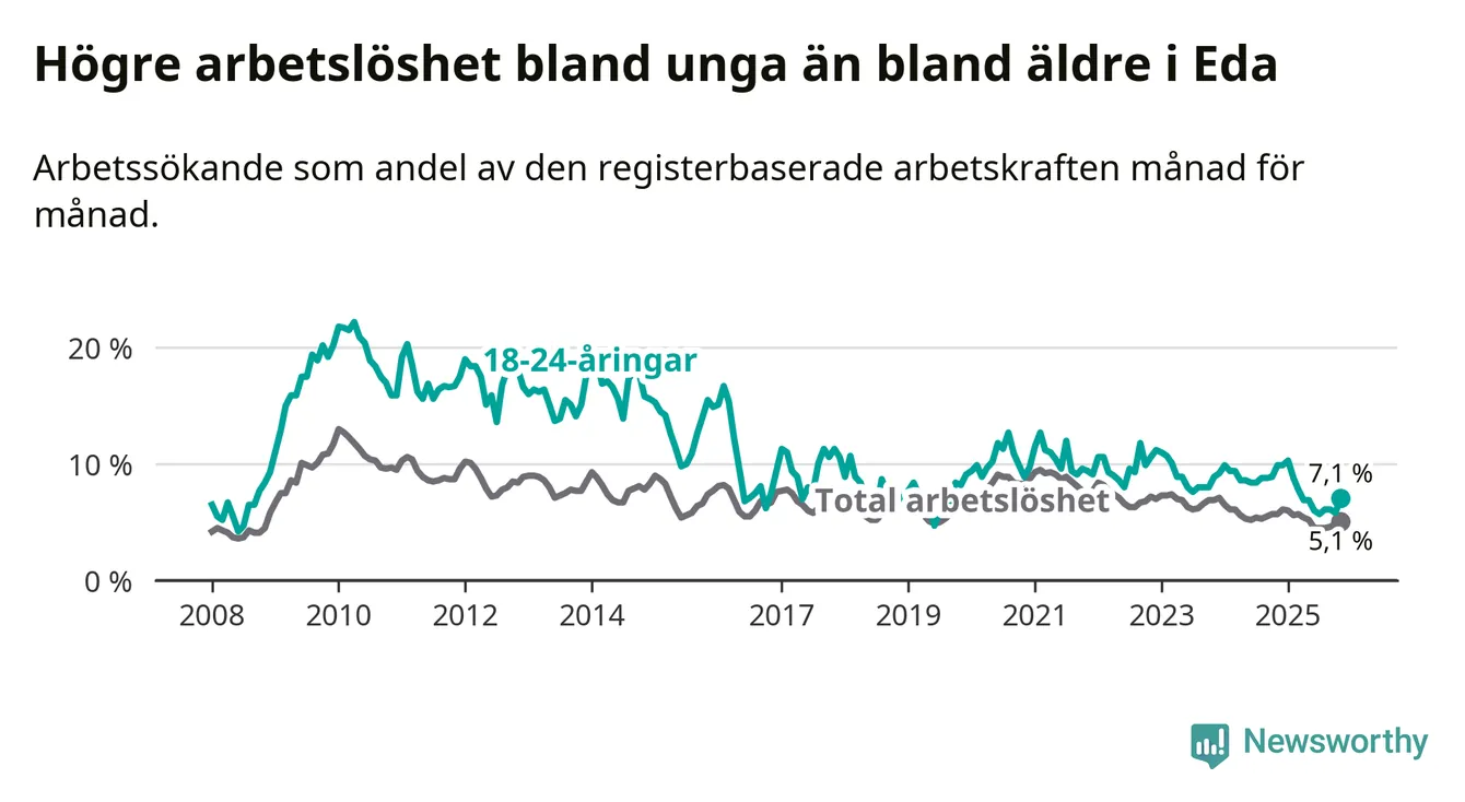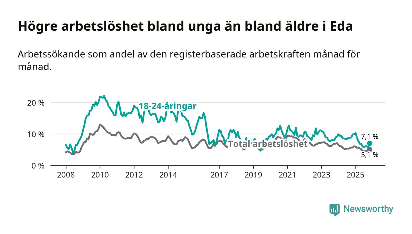 I och med den senaste månadens nedgång har de ungas arbetslöshet i Eda sjunkit tio månader i följd (ner från 10,3 procent i januari till 7,1 procent nu).