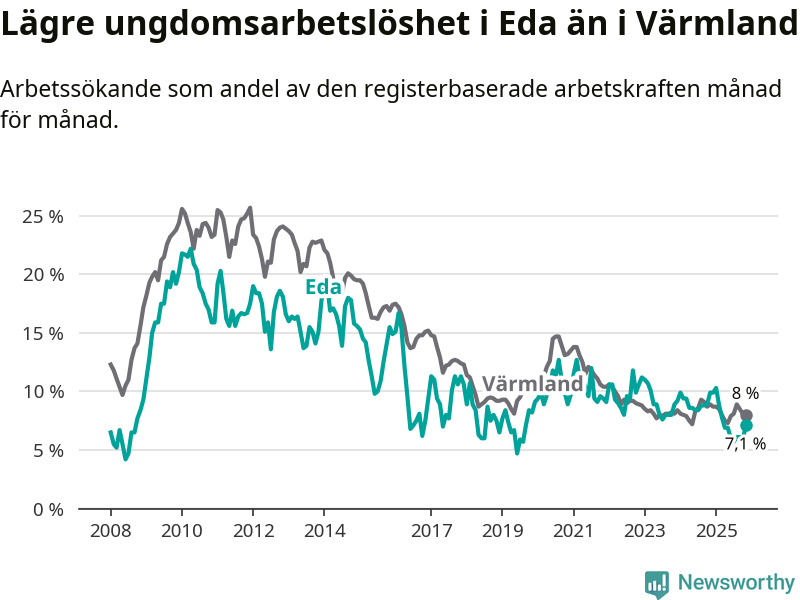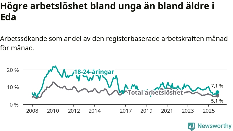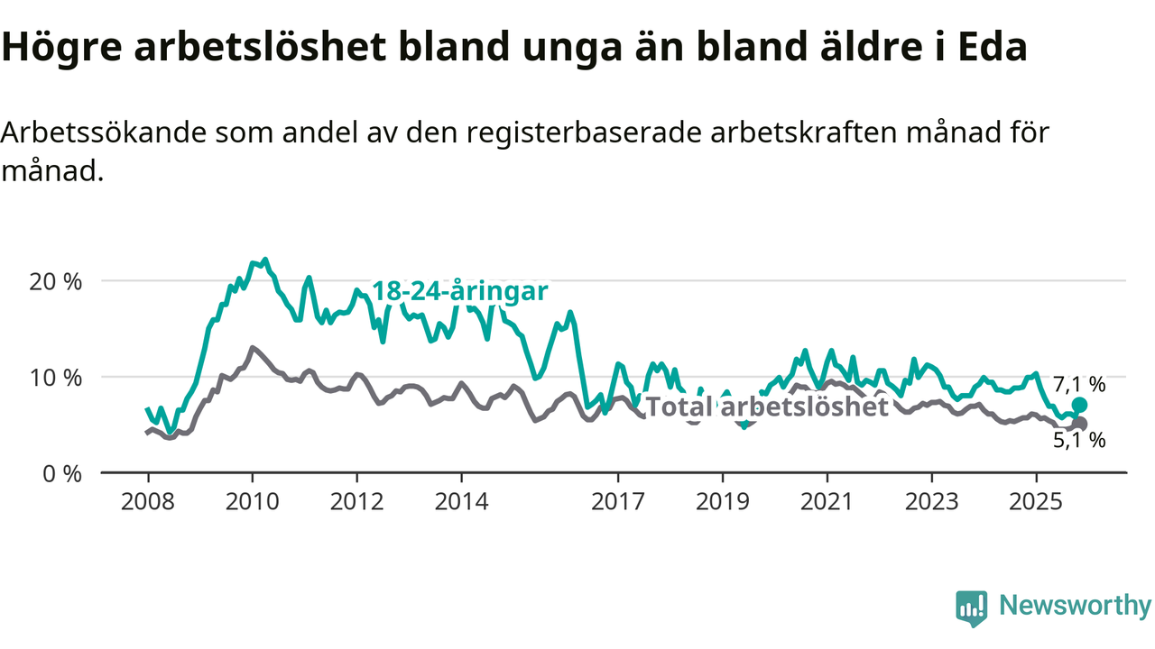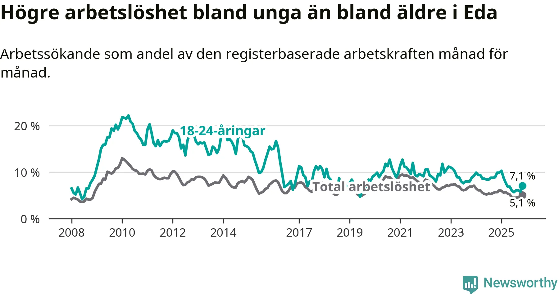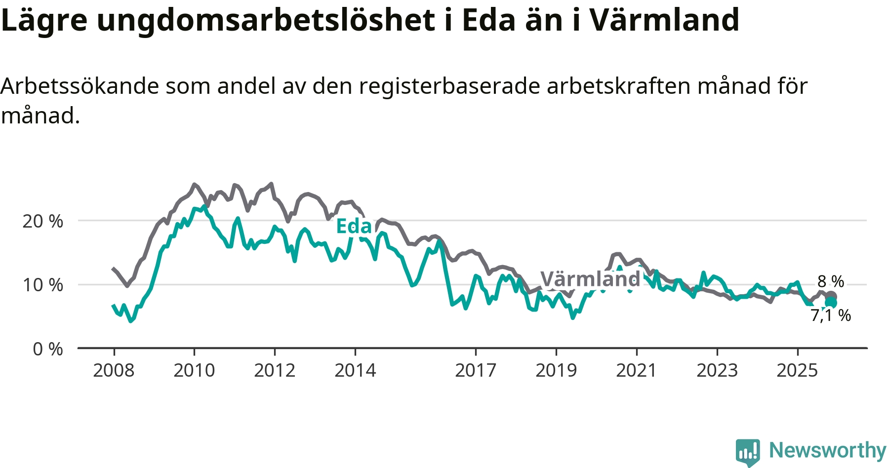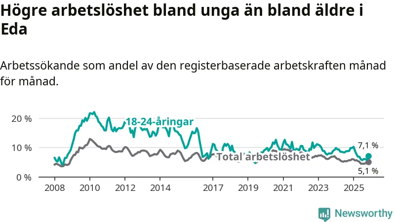 I och med den senaste månadens nedgång har de ungas arbetslöshet i Eda sjunkit tio månader i följd (ner från 10,3 procent i januari till 7,1 procent nu).