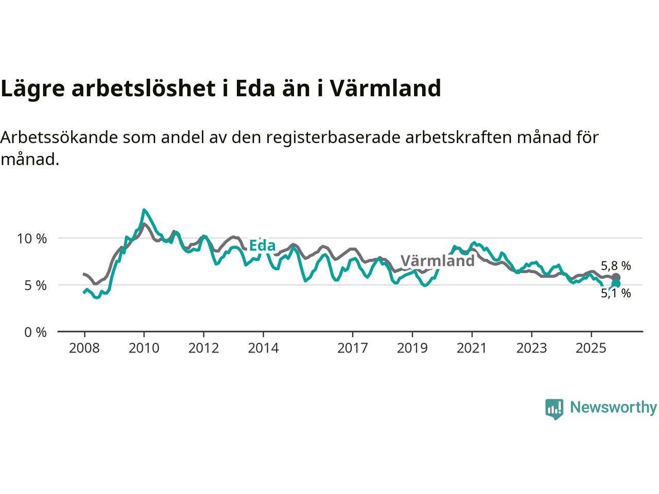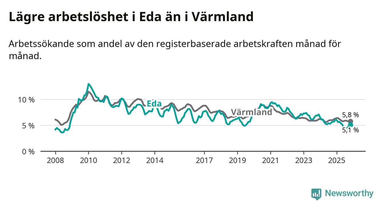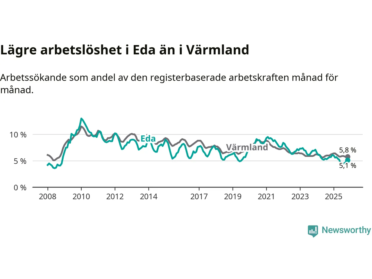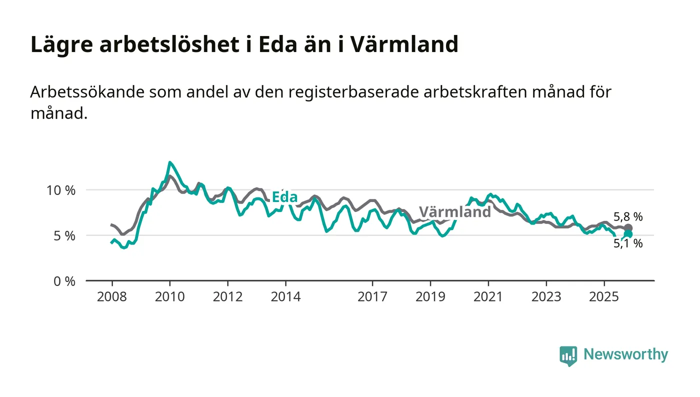 Det är 23:e månaden i följd som arbetslösheten i Eda är lägre än den var under samma tidpunkt året innan. Sedan december 2023 har arbetslösheten gått ner från 7,1 till 5,1 procent.