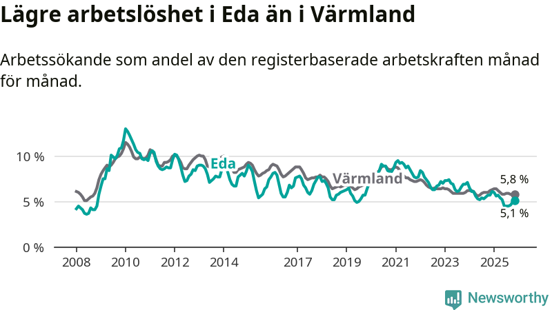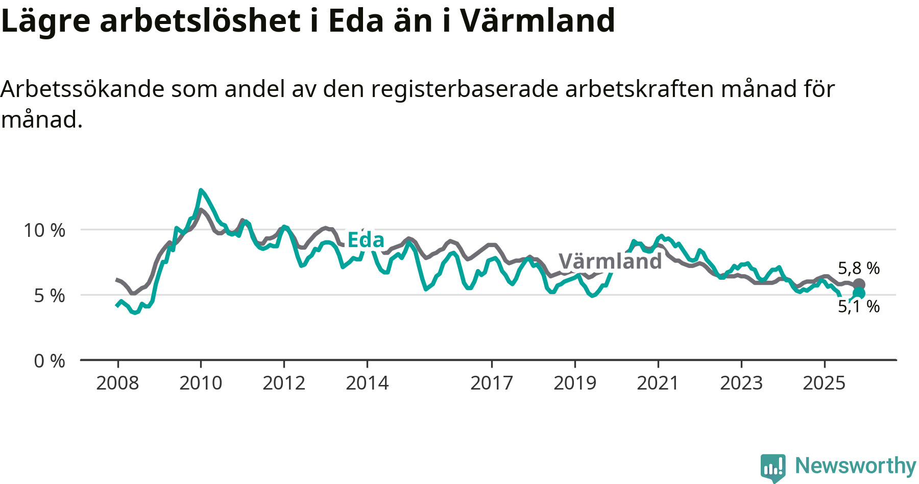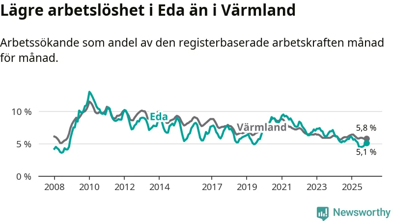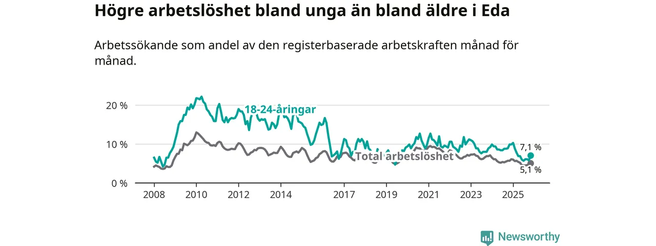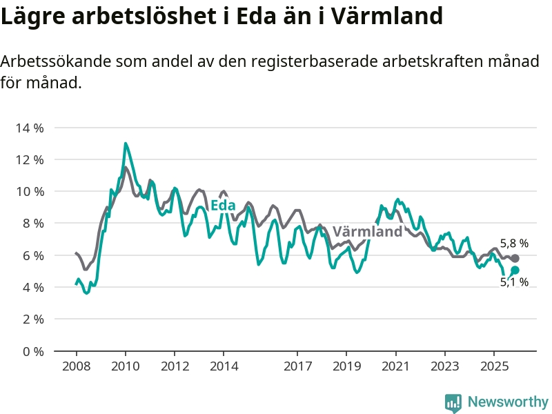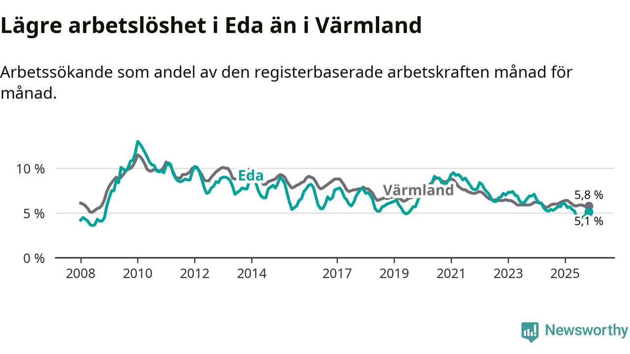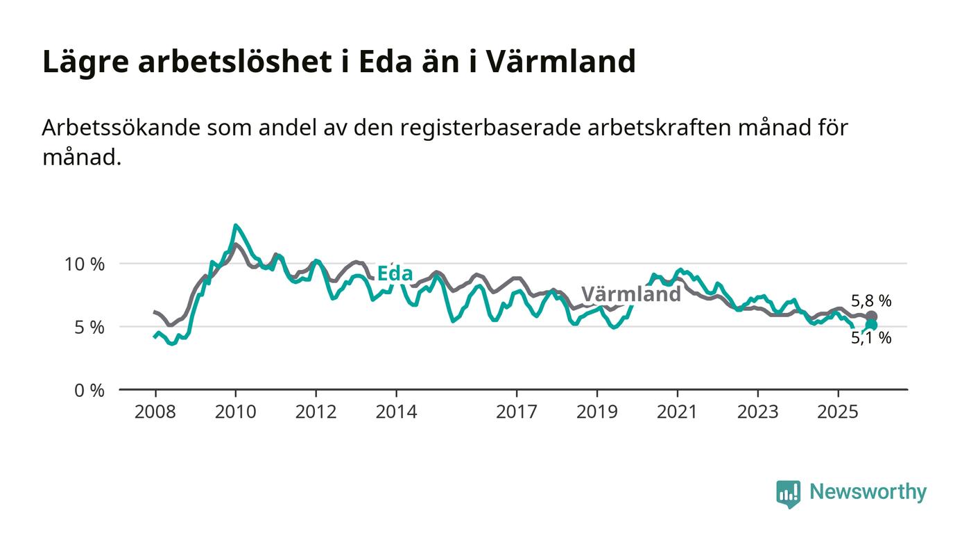 Det är 23:e månaden i följd som arbetslösheten i Eda är lägre än den var under samma tidpunkt året innan. Sedan december 2023 har arbetslösheten gått ner från 7,1 till 5,1 procent.