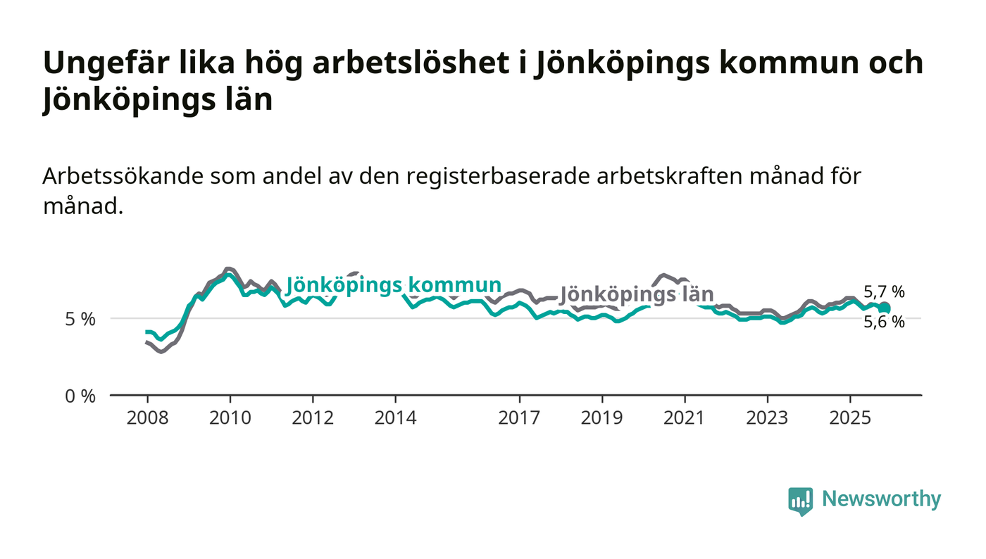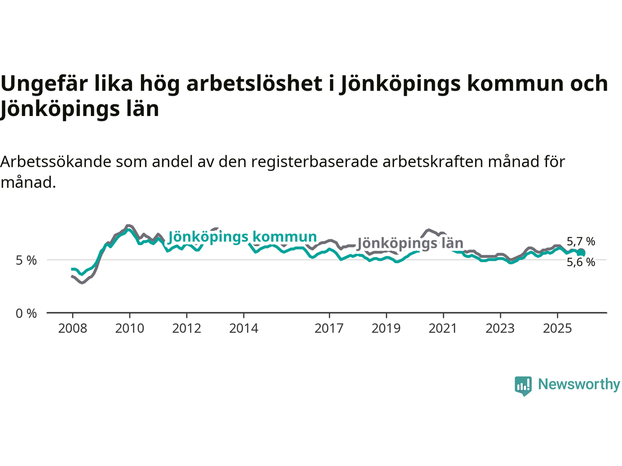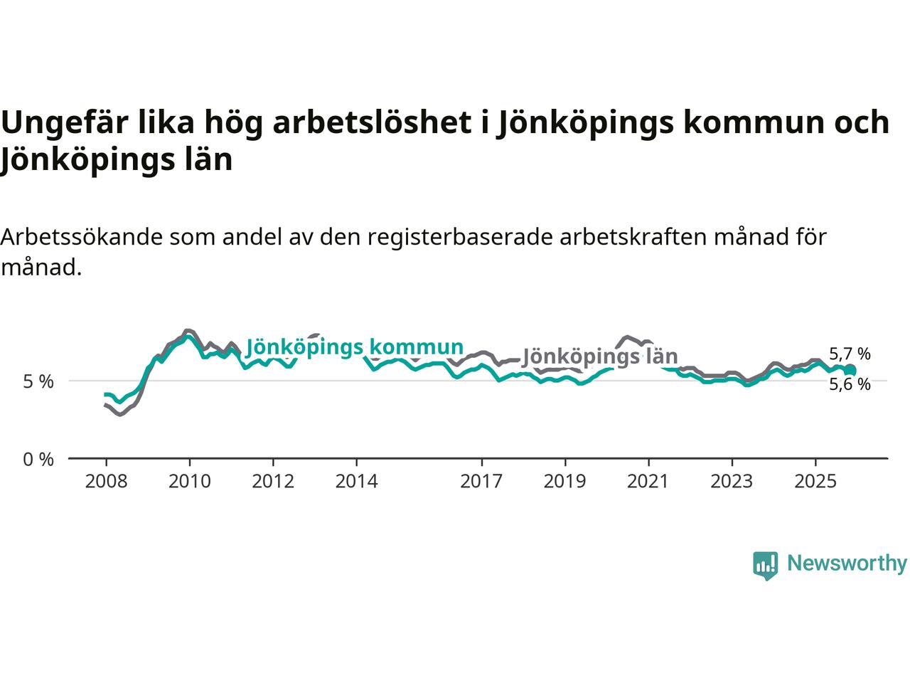 Under november månad rapporterade Jönköpings kommun en total arbetslöshet på 5,6 procent. Det är en minskning jämfört med samma tidpunkt i fjol (−0,1 procentenheter). Även i Jönköpings län sjunker arbetslösheten .