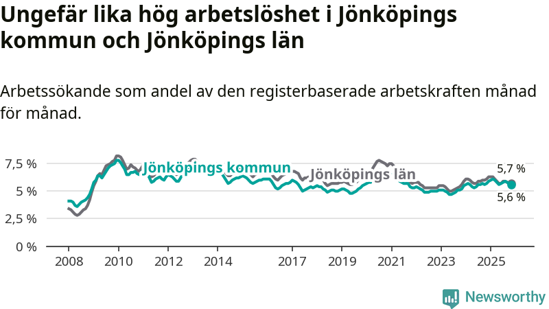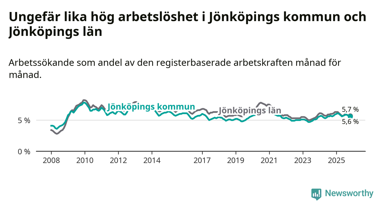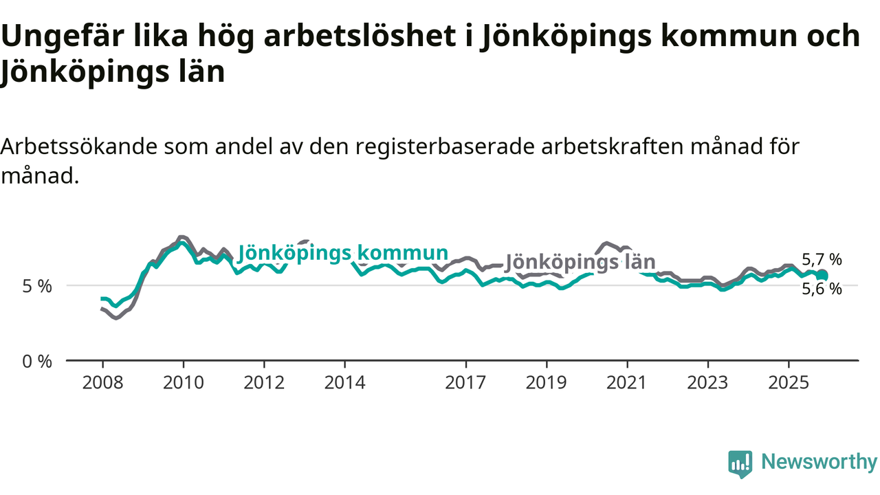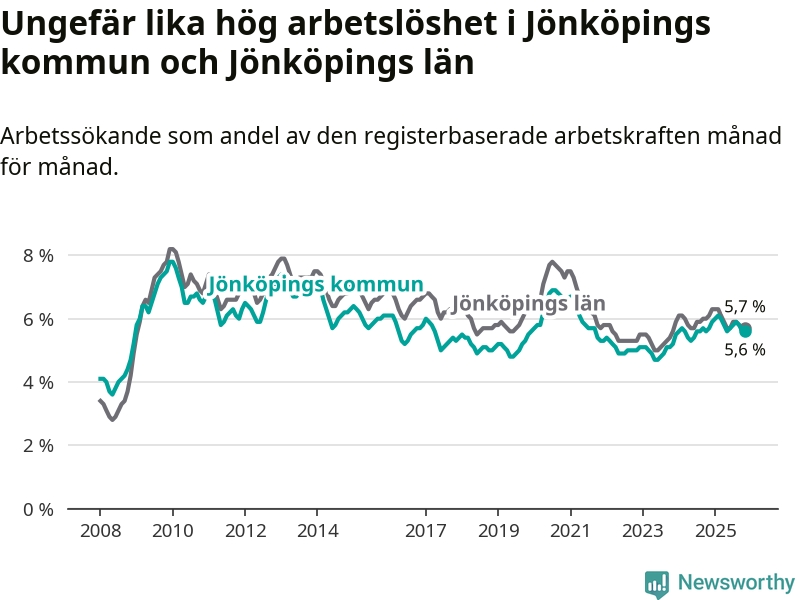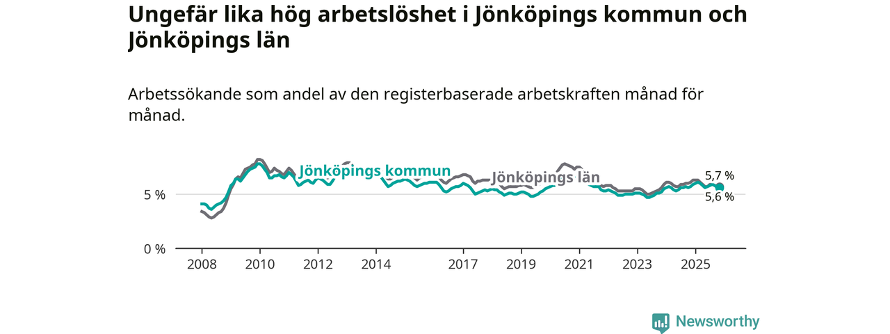 Under november månad rapporterade Jönköpings kommun en total arbetslöshet på 5,6 procent. Det är en minskning jämfört med samma tidpunkt i fjol (−0,1 procentenheter). Även i Jönköpings län sjunker arbetslösheten .
