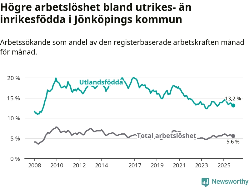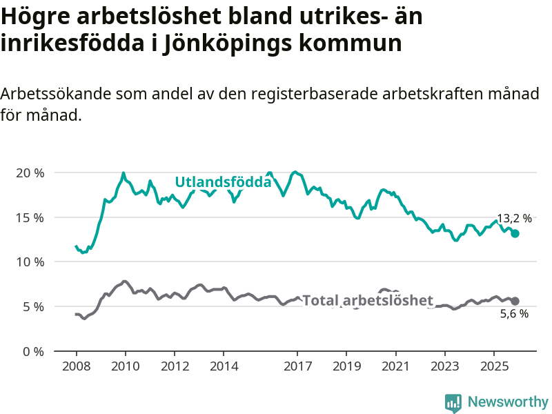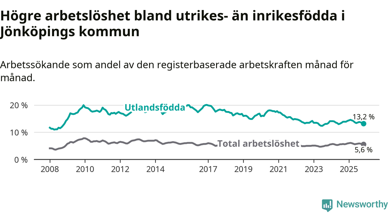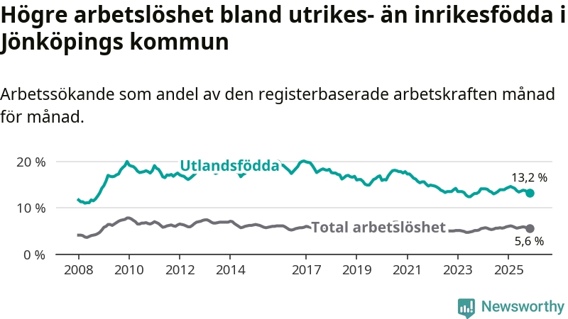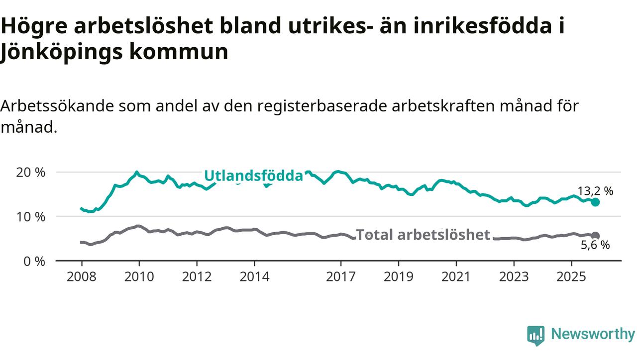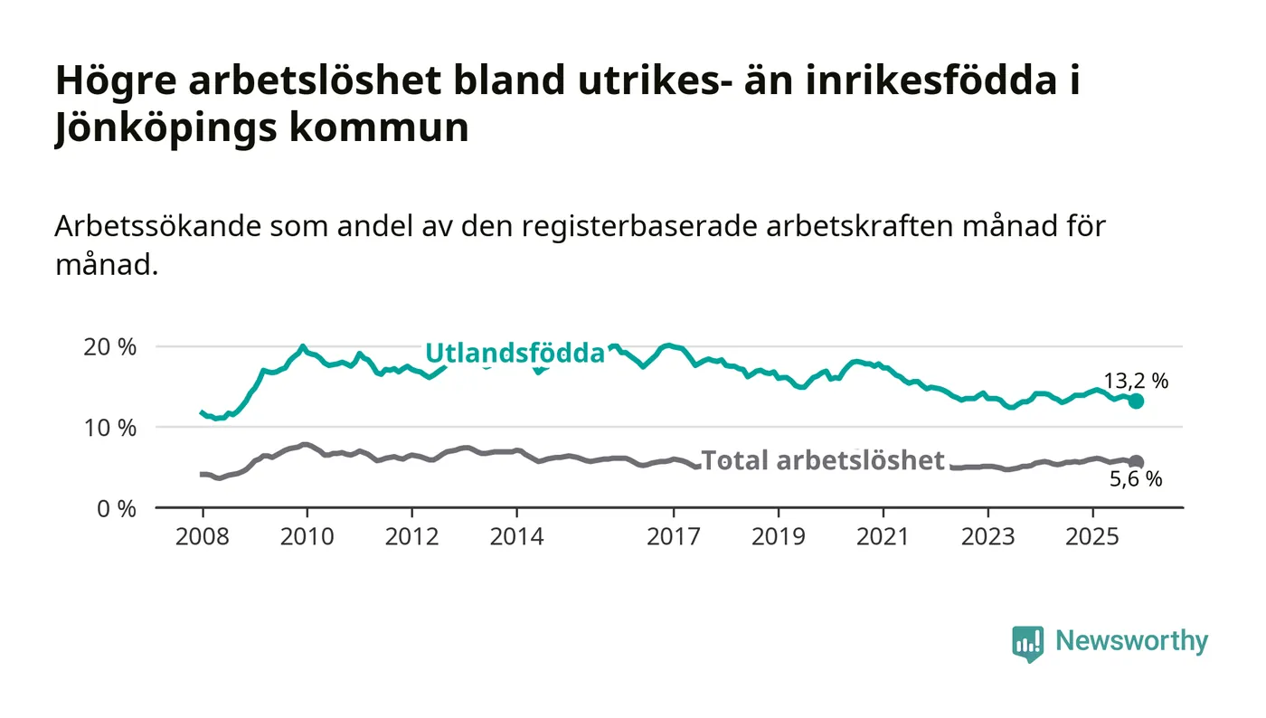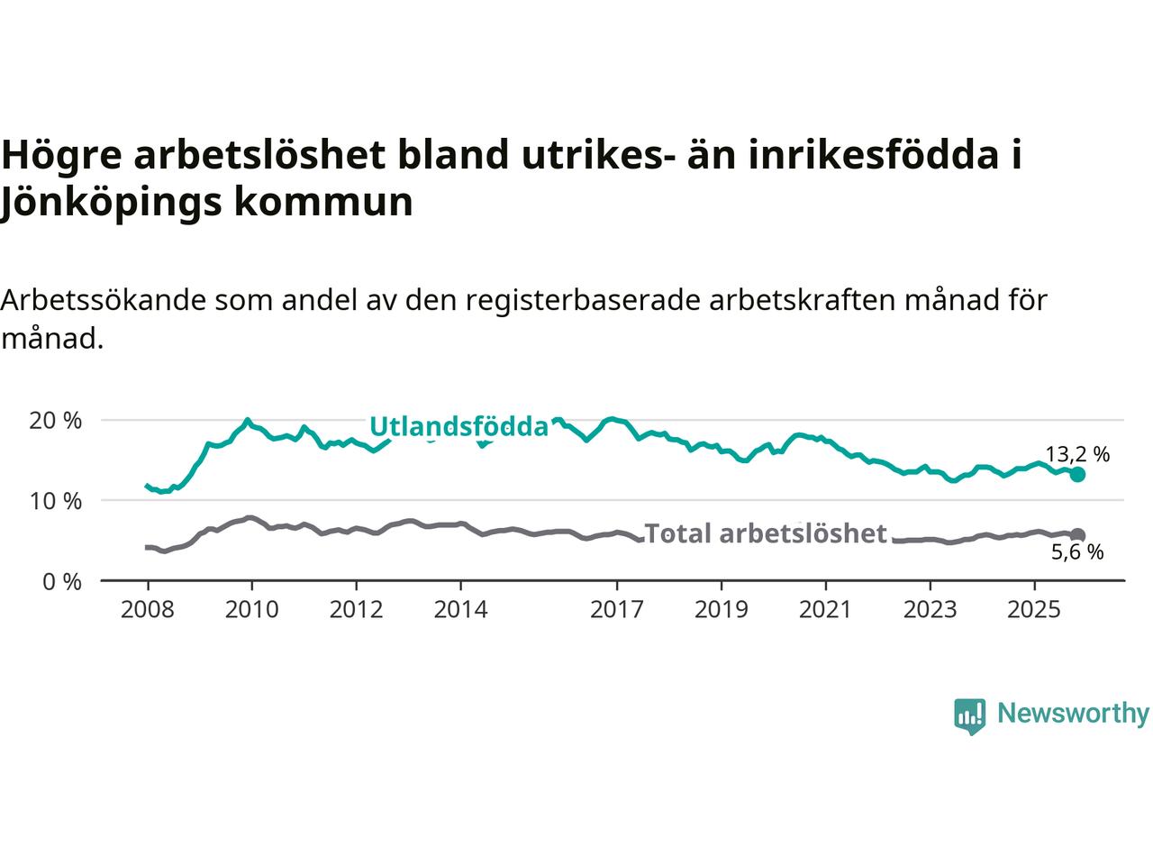 Skillnaden i arbetslöshet mellan utrikesfödda och hela befolkningen är 7,6 procentenheter i Jönköping. Det är en mindre skillnad än för ett år sedan (−0,6 procentenheter).