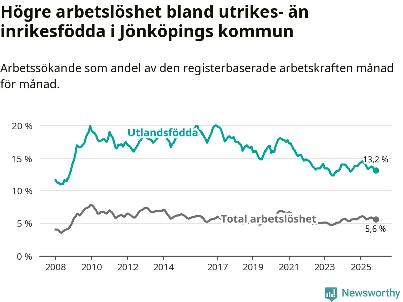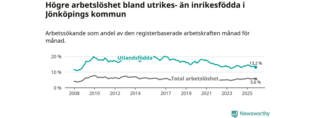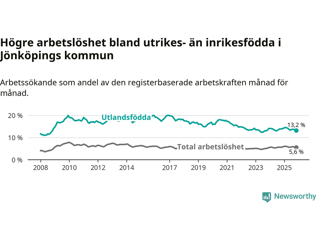 Arbetslösheten bland utlandsfödda var 13,2 procent i Jönköping under november månad, motsvarande 2 443 av 18 508 personer. Det är 0,7 procentenheter färre än vid samma tidpunkt i fjol (−66 om man räknar personer).