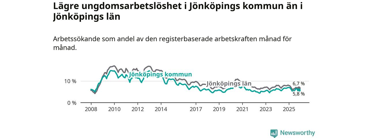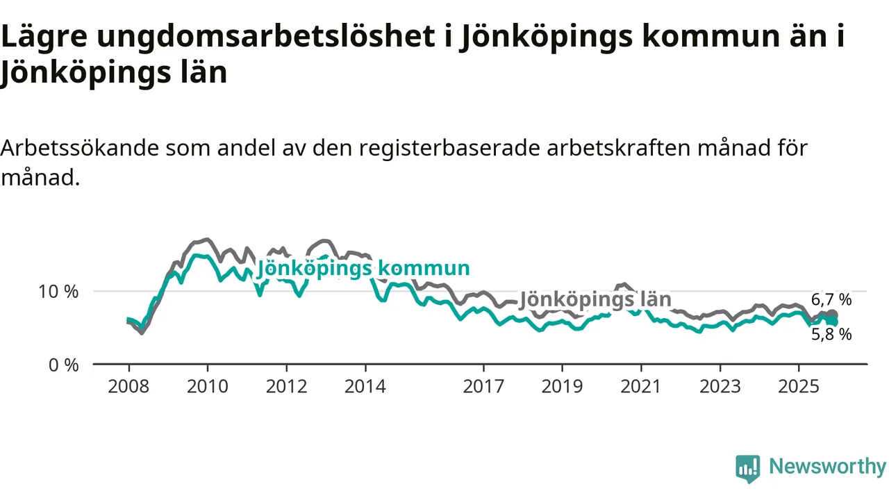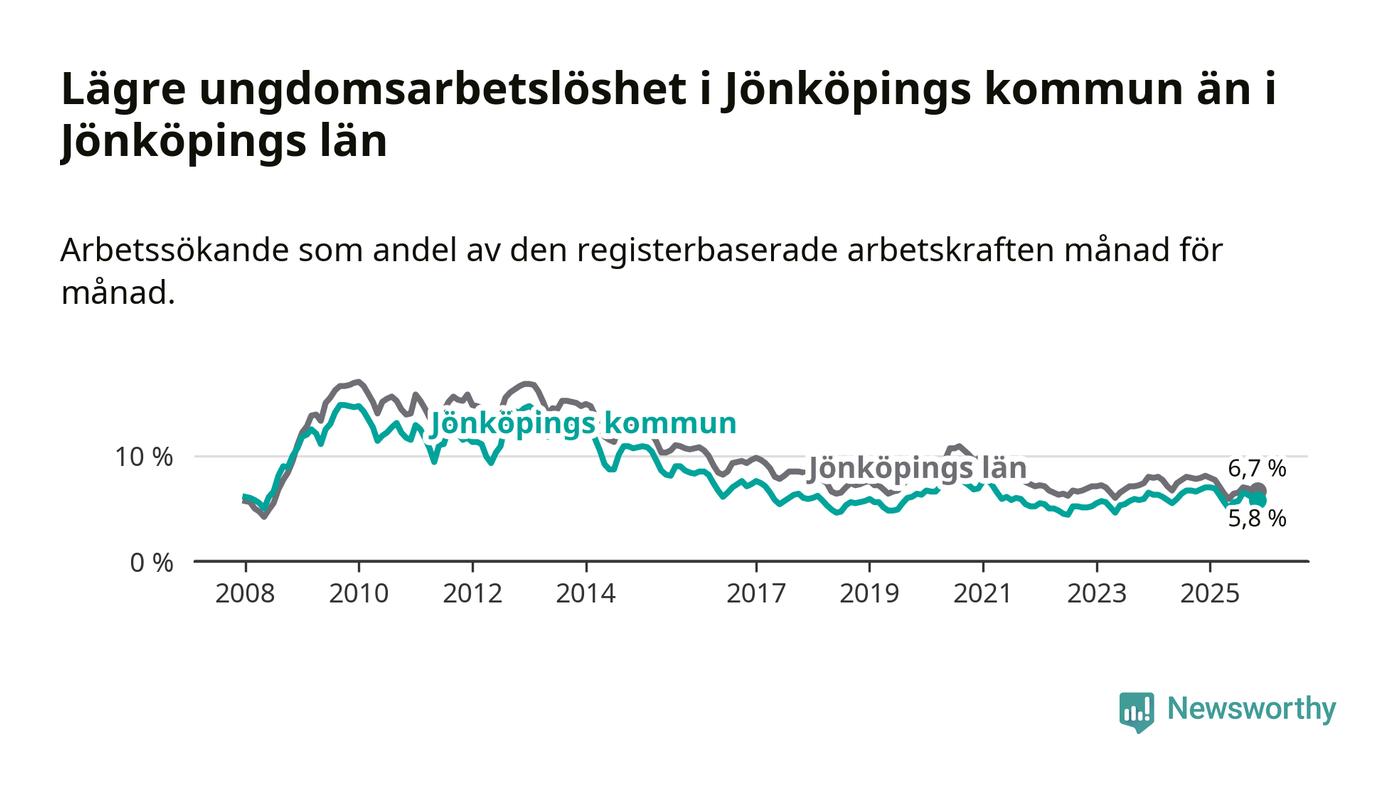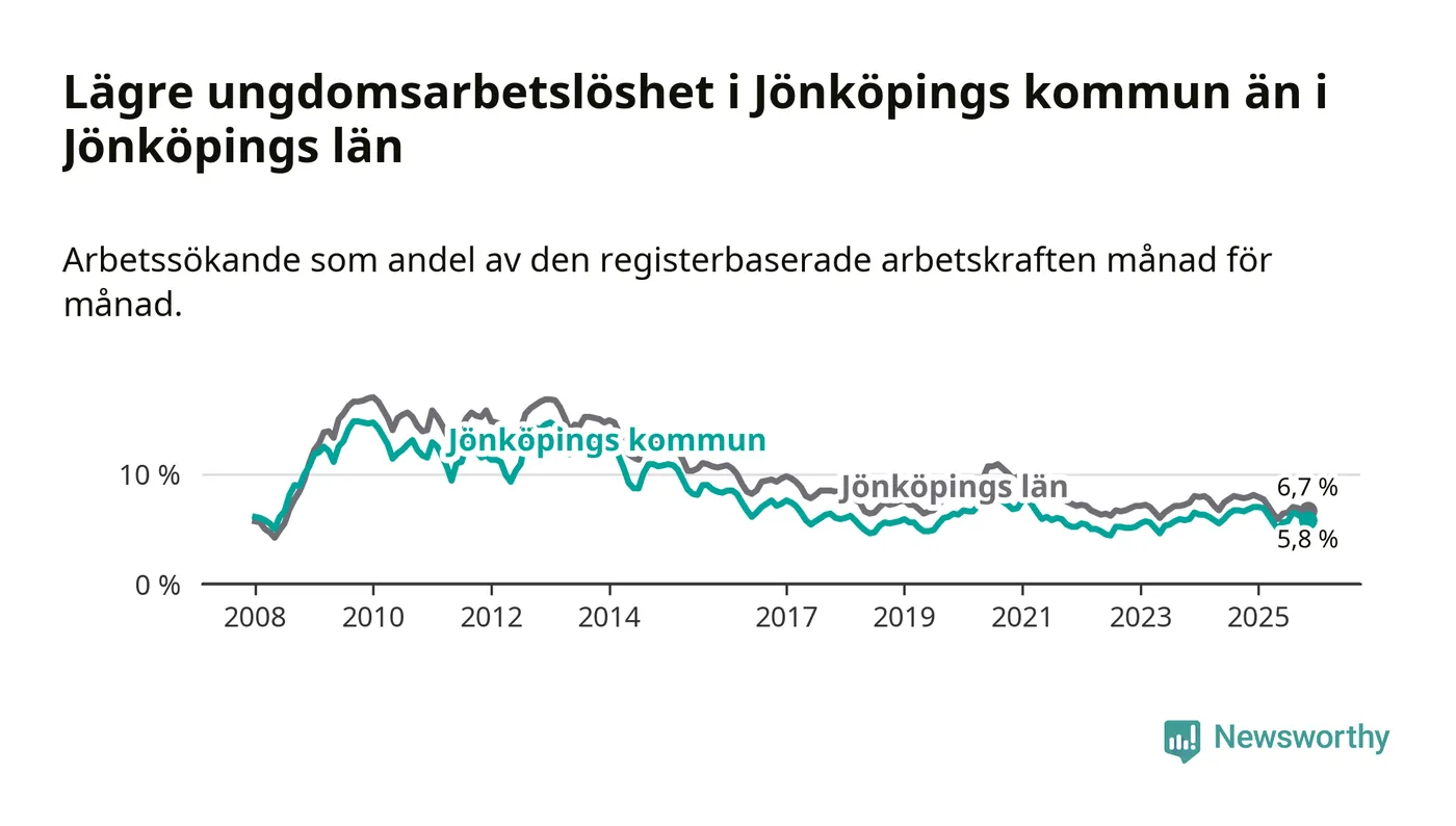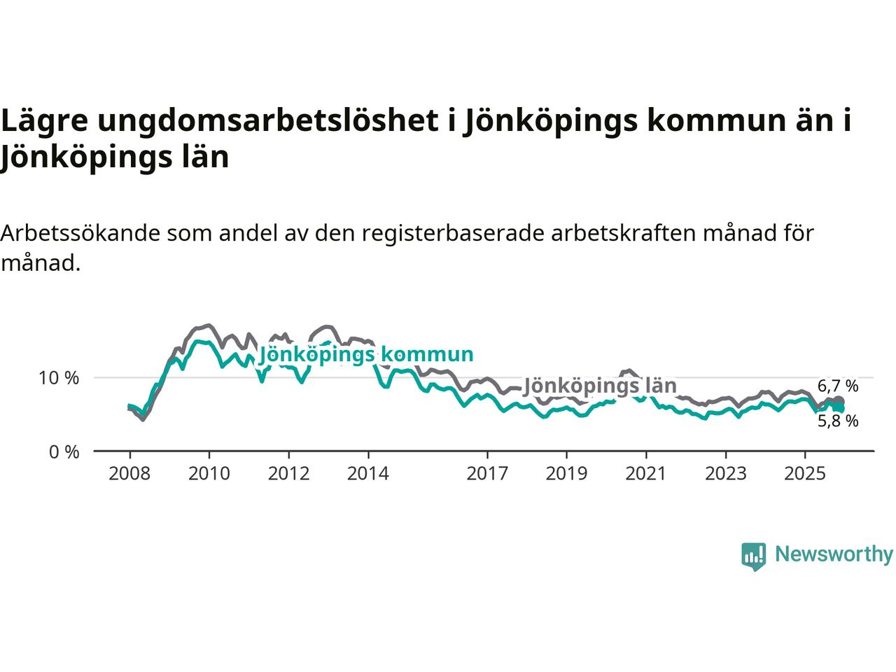 Medan Jönköping har ungefär samma total arbetslöshet som Jönköpings län, ligger ungdomsarbetslösheten 0,9 procentenheter lägre i Jönköping.