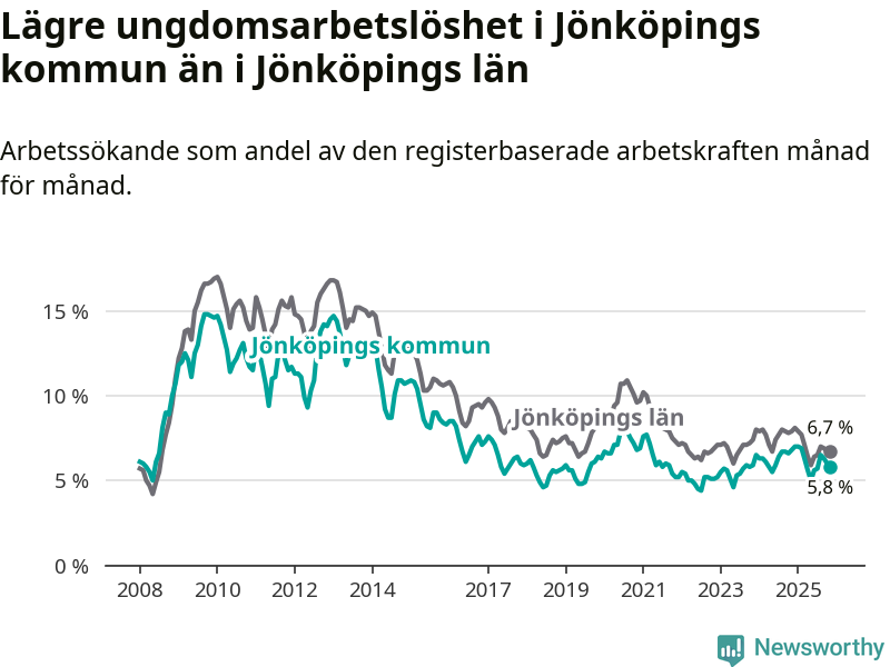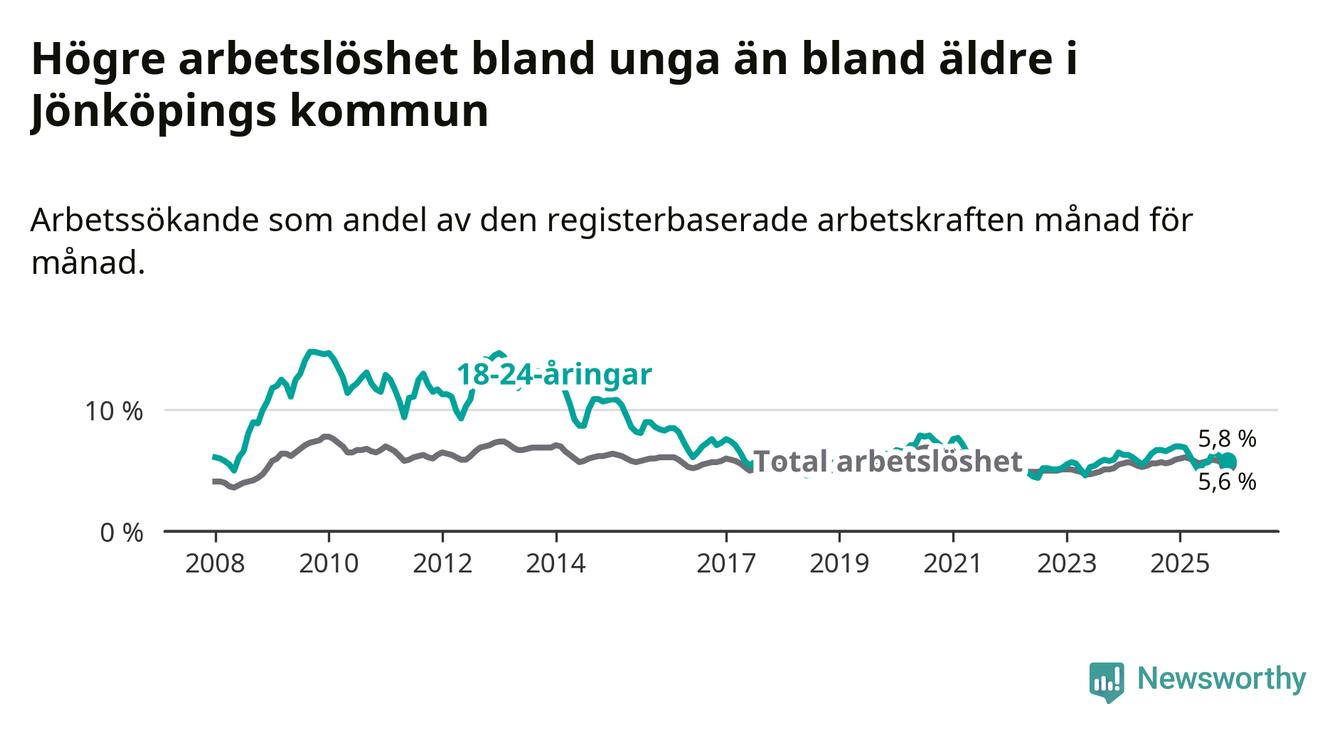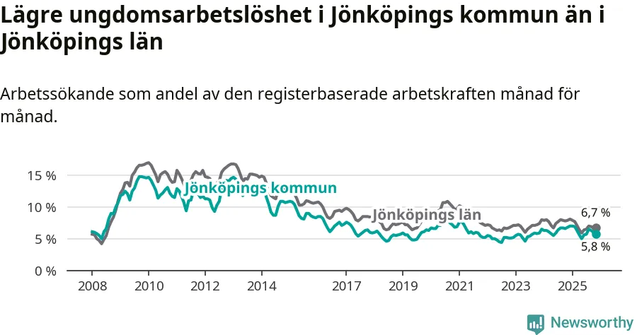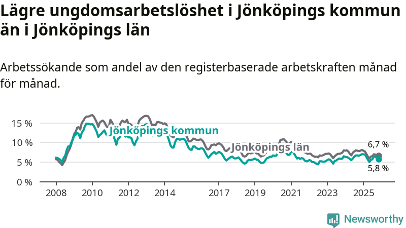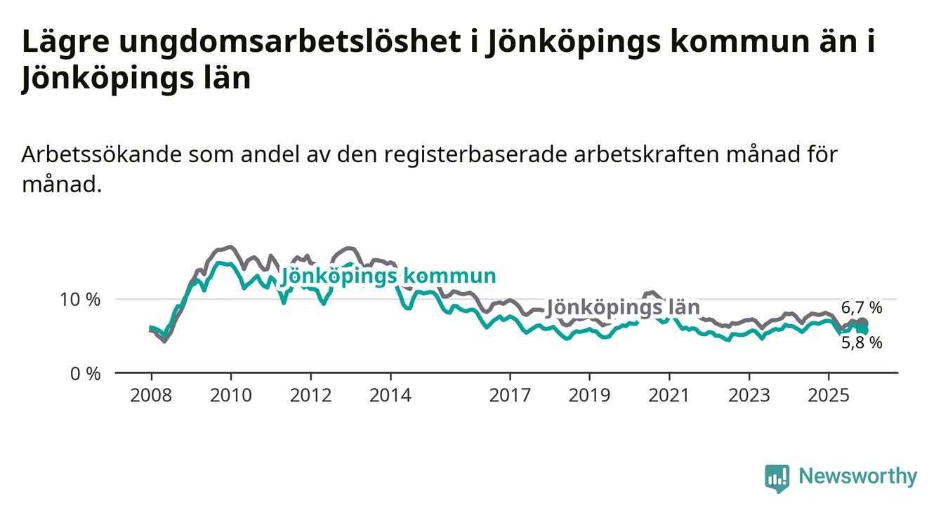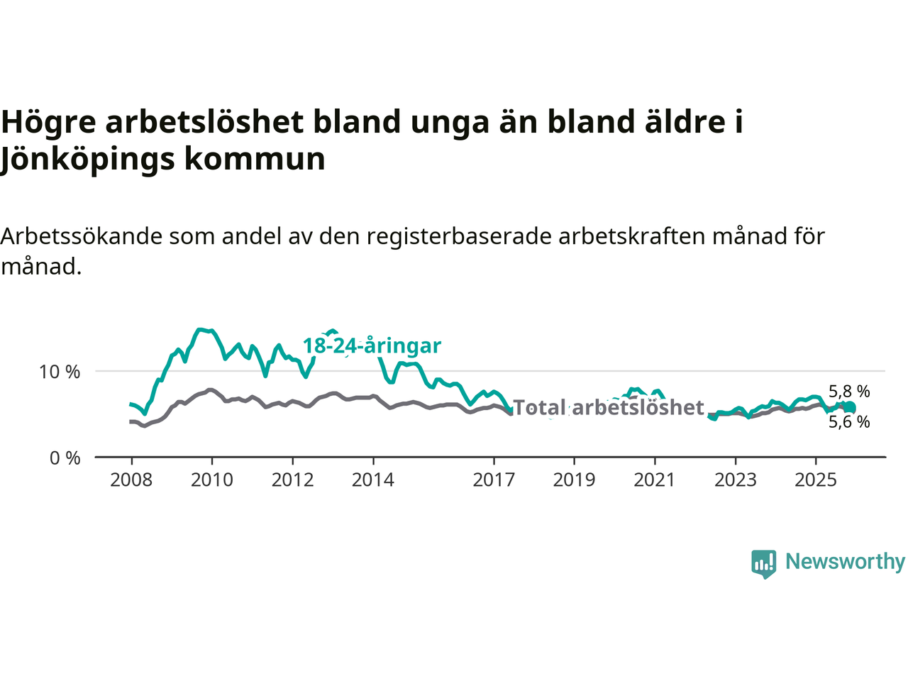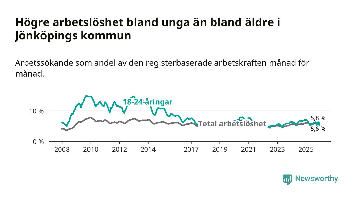 Medan Jönköping har ungefär samma total arbetslöshet som Jönköpings län, ligger ungdomsarbetslösheten 0,9 procentenheter lägre i Jönköping.
