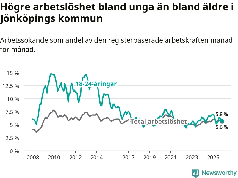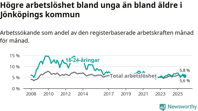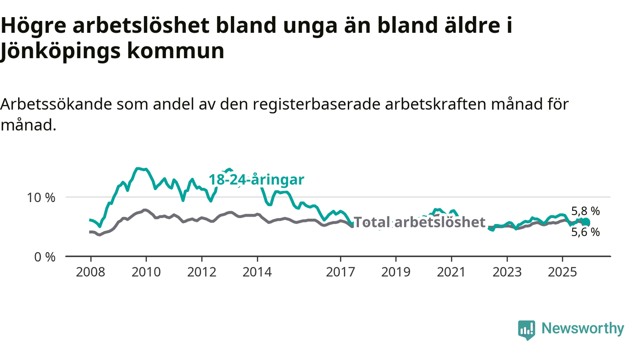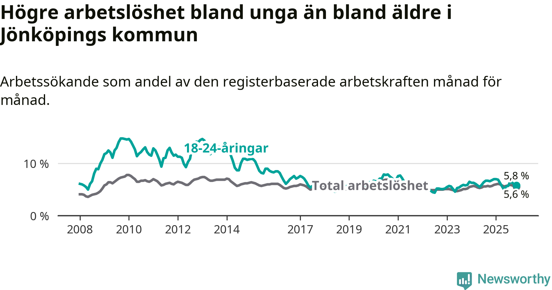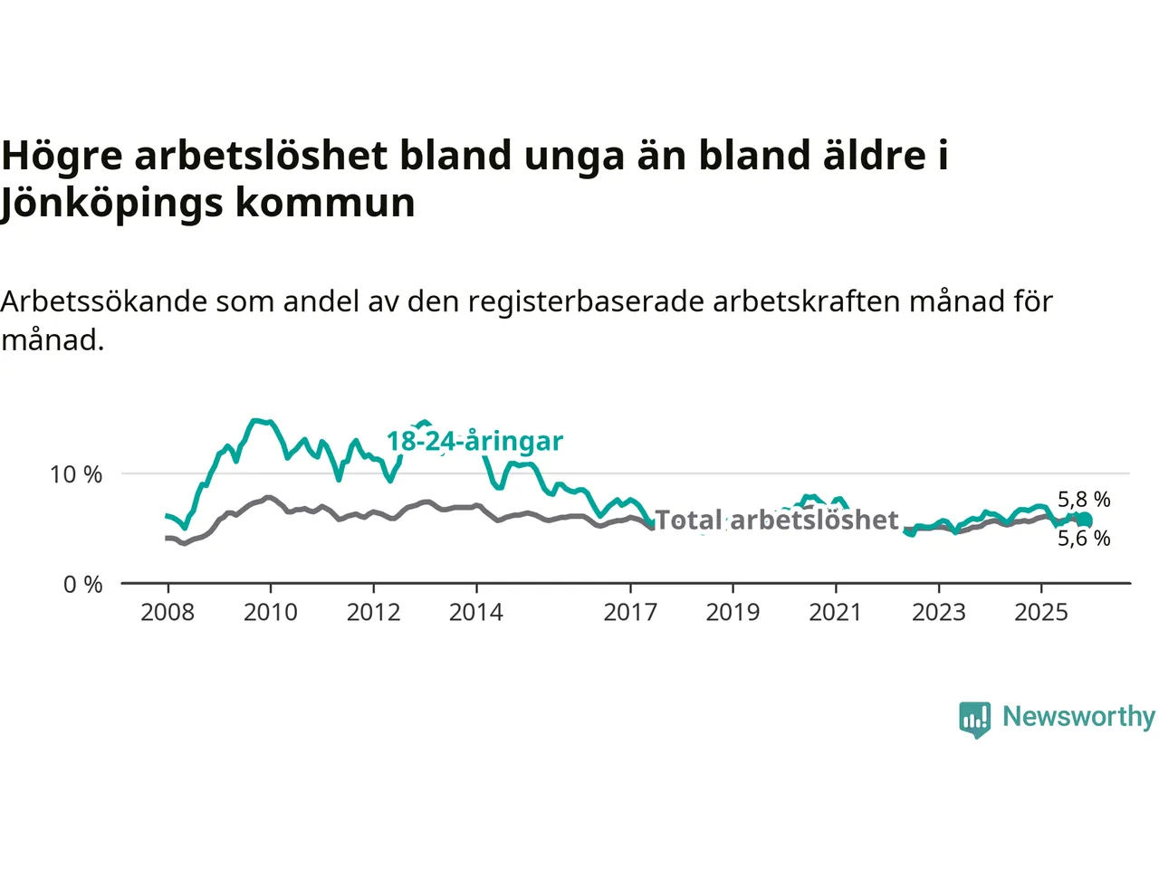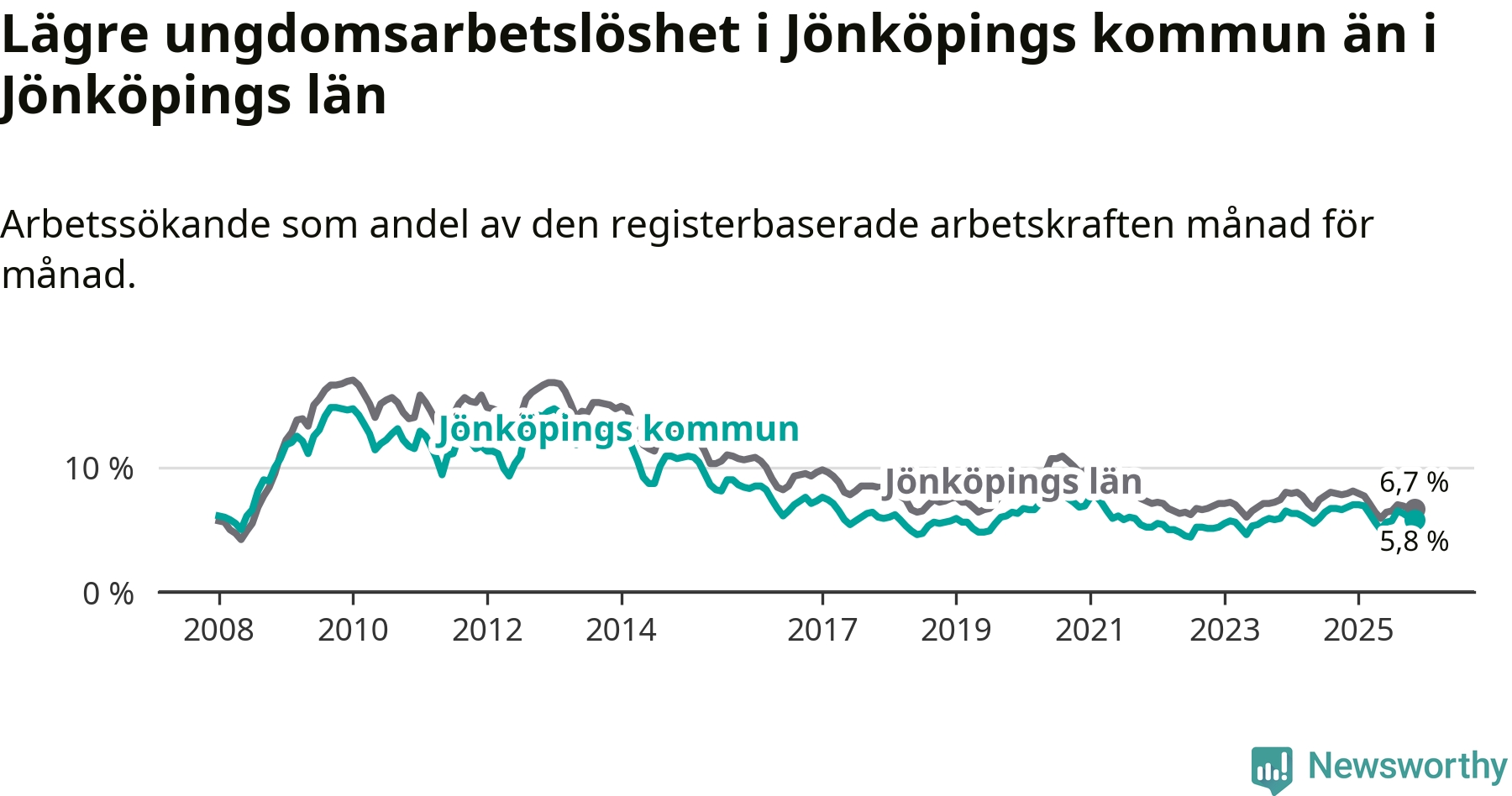 Medan Jönköping har ungefär samma total arbetslöshet som Jönköpings län, ligger ungdomsarbetslösheten 0,9 procentenheter lägre i Jönköping.