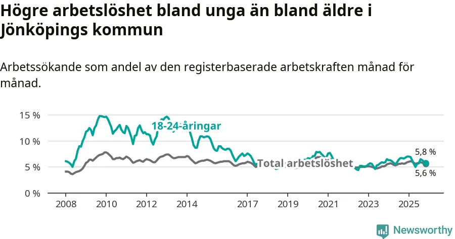 I och med den senaste månadens nedgång har de ungas arbetslöshet i Jönköping sjunkit åtta månader i följd (ner från 6,3 procent i mars till 5,8 procent nu).