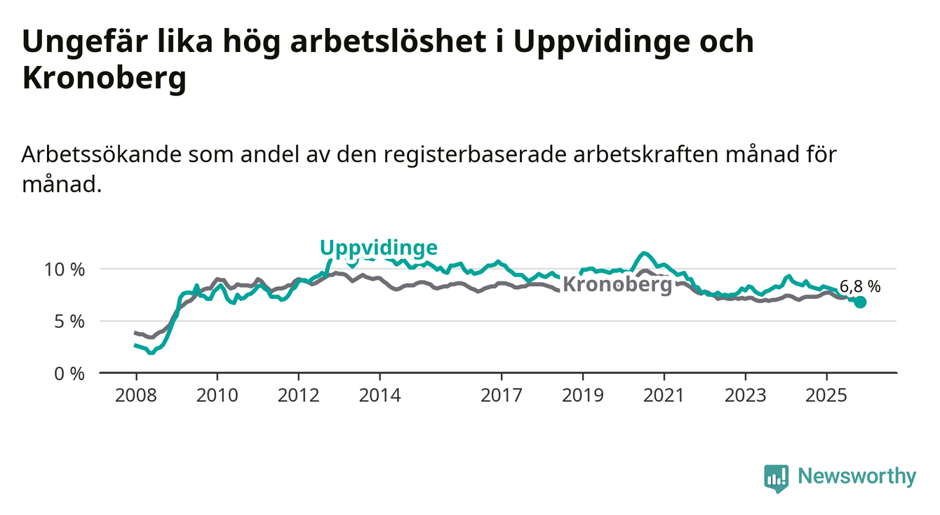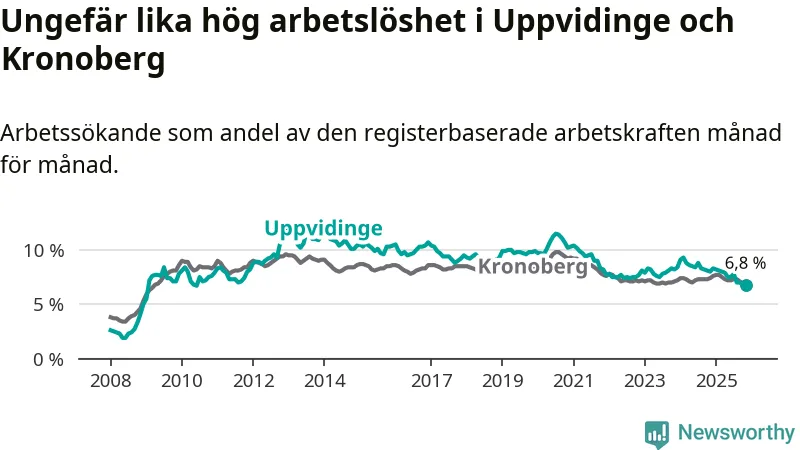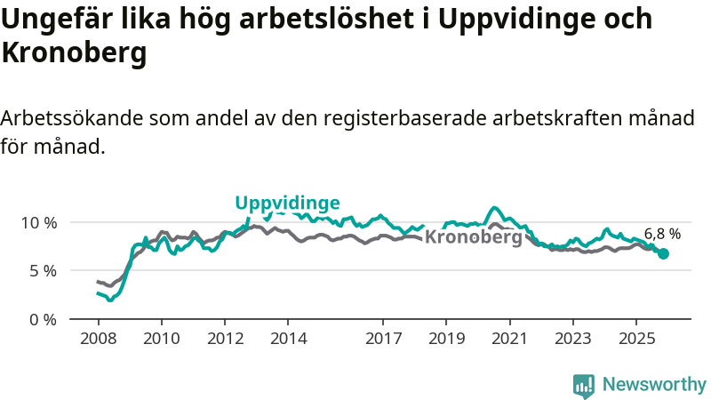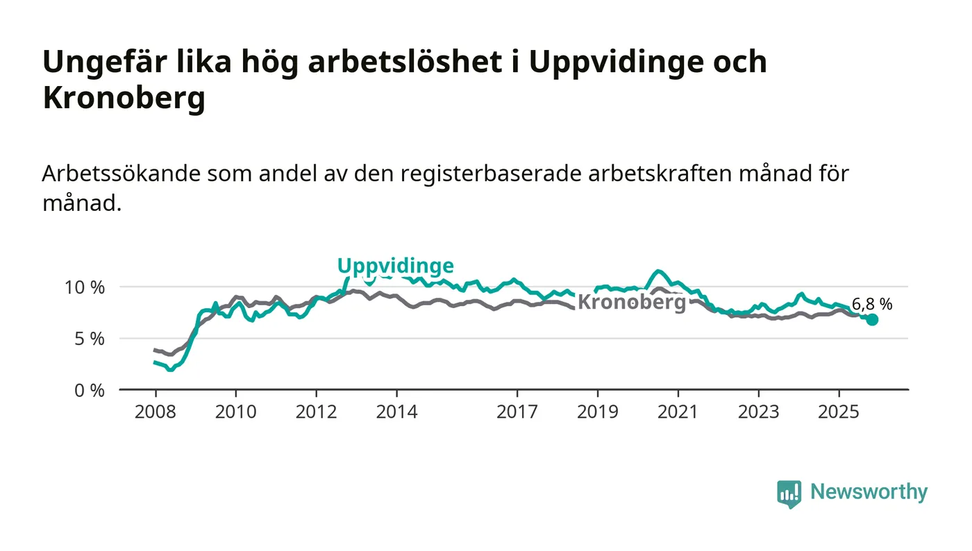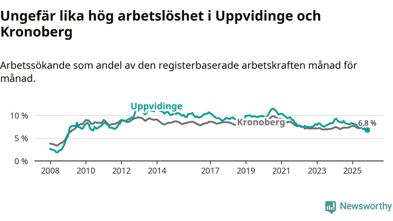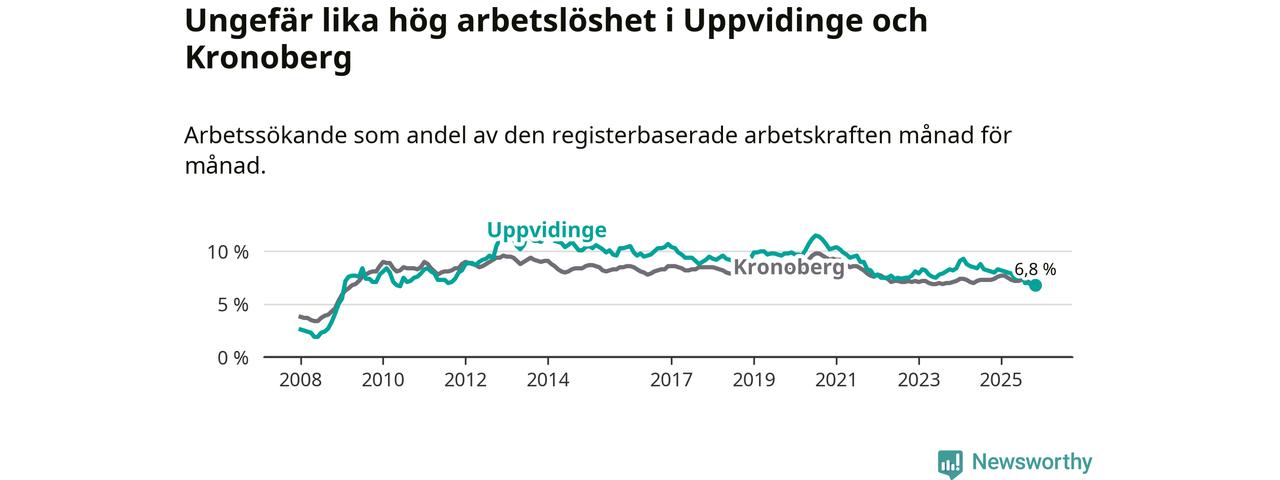 Det är 14:e månaden i följd som arbetslösheten i Uppvidinge är lägre än den var under samma tidpunkt året innan. Sedan september 2024 har arbetslösheten gått ner från 8,2 till 6,8 procent.