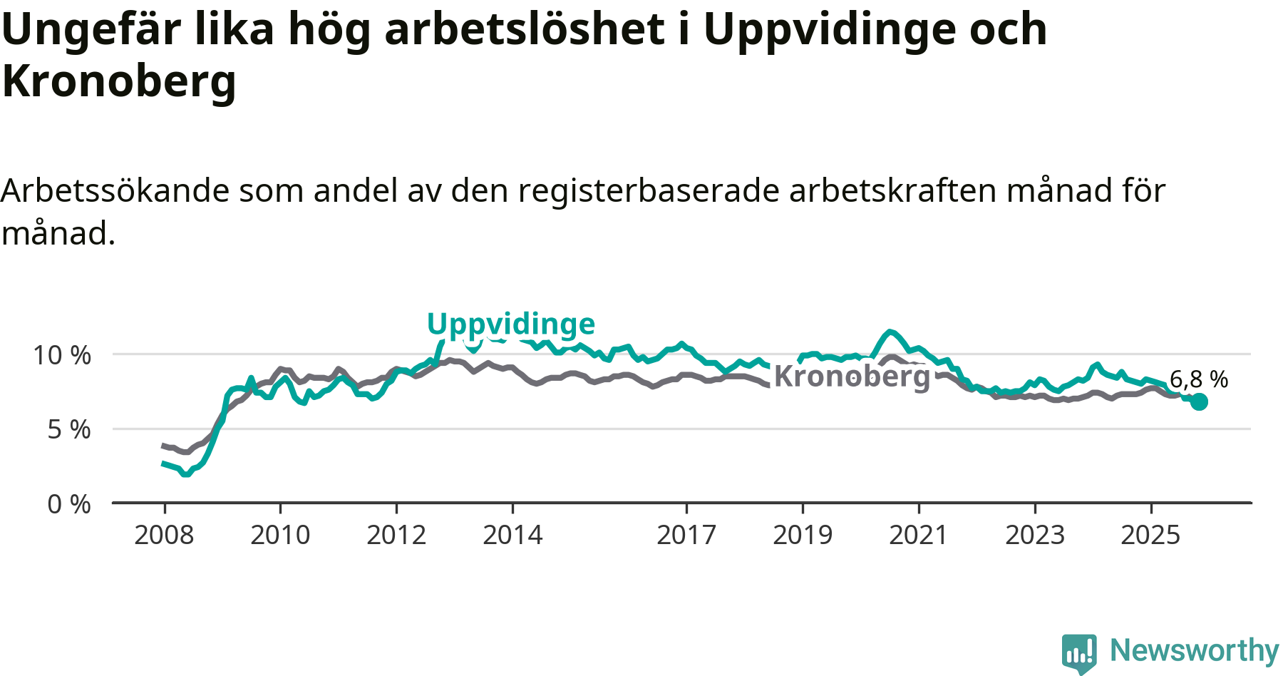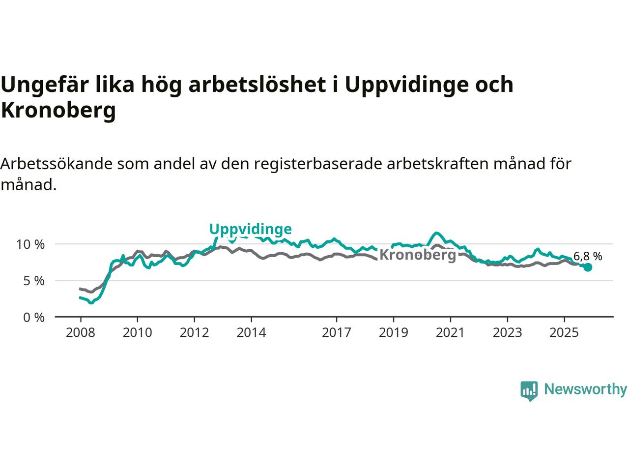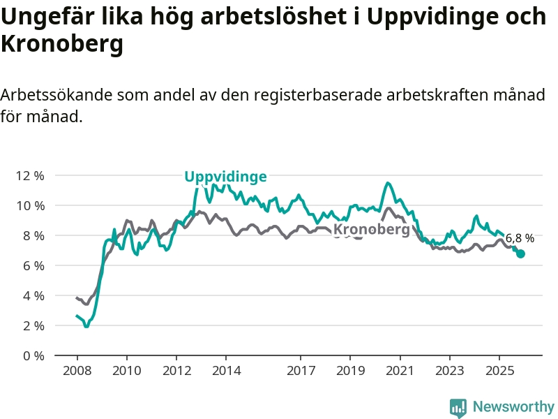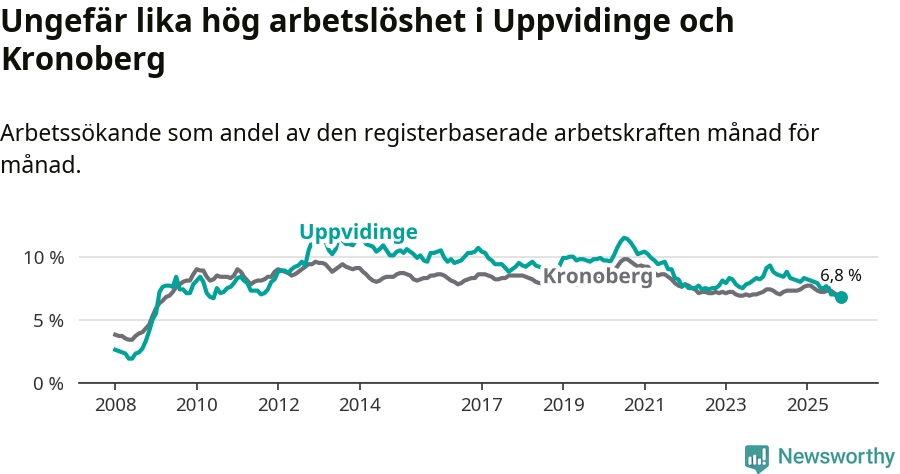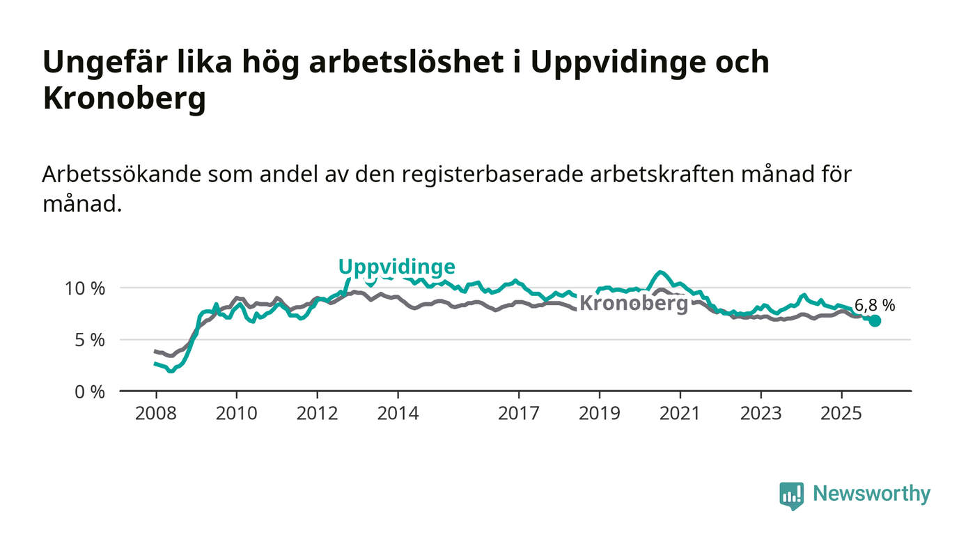 Det är 14:e månaden i följd som arbetslösheten i Uppvidinge är lägre än den var under samma tidpunkt året innan. Sedan september 2024 har arbetslösheten gått ner från 8,2 till 6,8 procent.