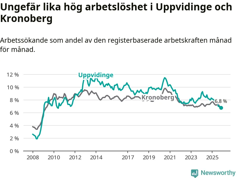 Under november månad rapporterade Uppvidinge kommun en total arbetslöshet på 6,8 procent. Det är en minskning jämfört med samma tidpunkt i fjol (−1,2 procentenheter). Även i Kronobergs län sjunker arbetslösheten .