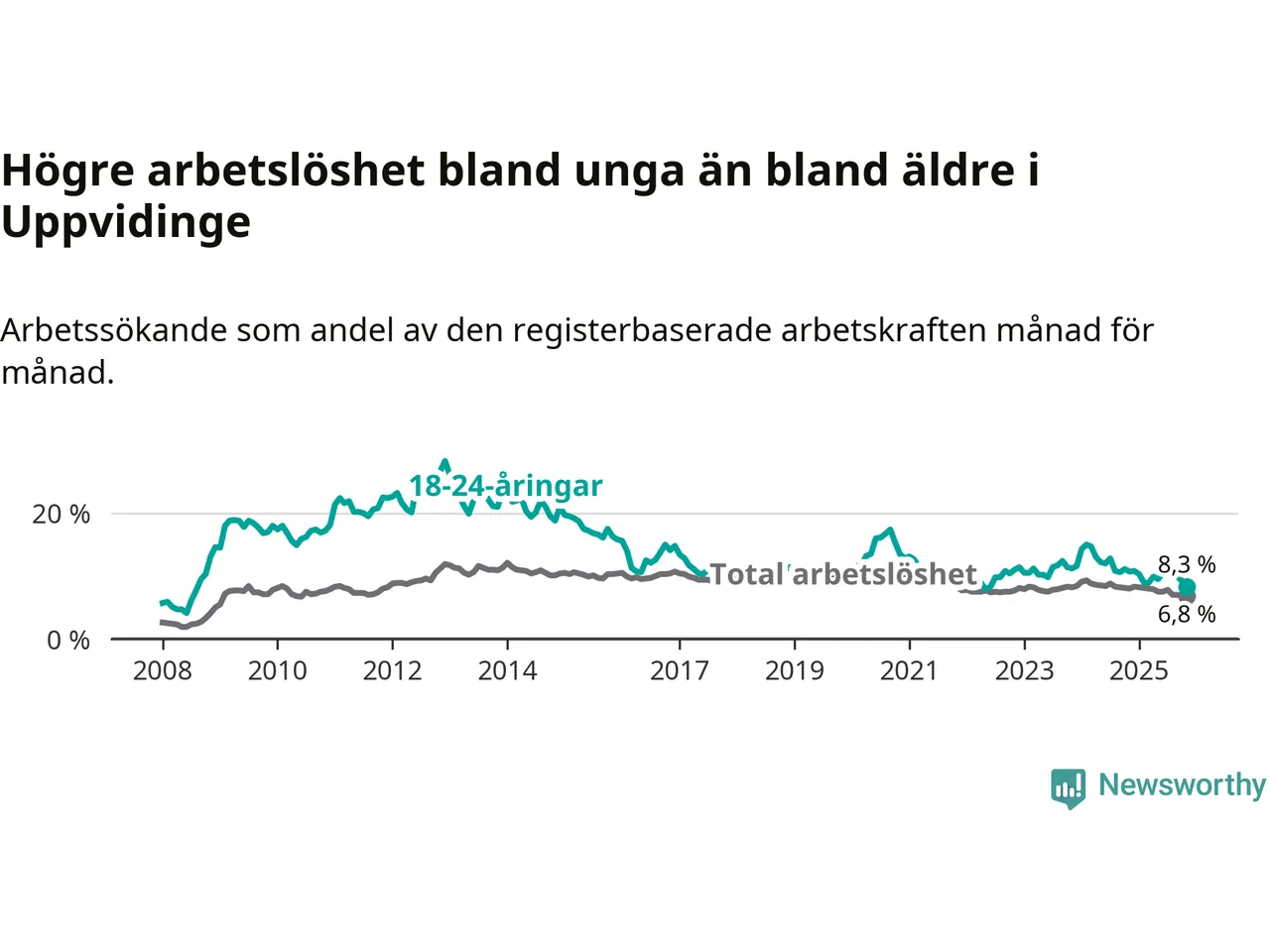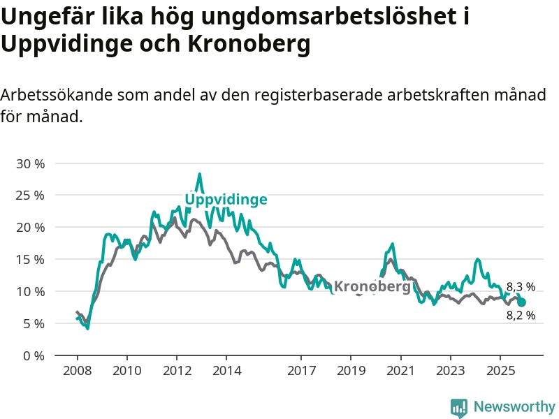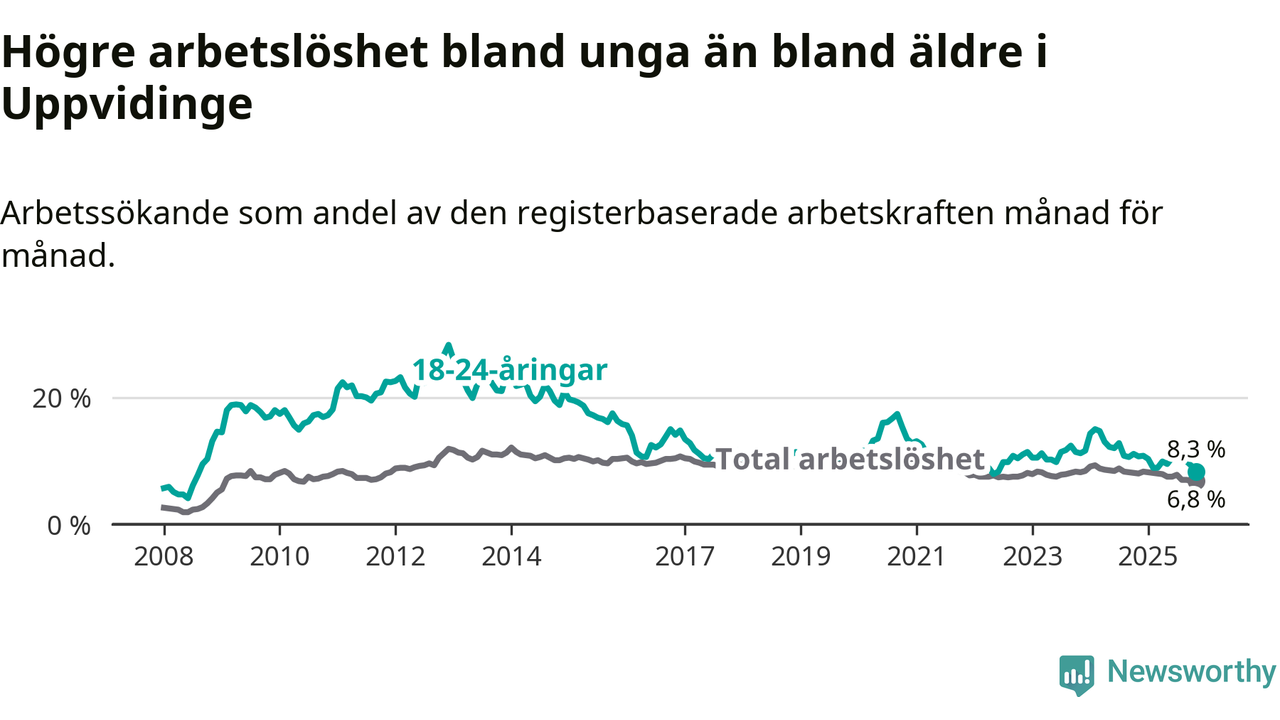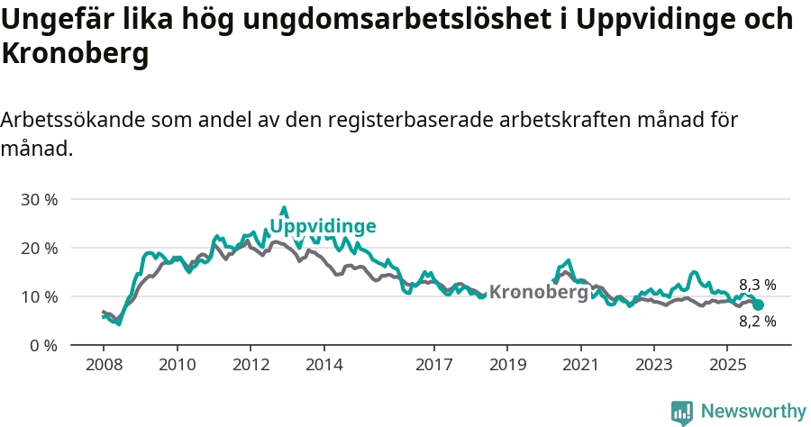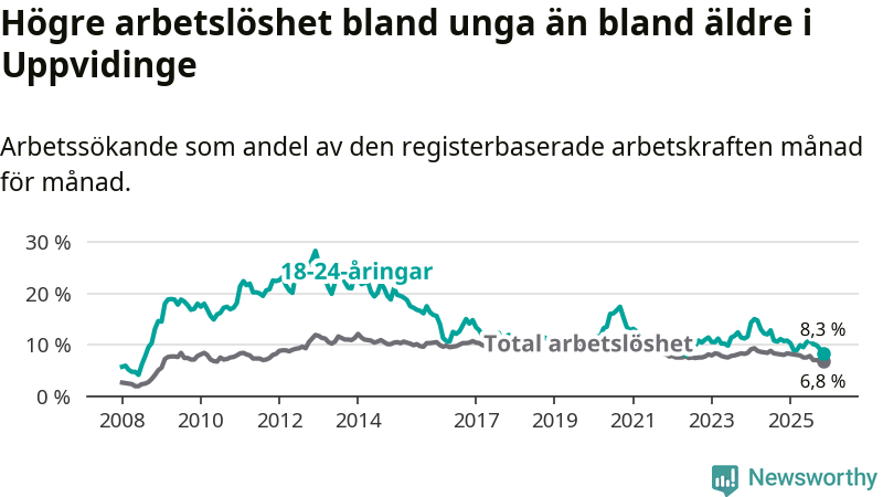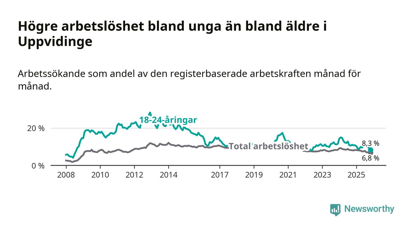 I och med den senaste månadens nedgång har de ungas arbetslöshet i Uppvidinge sjunkit 16 månader i följd (ner från 12,8 procent i juli 2024 till 8,3 procent nu). Den nuvarande arbetslöshetsnivån är den lägsta sedan juni 2022.