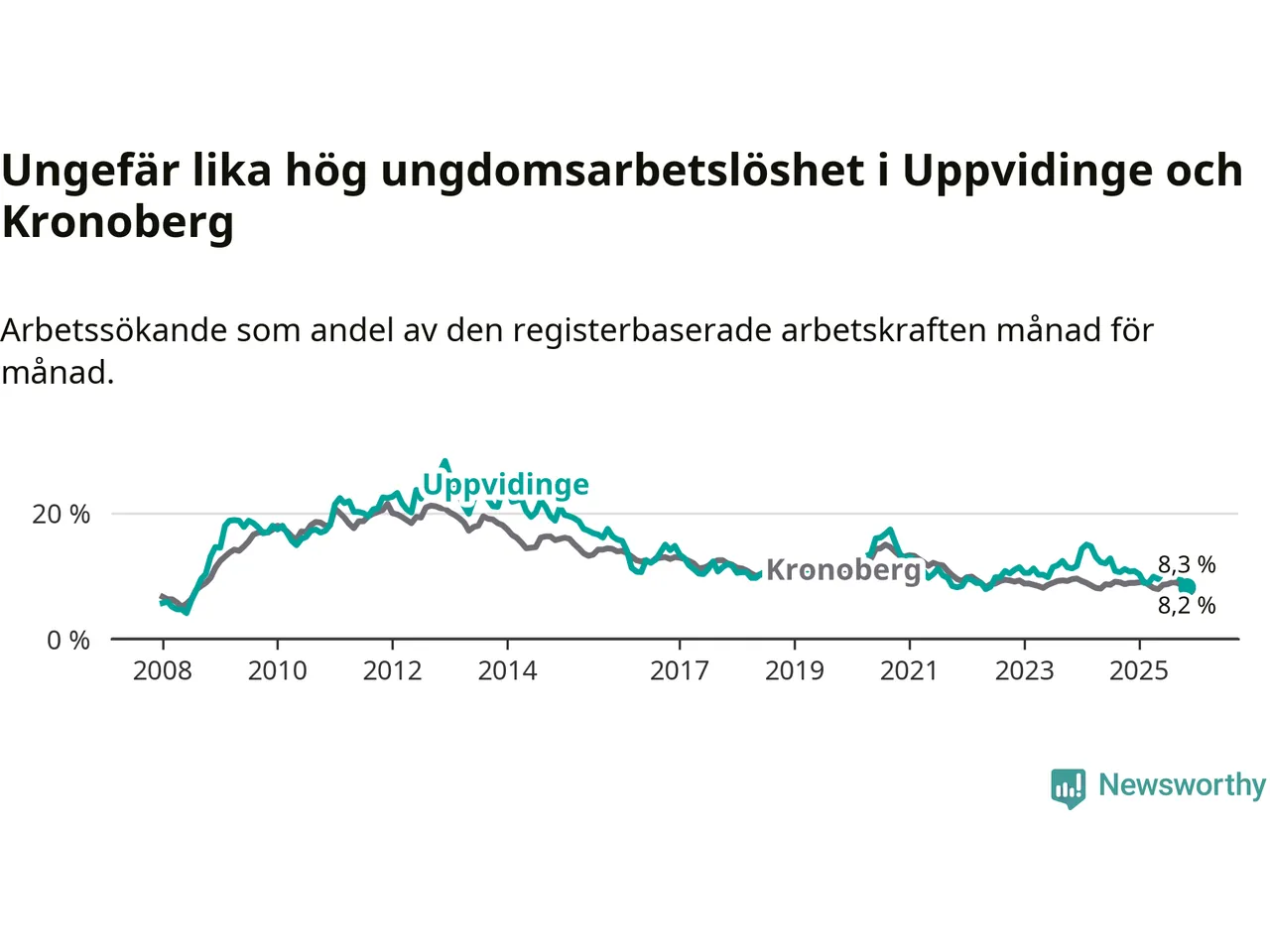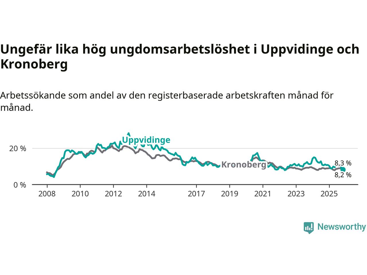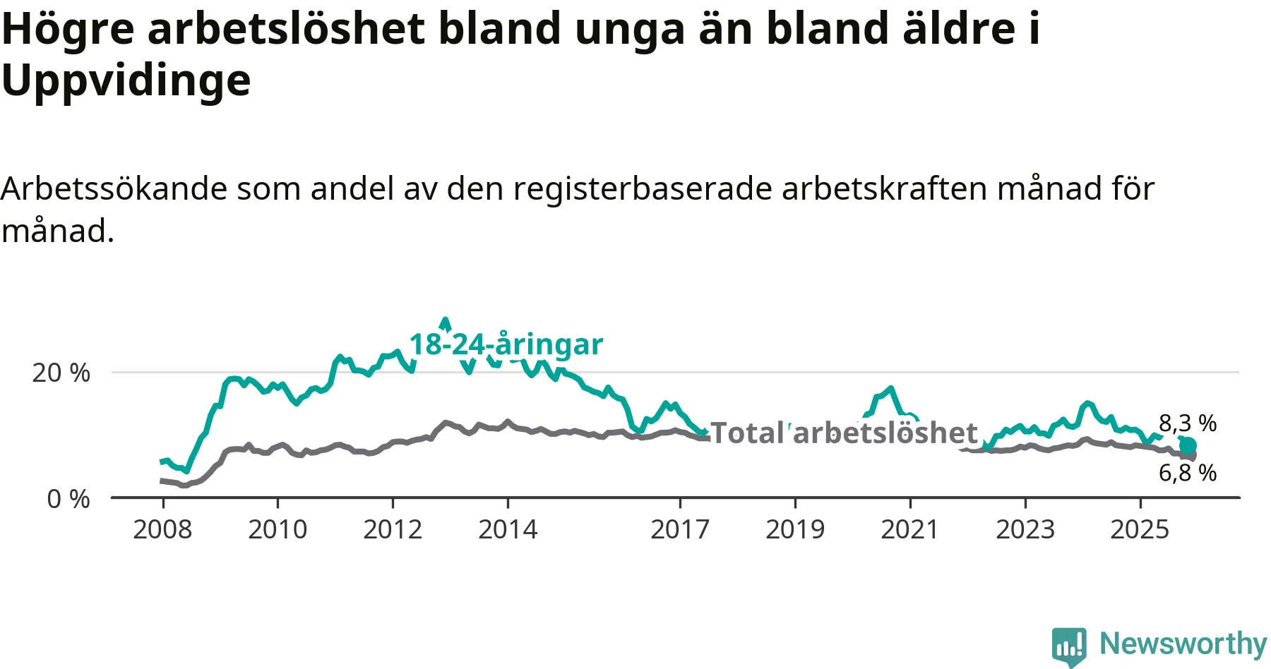 I och med den senaste månadens nedgång har de ungas arbetslöshet i Uppvidinge sjunkit 16 månader i följd (ner från 12,8 procent i juli 2024 till 8,3 procent nu). Den nuvarande arbetslöshetsnivån är den lägsta sedan juni 2022.