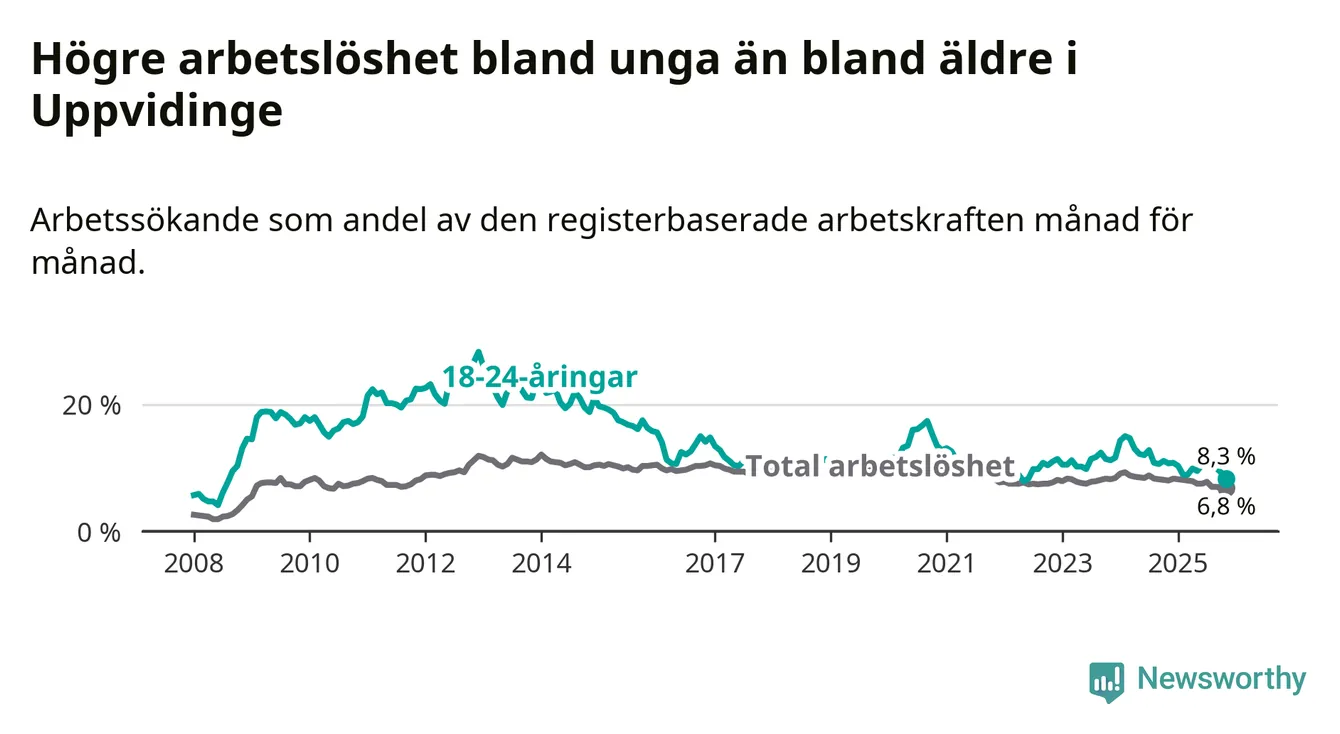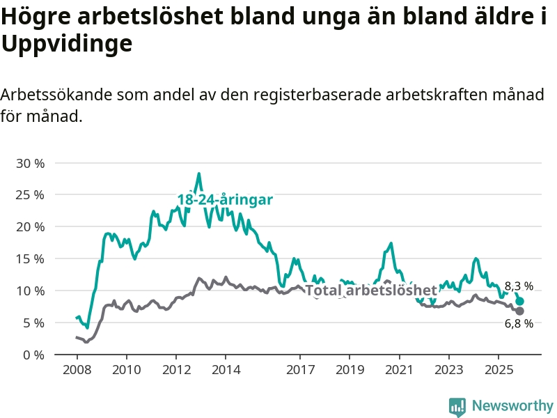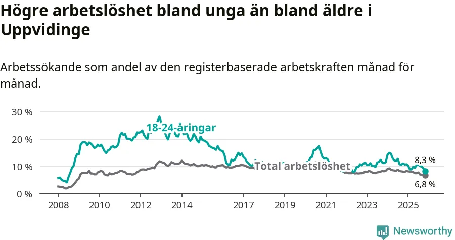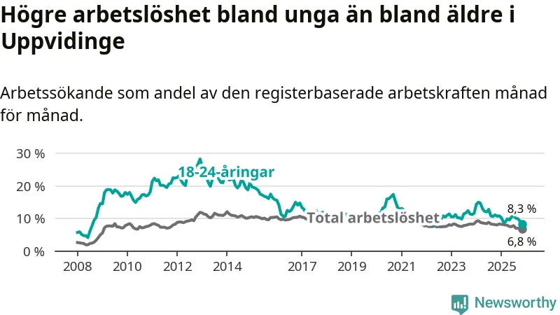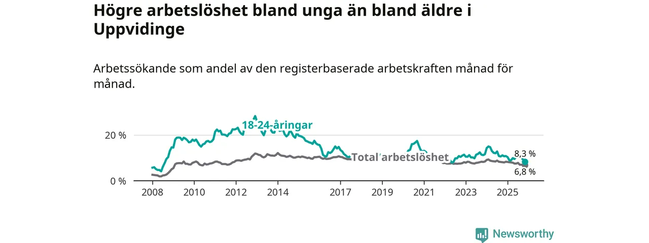 Precis som den totala arbetslösheten sjunker arbetslösheten bland unga (−2,4 procentenheter). I november var 8,3 procent av 18–24-åringarna inskrivna som arbetssökande (motsvarande 34 personer). Mäter vi antalet inskrivna ser vi en minskning med tolv personer på ett års sikt.