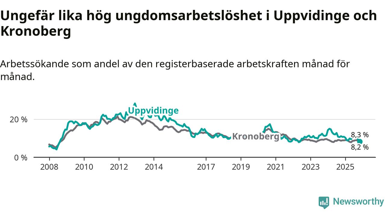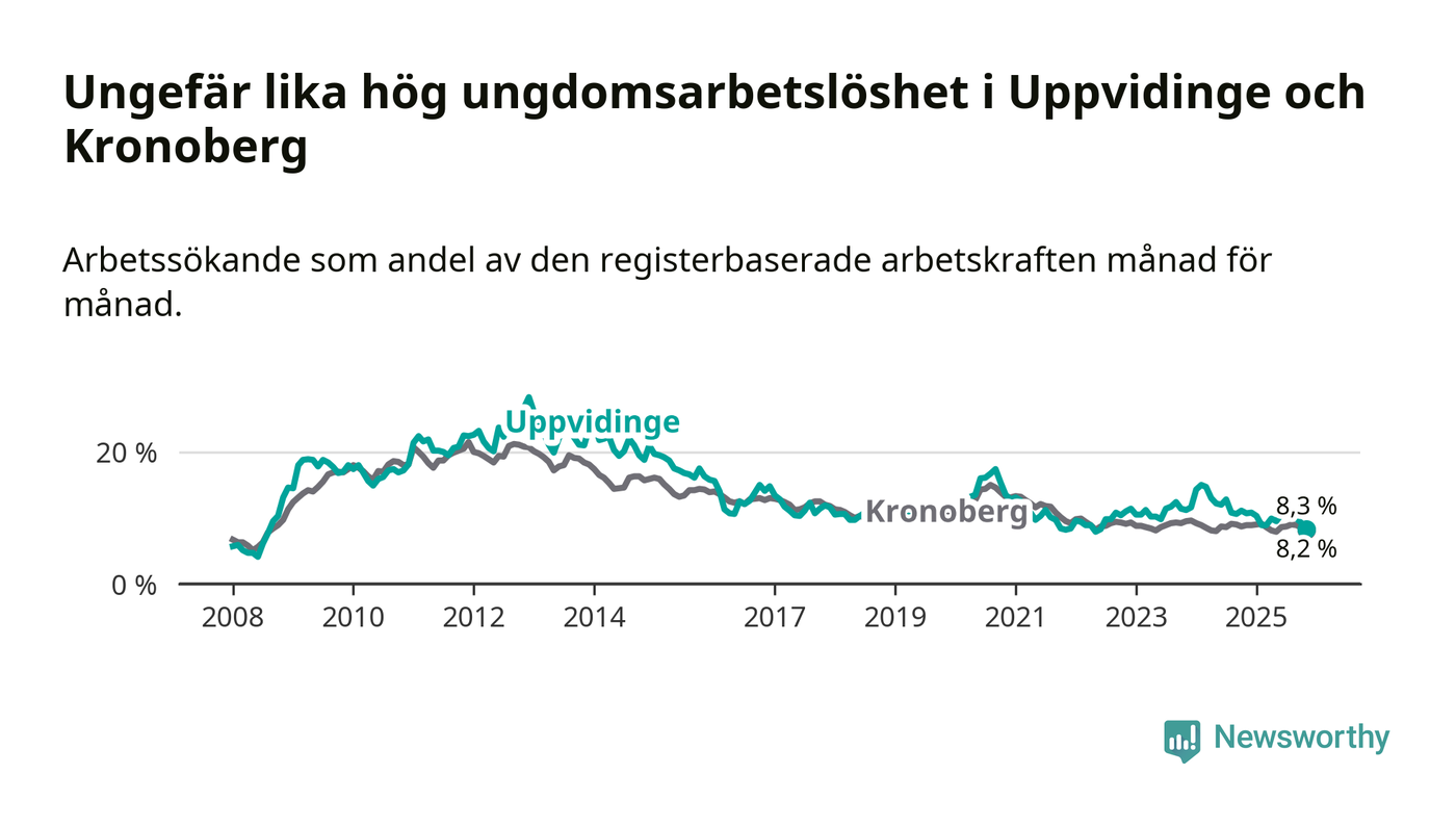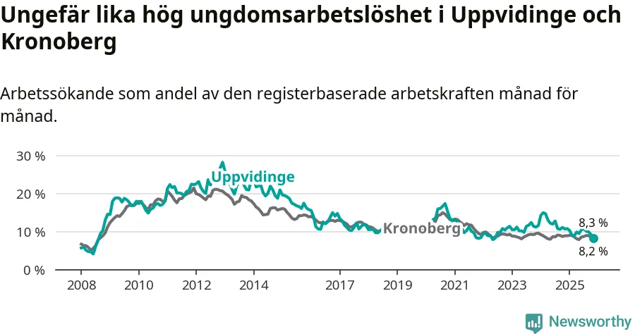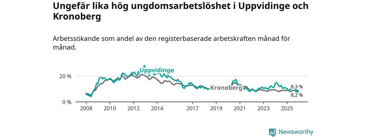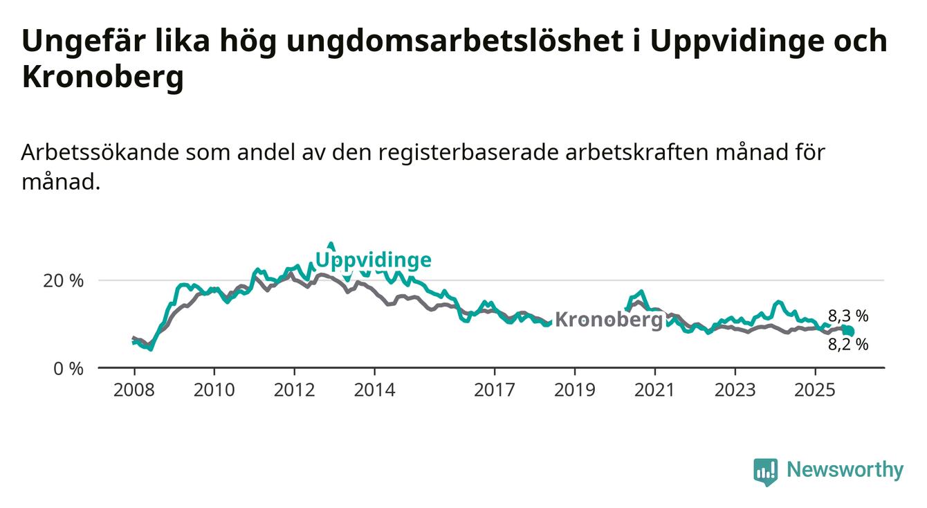 Precis som den totala arbetslösheten ligger ungdomsarbetslösheten i Uppvidinge på i stort sett samma nivå som i Kronoberg som helhet.