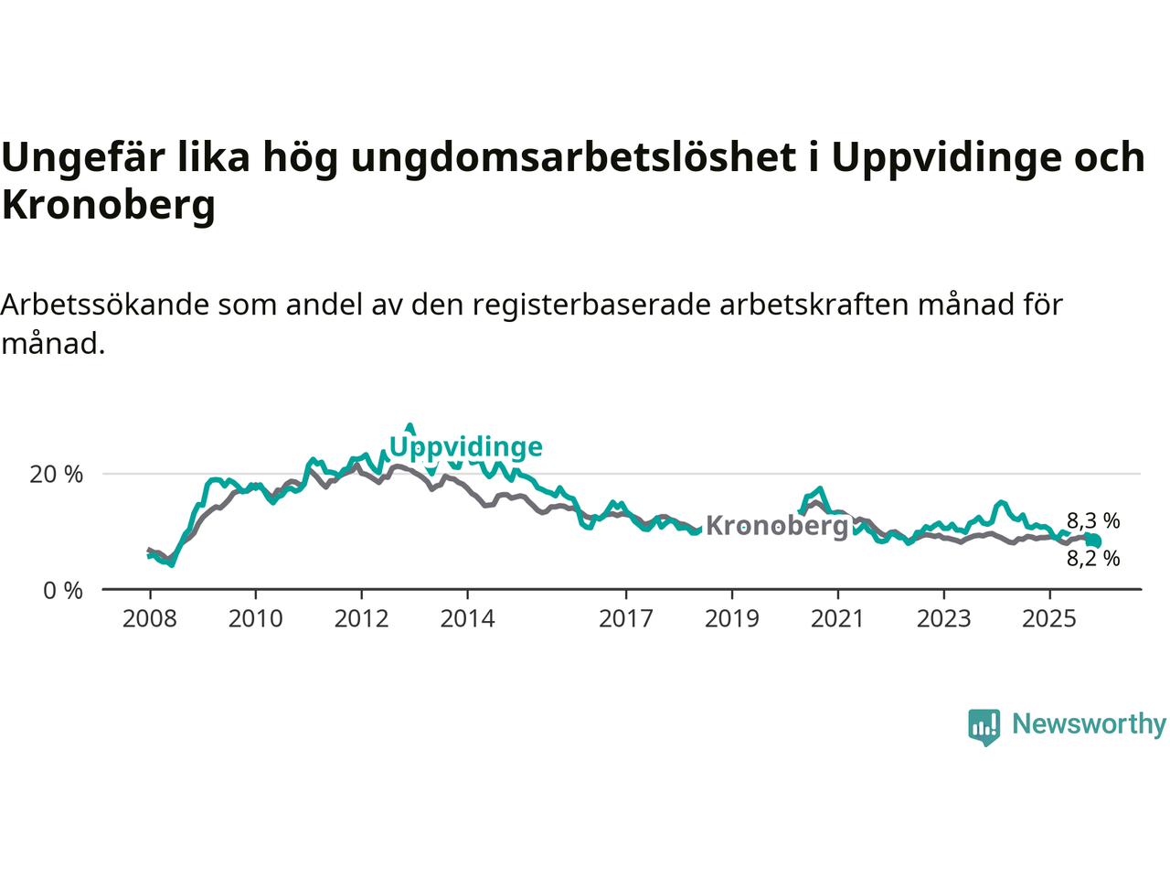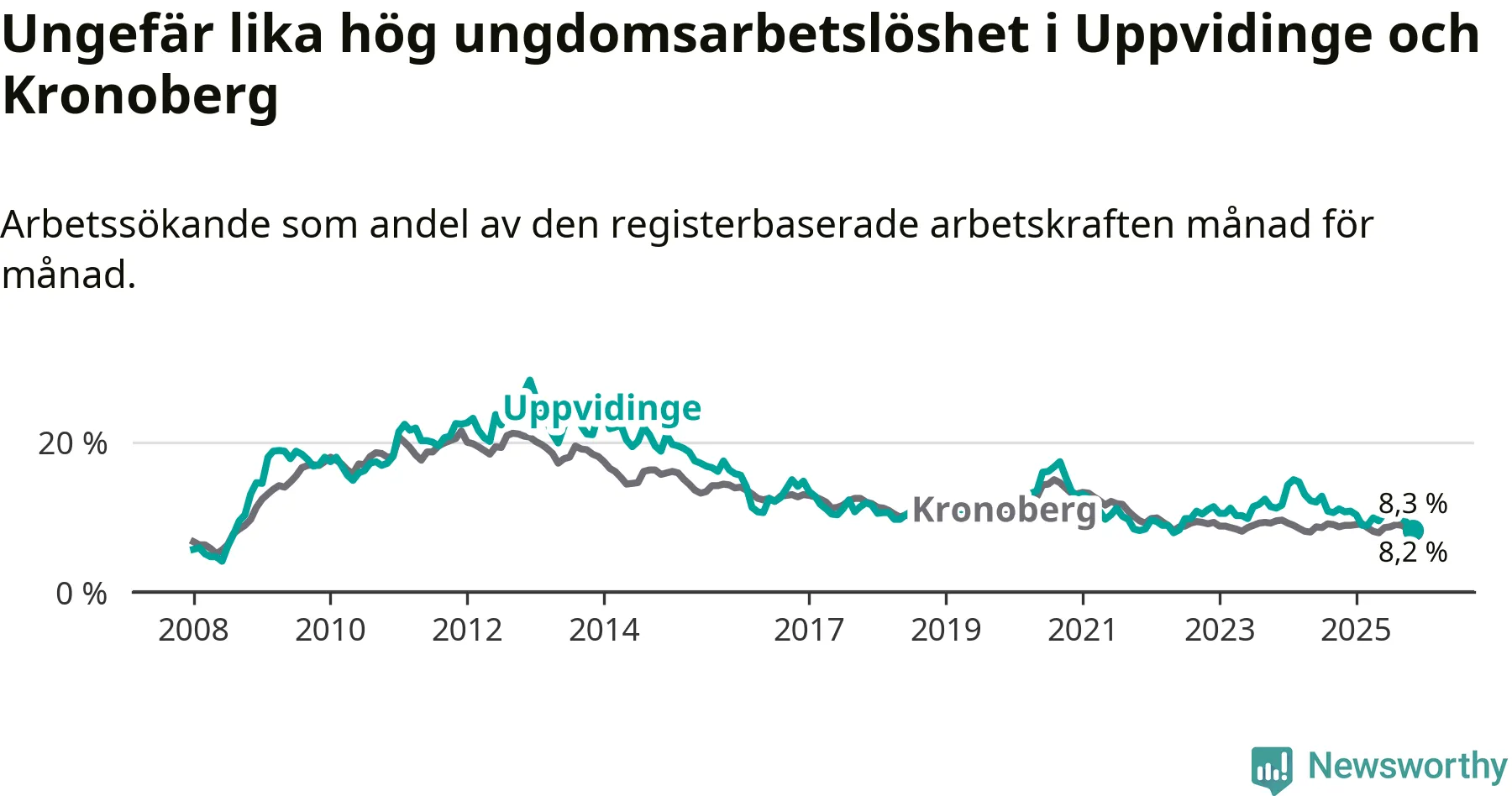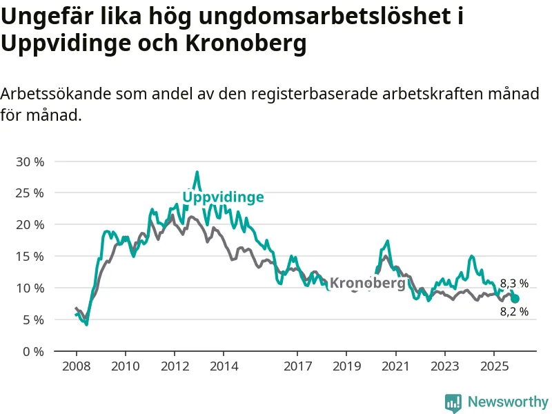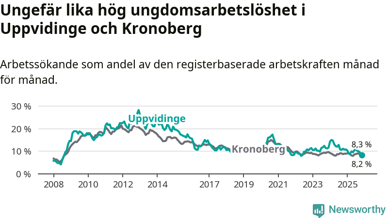 Precis som den totala arbetslösheten ligger ungdomsarbetslösheten i Uppvidinge på i stort sett samma nivå som i Kronoberg som helhet.