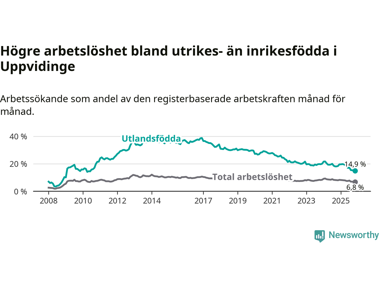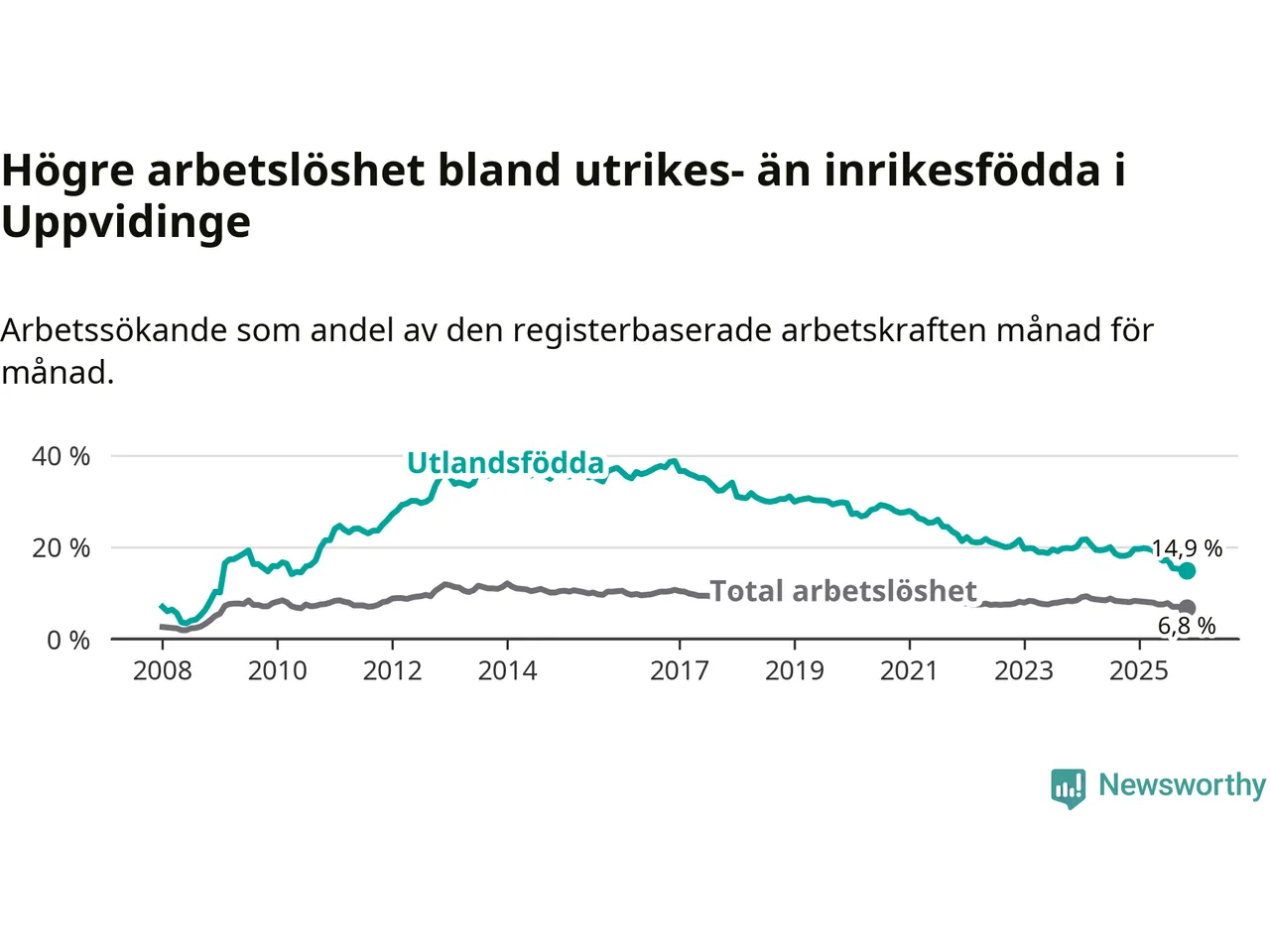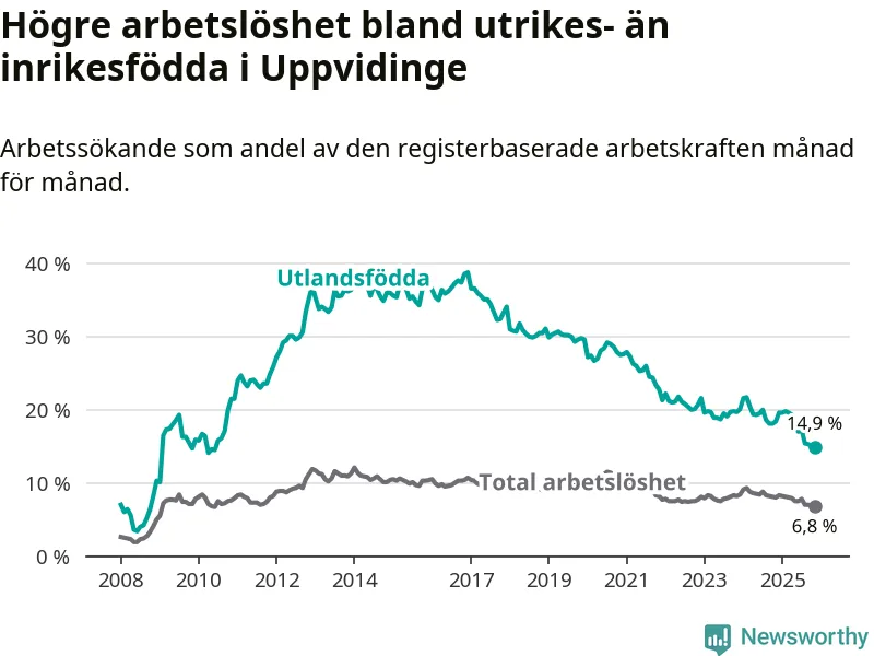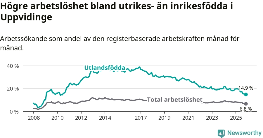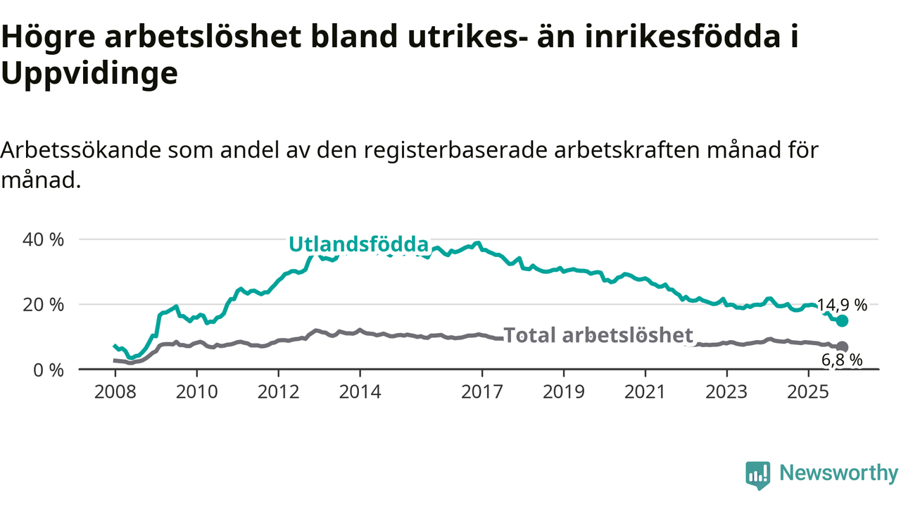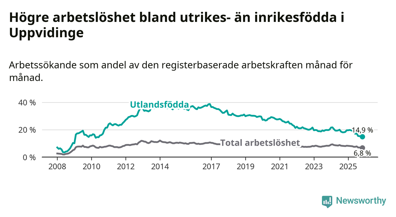 Arbetslösheten bland utlandsfödda var 14,9 procent i Uppvidinge under november månad, motsvarande 164 av 1 101 personer. Det är 3,5 procentenheter färre än vid samma tidpunkt i fjol (−41 om man räknar personer). Därmed är de utlandsföddas arbetslöshet lägre än vid samma tidpunkt i fjol för 16:e månaden i följd. Sedan juli 2024 har arbetslösheten bland utlandsfödda minskat från 20,0 till 14,9 procent. Den nuvarande arbetslöshetsnivån är den lägsta sedan juni 2010.