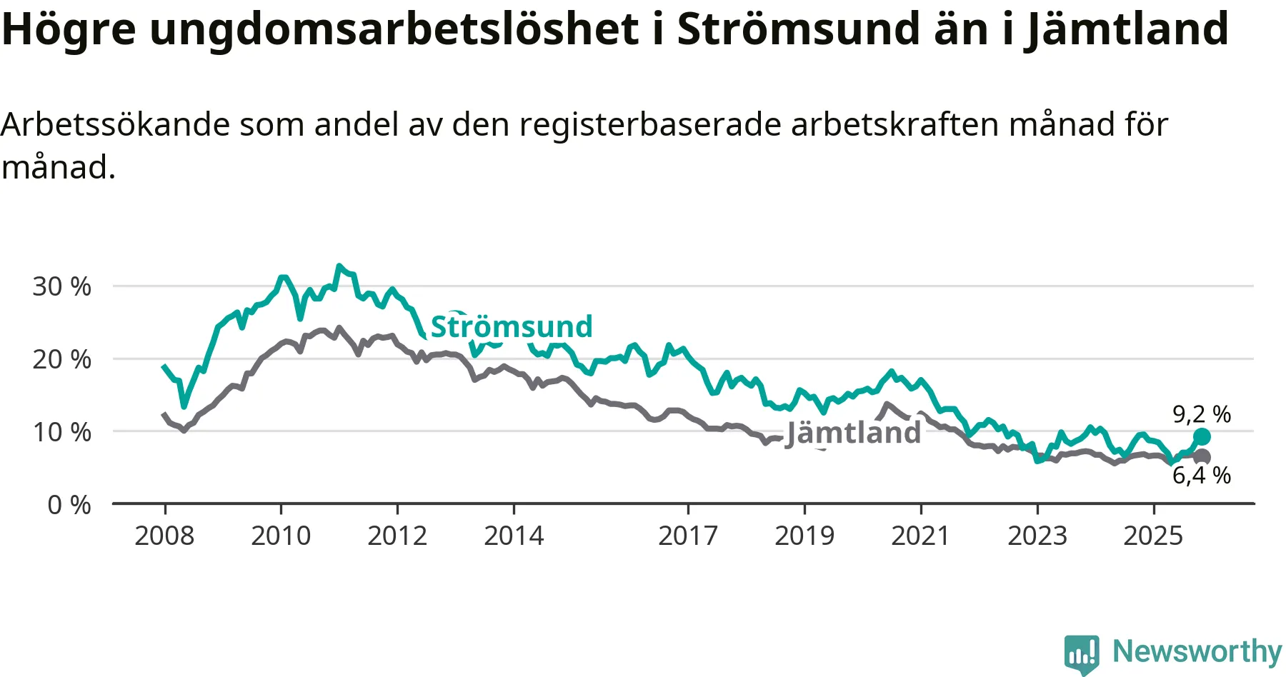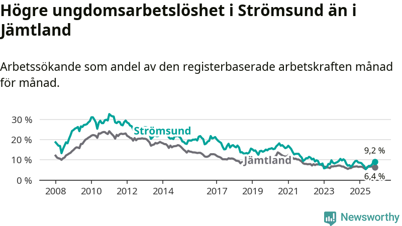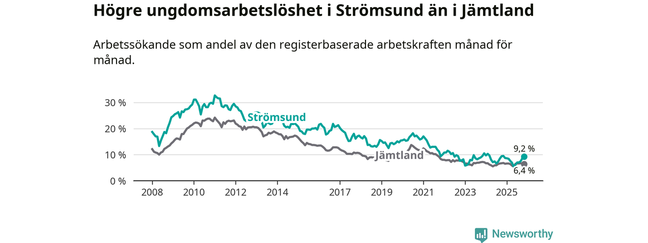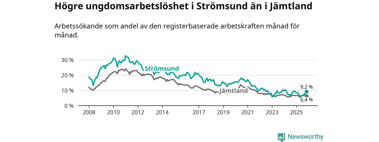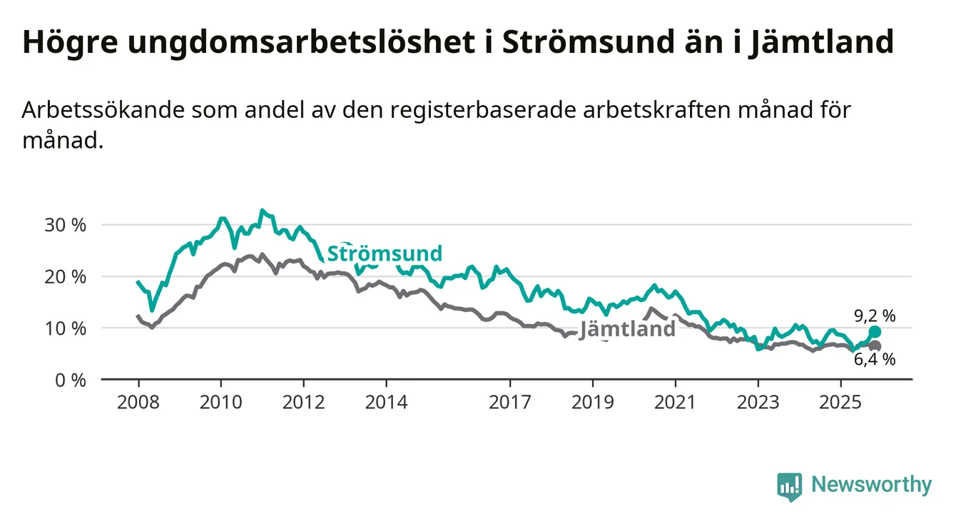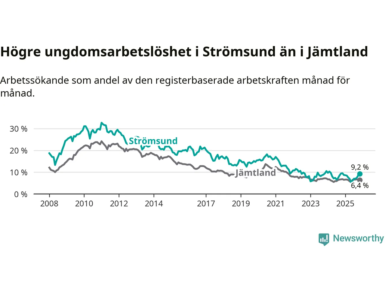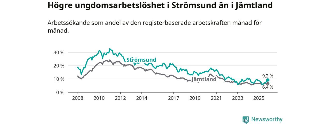 Precis som den totala arbetslösheten ligger ungdomsarbetslösheten i Strömsund högre än i Jämtland som helhet. Skillnaden mellan kommunen och länet är 2,8 procentenheter.