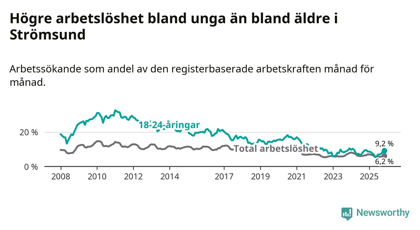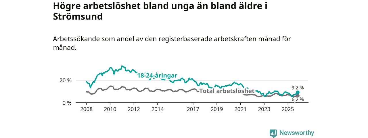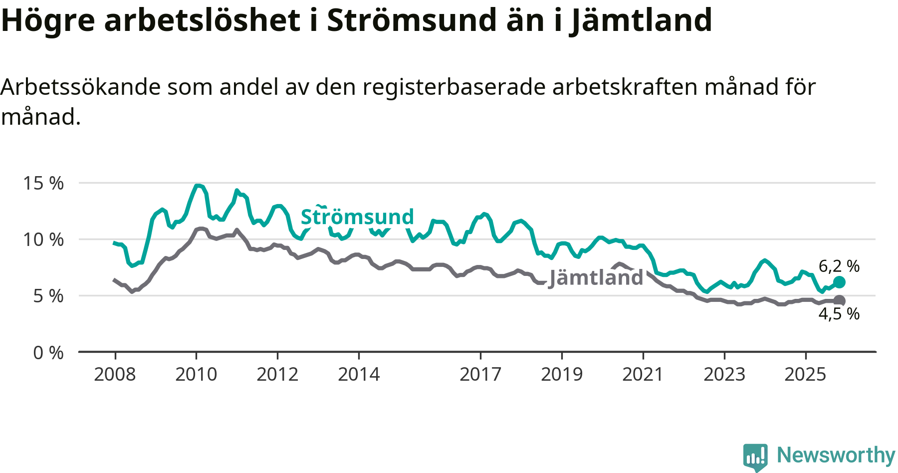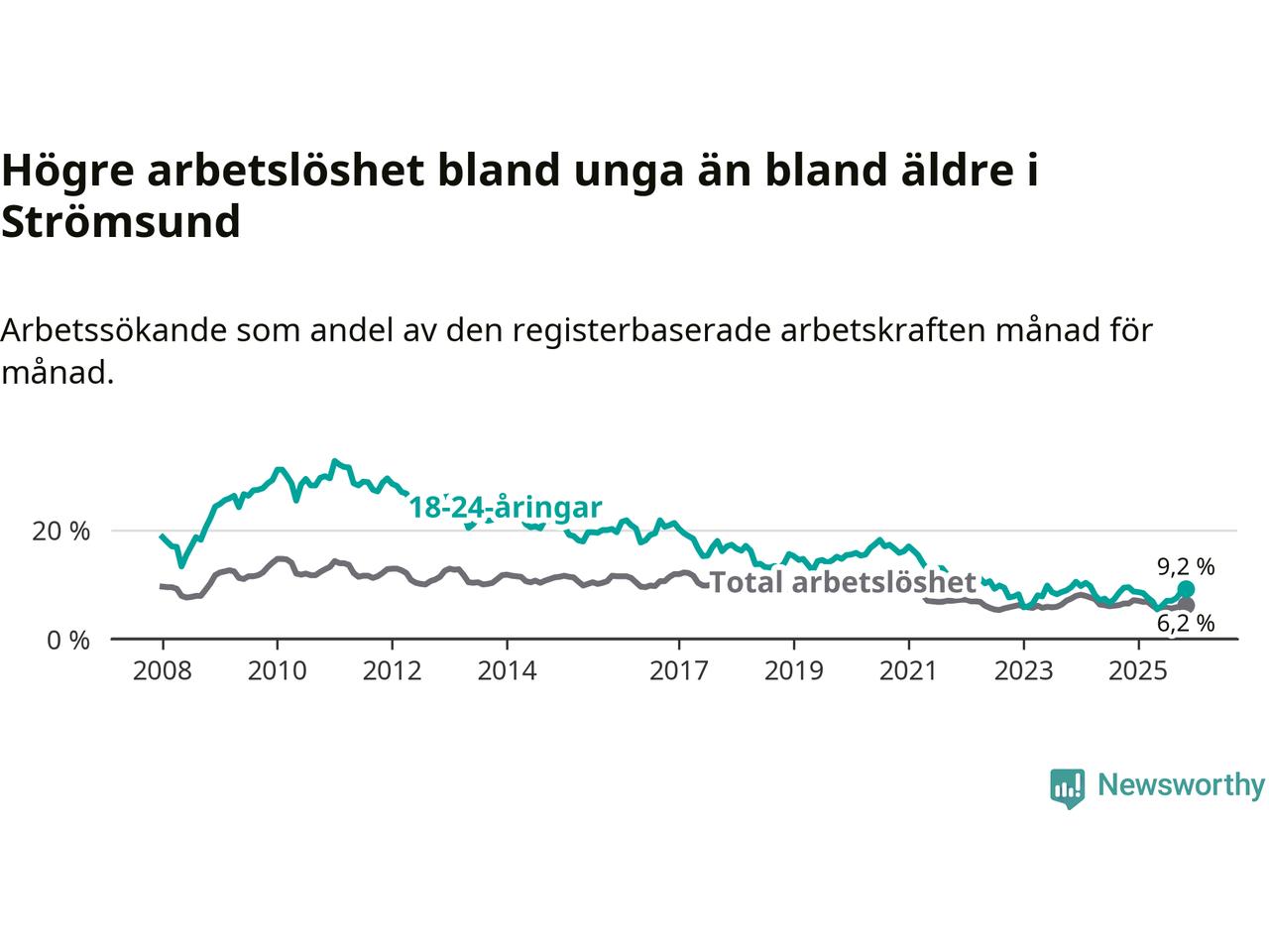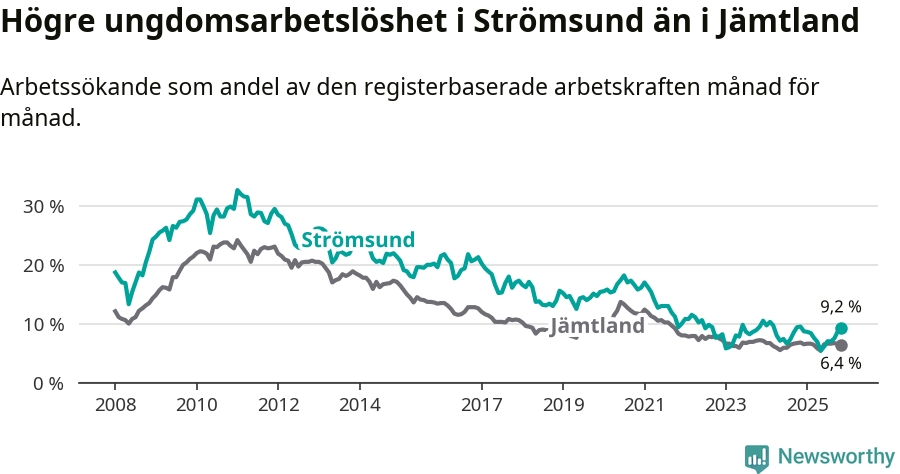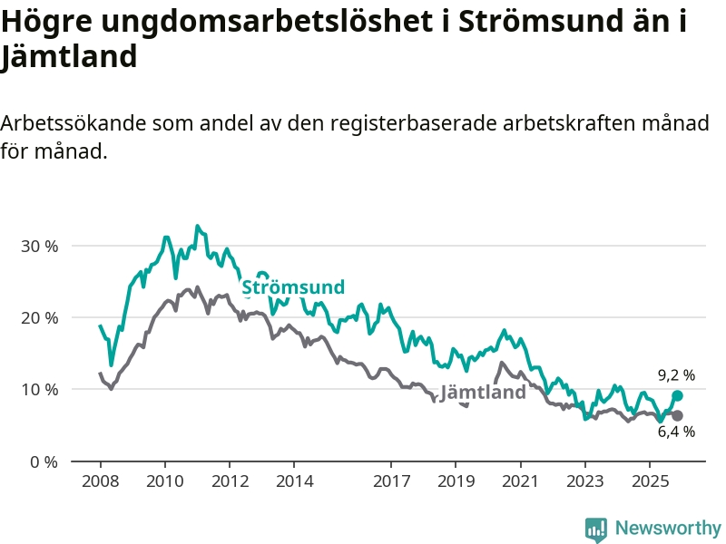 Precis som den totala arbetslösheten ligger ungdomsarbetslösheten i Strömsund högre än i Jämtland som helhet. Skillnaden mellan kommunen och länet är 2,8 procentenheter.
