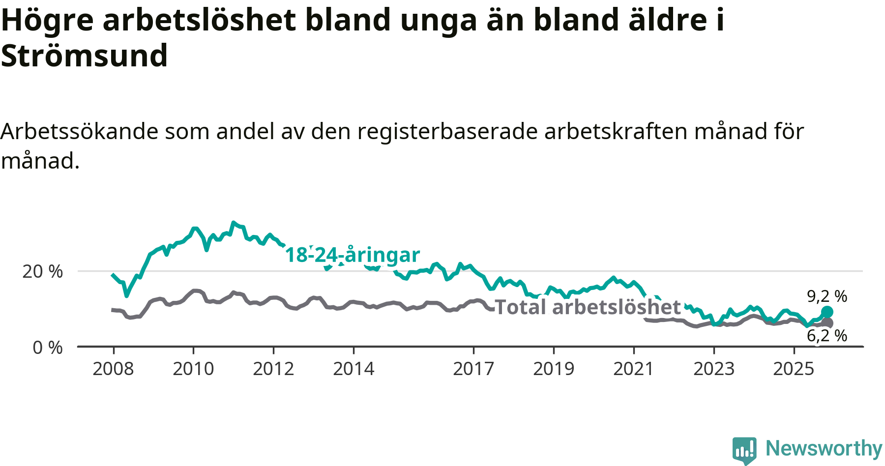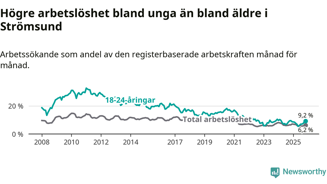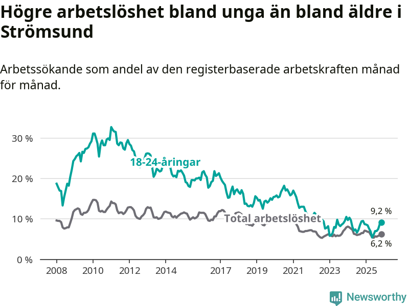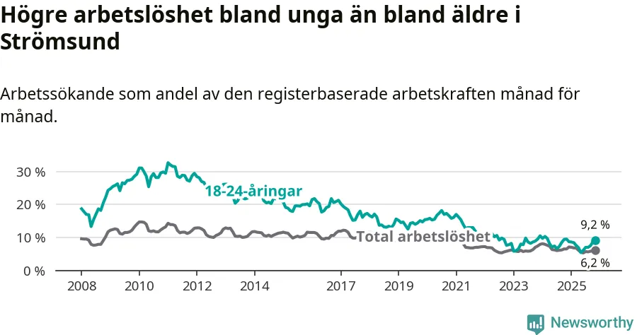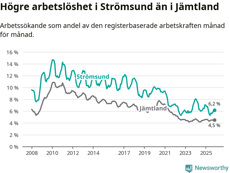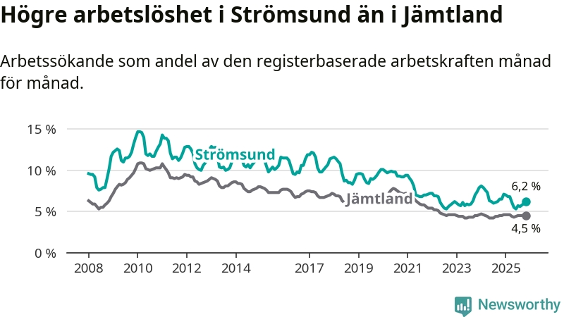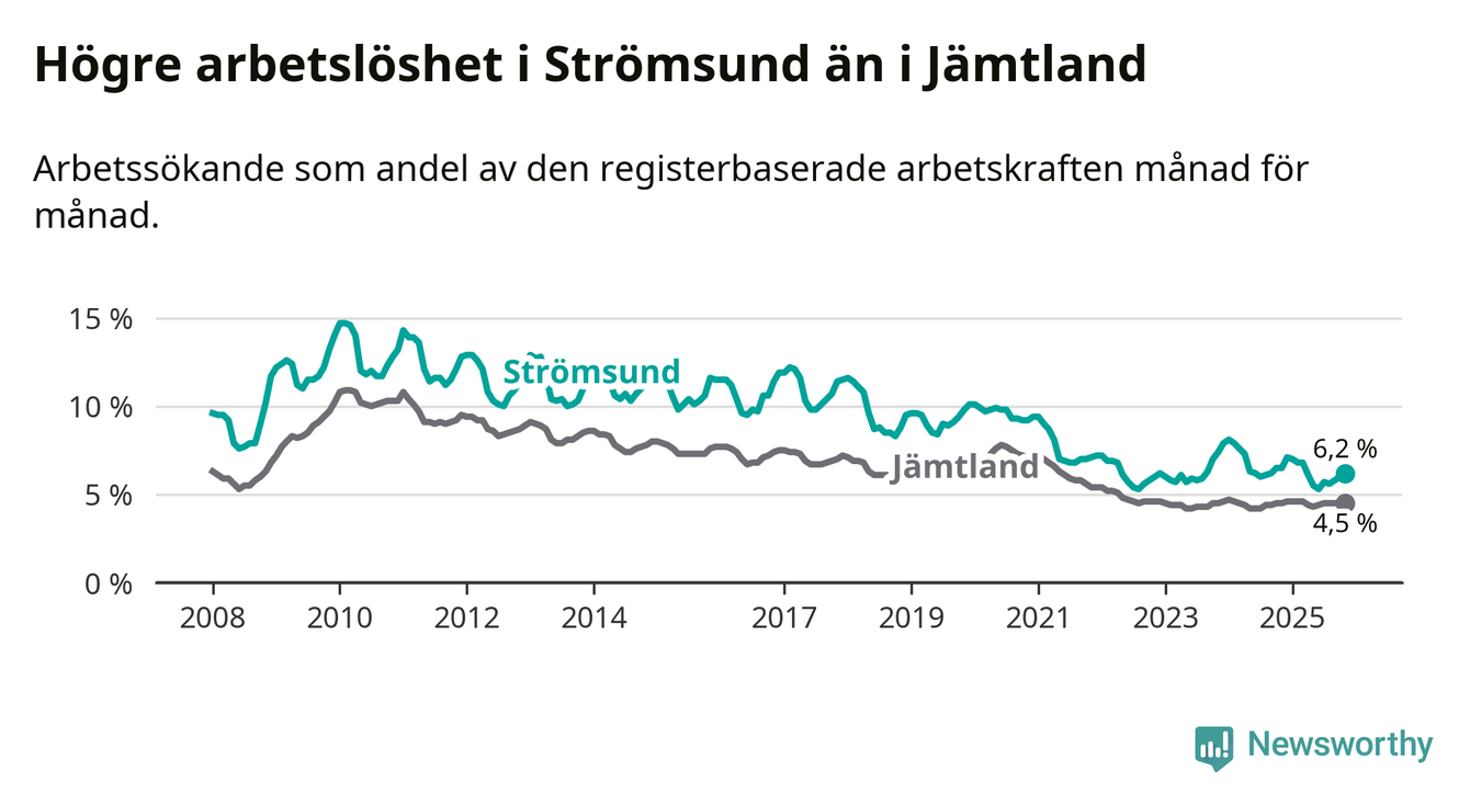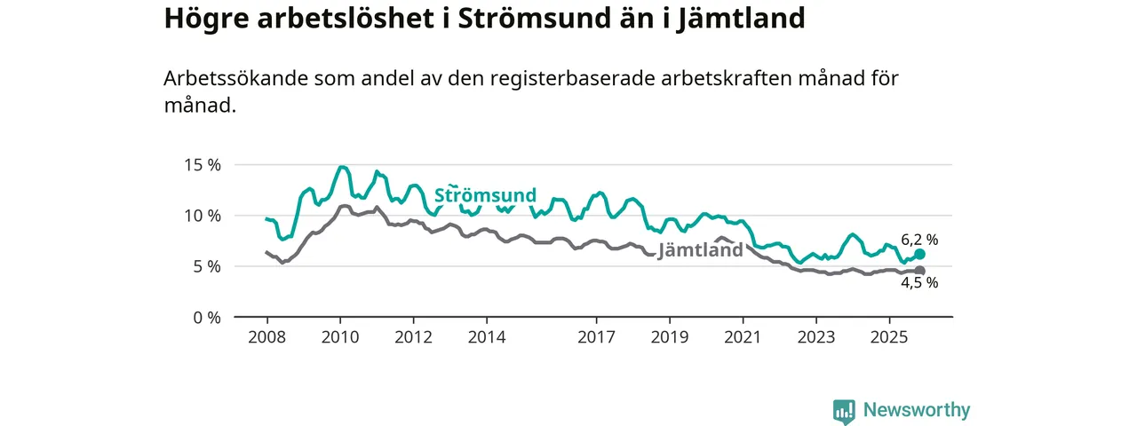 Precis som den totala arbetslösheten ligger ungdomsarbetslösheten i Strömsund högre än i Jämtland som helhet. Skillnaden mellan kommunen och länet är 2,8 procentenheter.