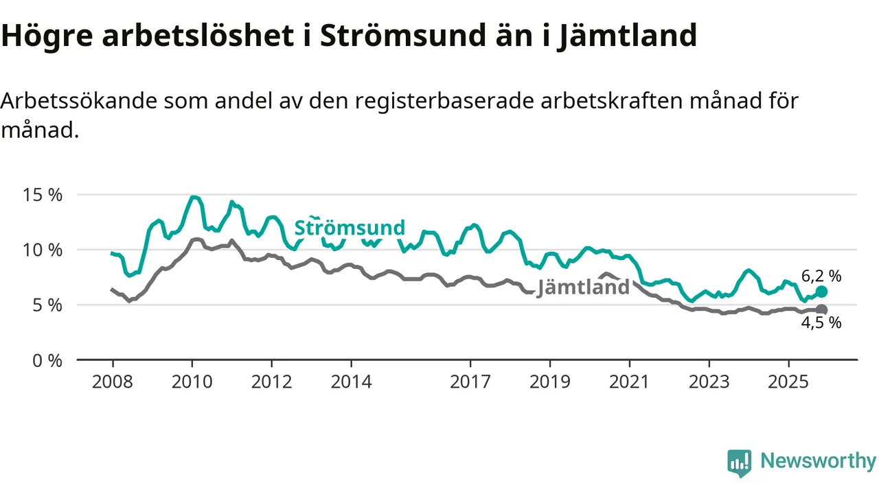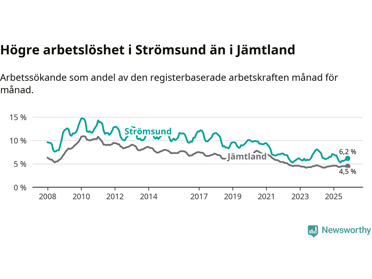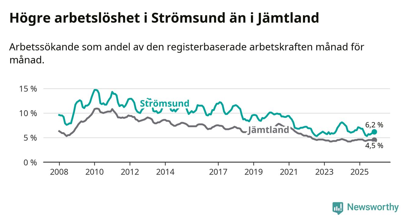 i hela Jämtlands län (6,2 procent i kommunen, jämfört med 4,5 procent i hela länet). Strömsund har därmed även den högsta arbetslöshetsnivån i länet. Krokom har den lägsta (3,1 procent). För att Strömsund skulle komma ner i samma arbetslöshetsnivå som Krokom skulle 149 personer behöva sysselsättas.