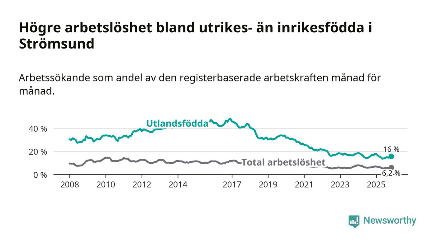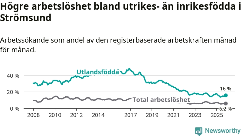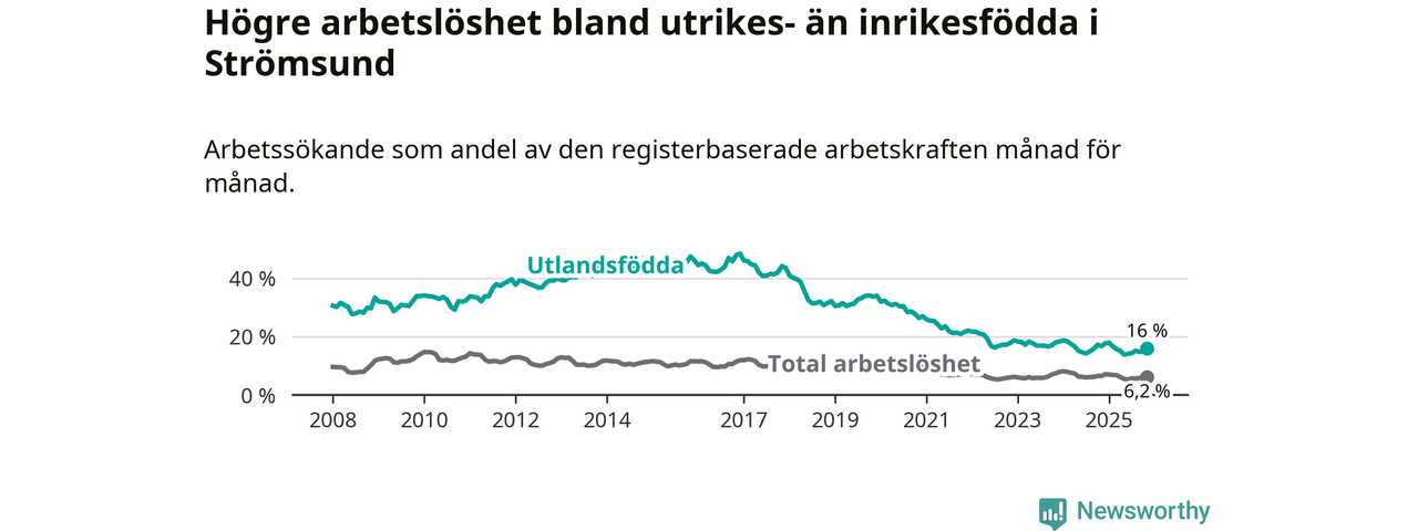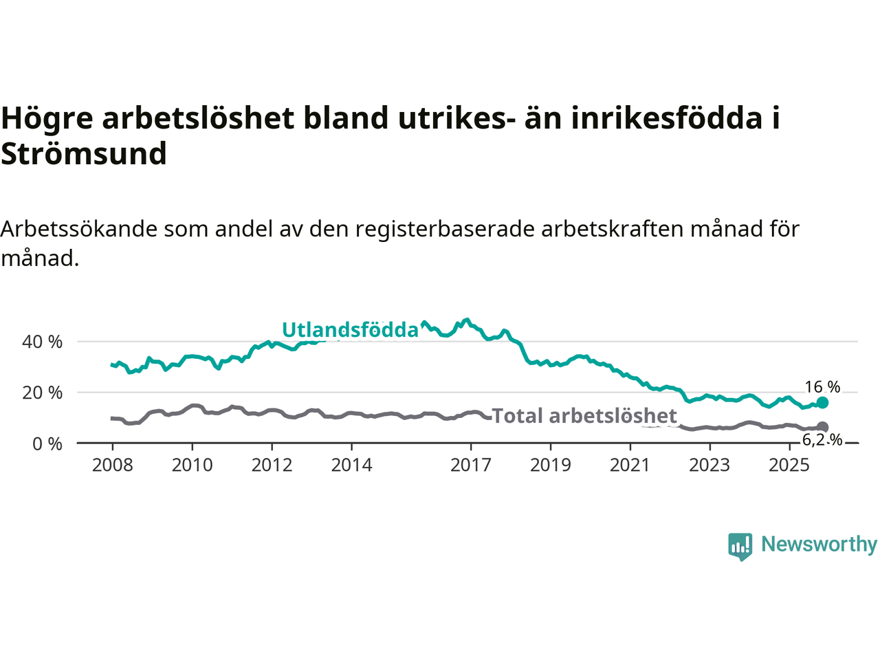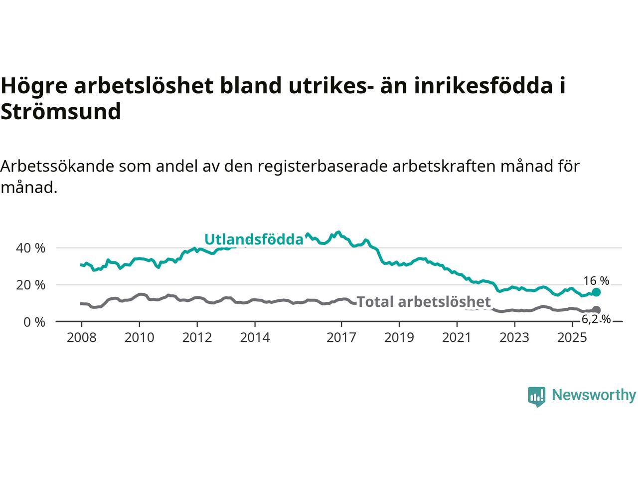 Arbetslösheten bland utlandsfödda var 16,0 procent i Strömsund under november månad, motsvarande 108 av 675 personer. Det är 0,7 procentenheter färre än vid samma tidpunkt i fjol (−6 om man räknar personer).
