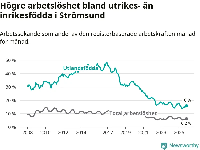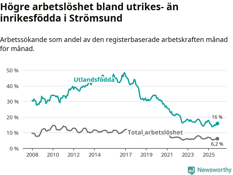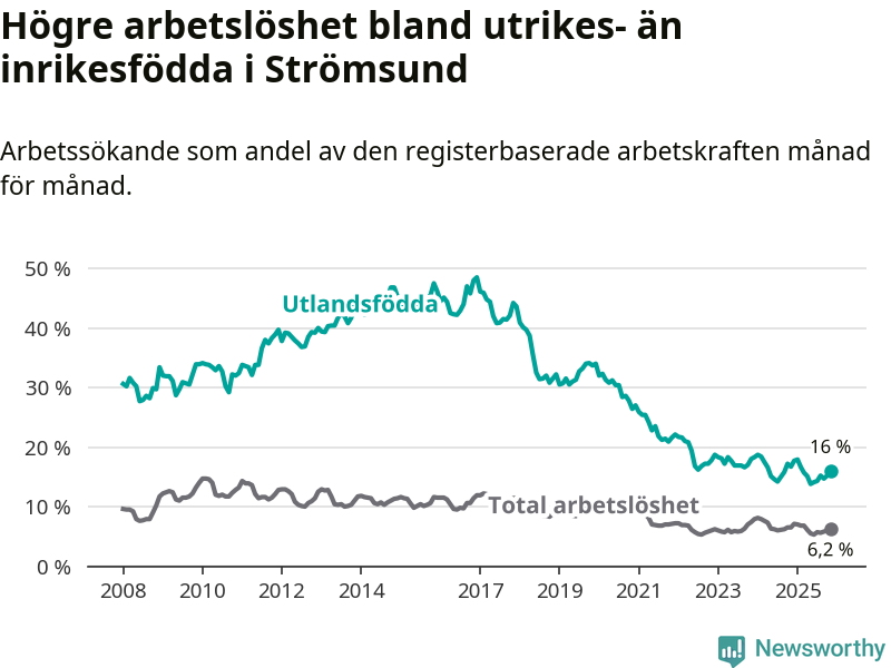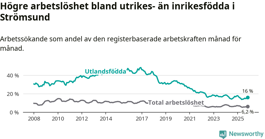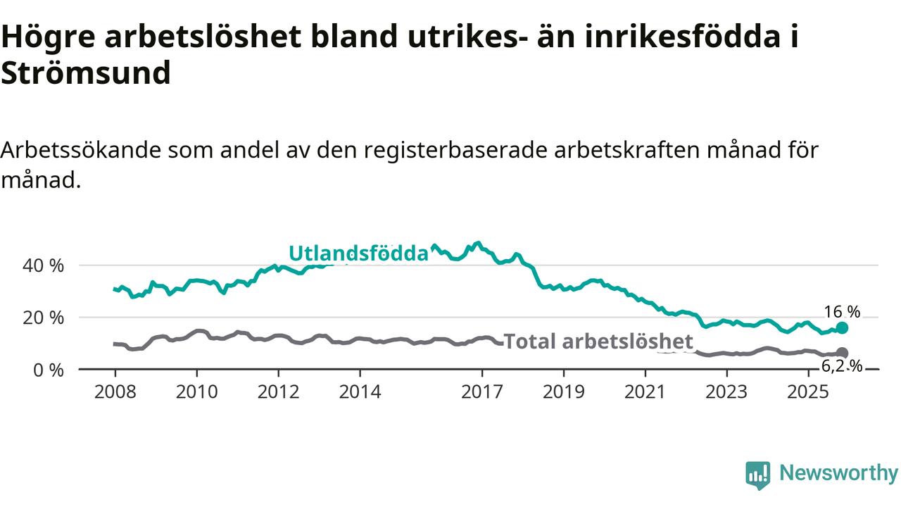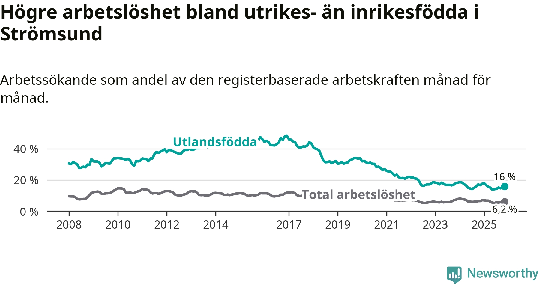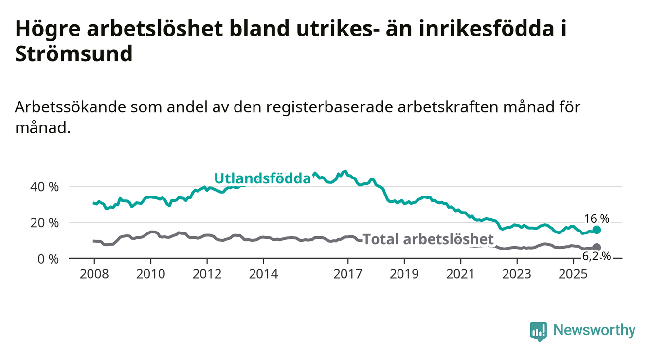 Arbetslösheten bland utlandsfödda var 16,0 procent i Strömsund under november månad, motsvarande 108 av 675 personer. Det är 0,7 procentenheter färre än vid samma tidpunkt i fjol (−6 om man räknar personer).