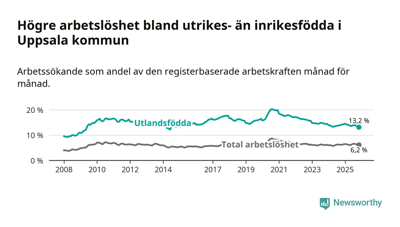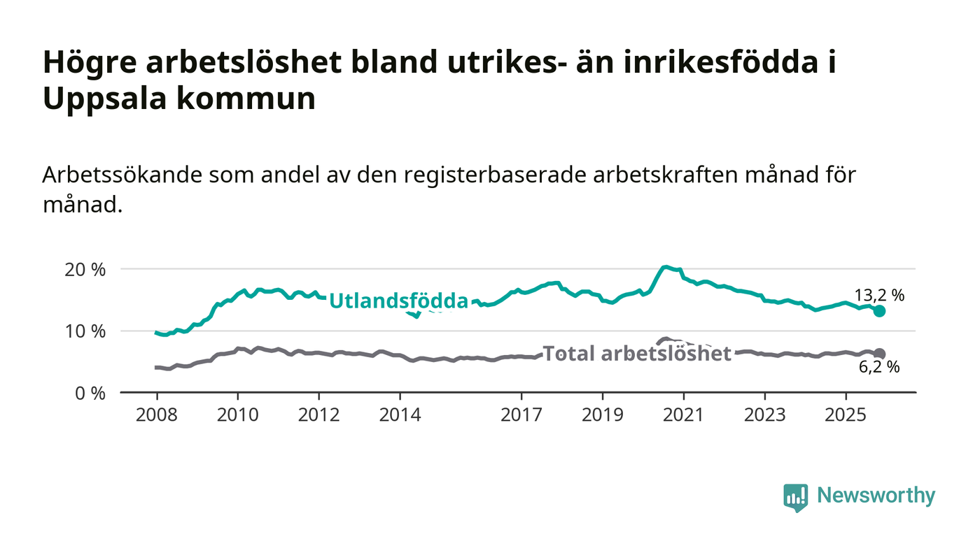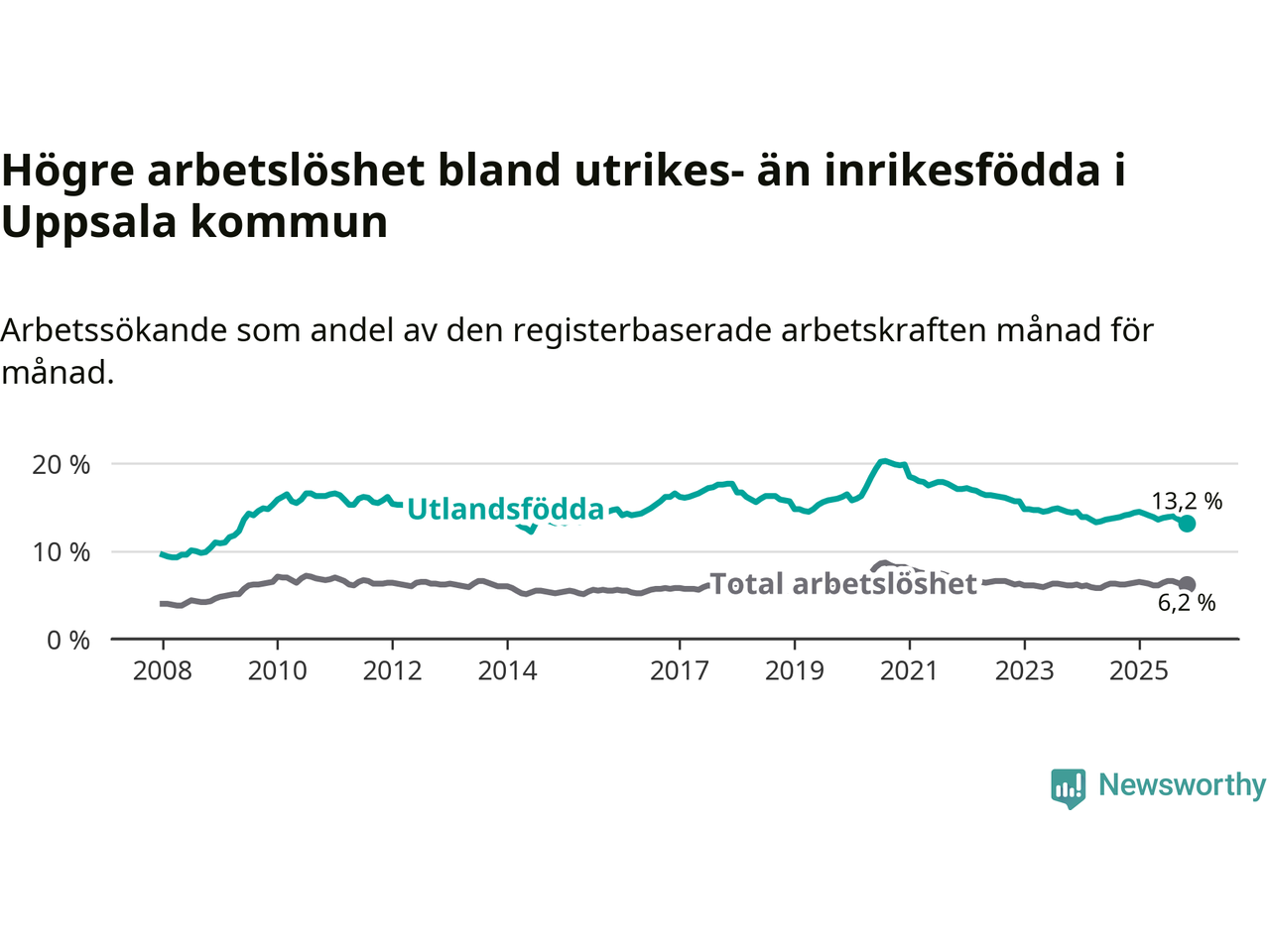 Arbetslösheten bland utlandsfödda var 13,2 procent i Uppsala under november månad, motsvarande 4 532 av 34 333 personer. Det är 1,0 procentenheter färre än vid samma tidpunkt i fjol (−228 om man räknar personer). Den nuvarande arbetslöshetsnivån är den lägsta sedan januari 2015.