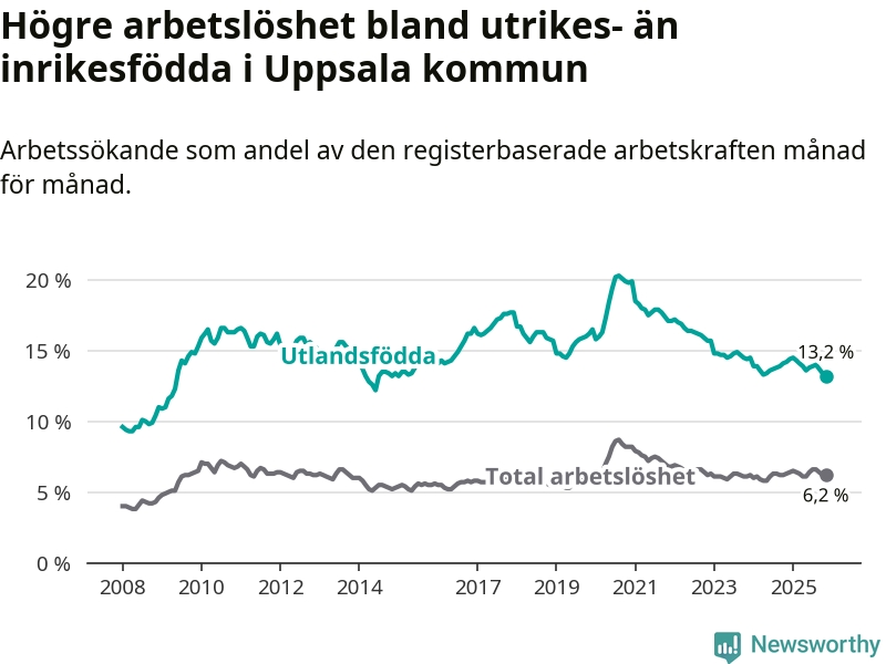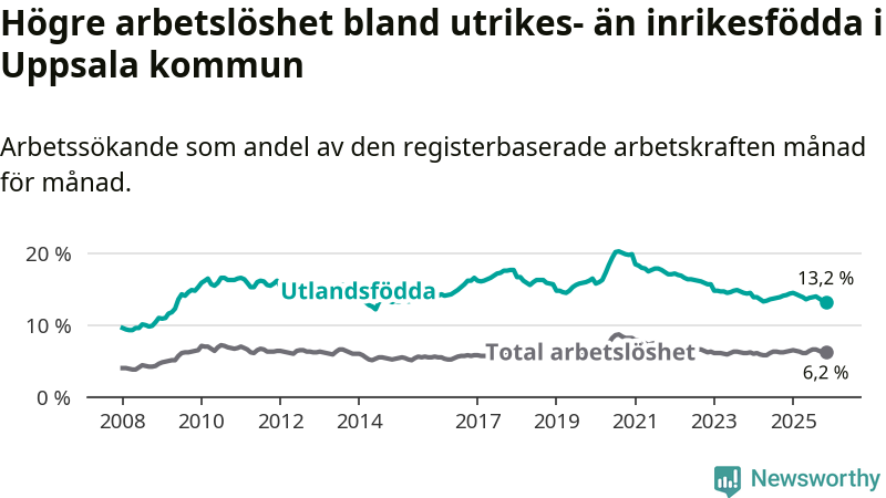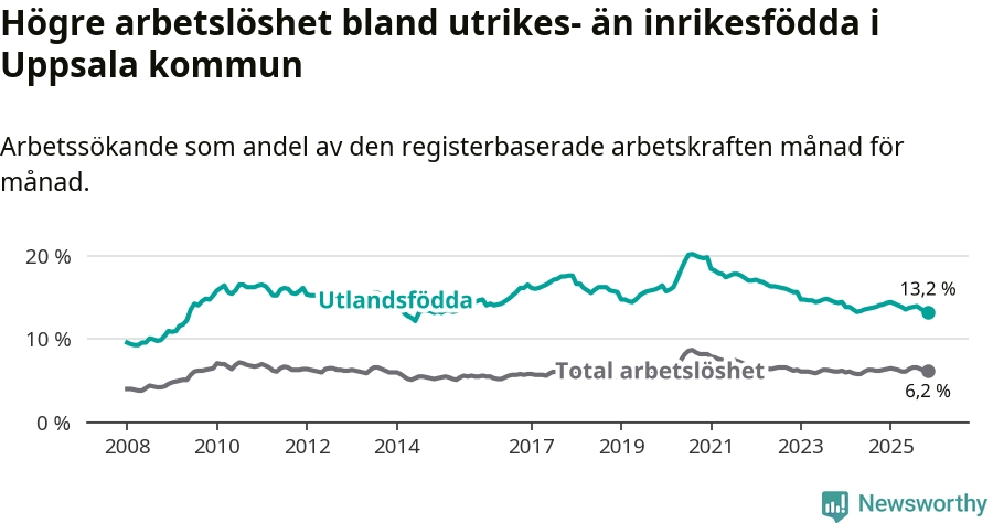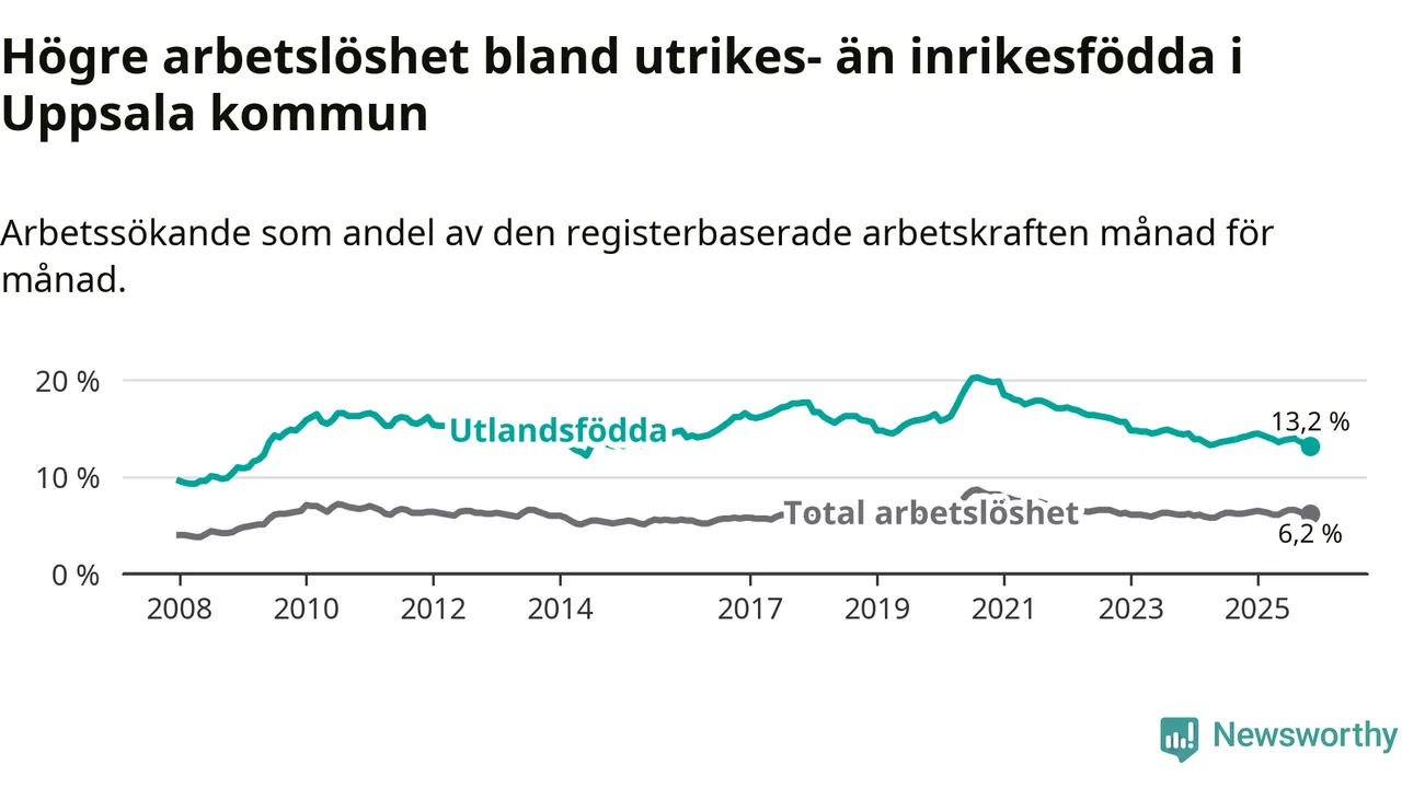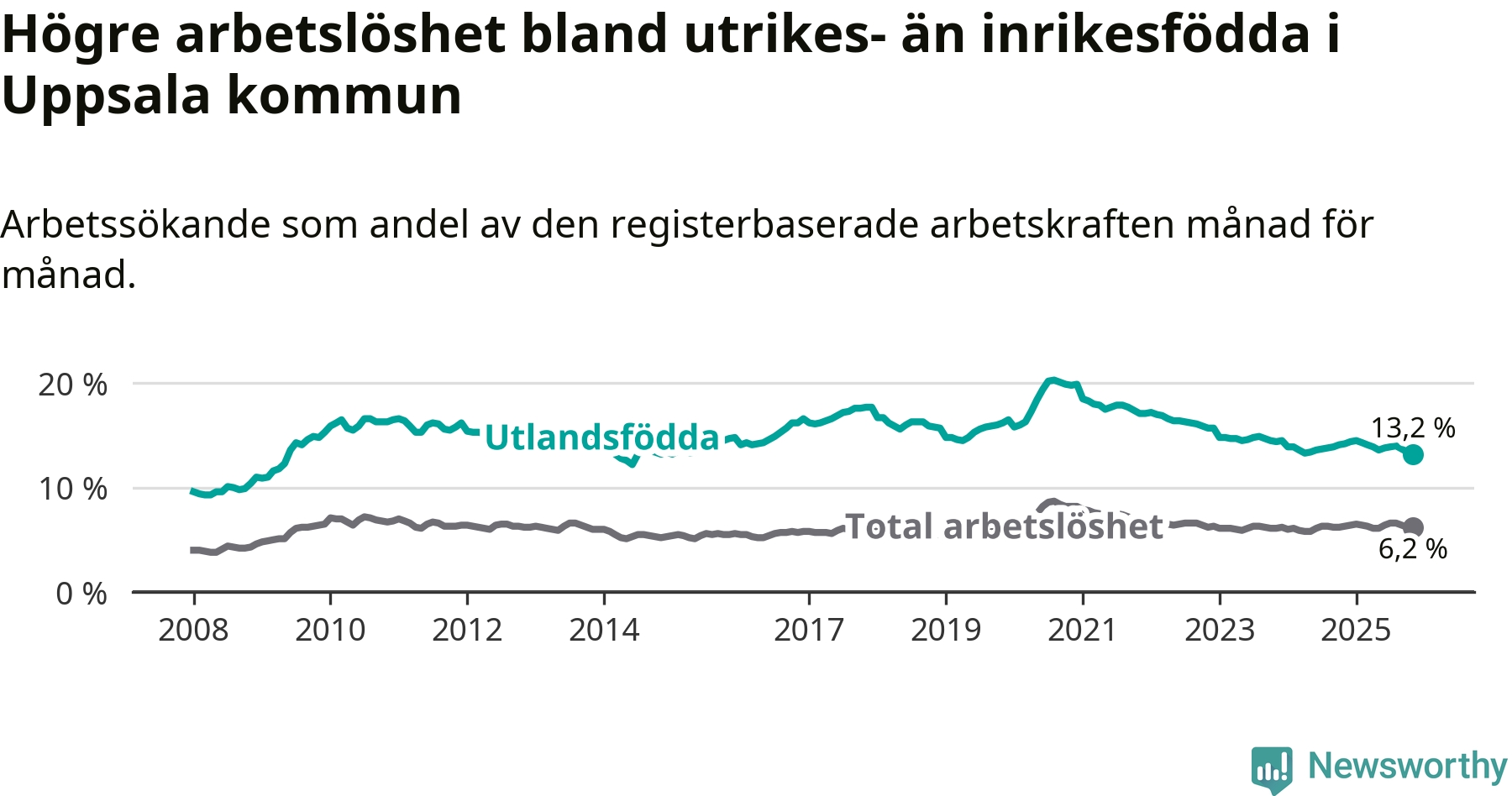 Arbetslösheten bland utlandsfödda var 13,2 procent i Uppsala under november månad, motsvarande 4 532 av 34 333 personer. Det är 1,0 procentenheter färre än vid samma tidpunkt i fjol (−228 om man räknar personer). Den nuvarande arbetslöshetsnivån är den lägsta sedan januari 2015.