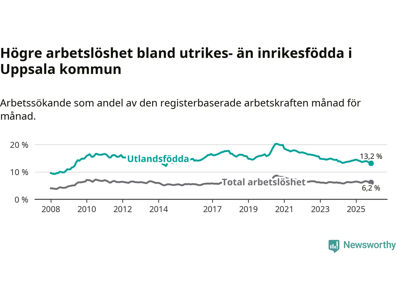 Den senaste månadsstatistiken från Arbetsförmedlingen visar på en nedgång i arbetslöshet bland utlandsfödda i Uppsala kommun med 1,0 procentenheter. Arbetslösheten bland invånare födda i ett annat land låg i november på 13,2 procent.