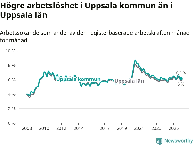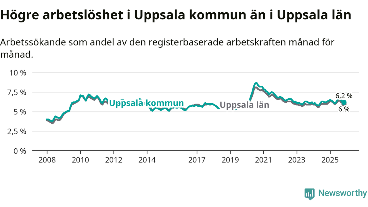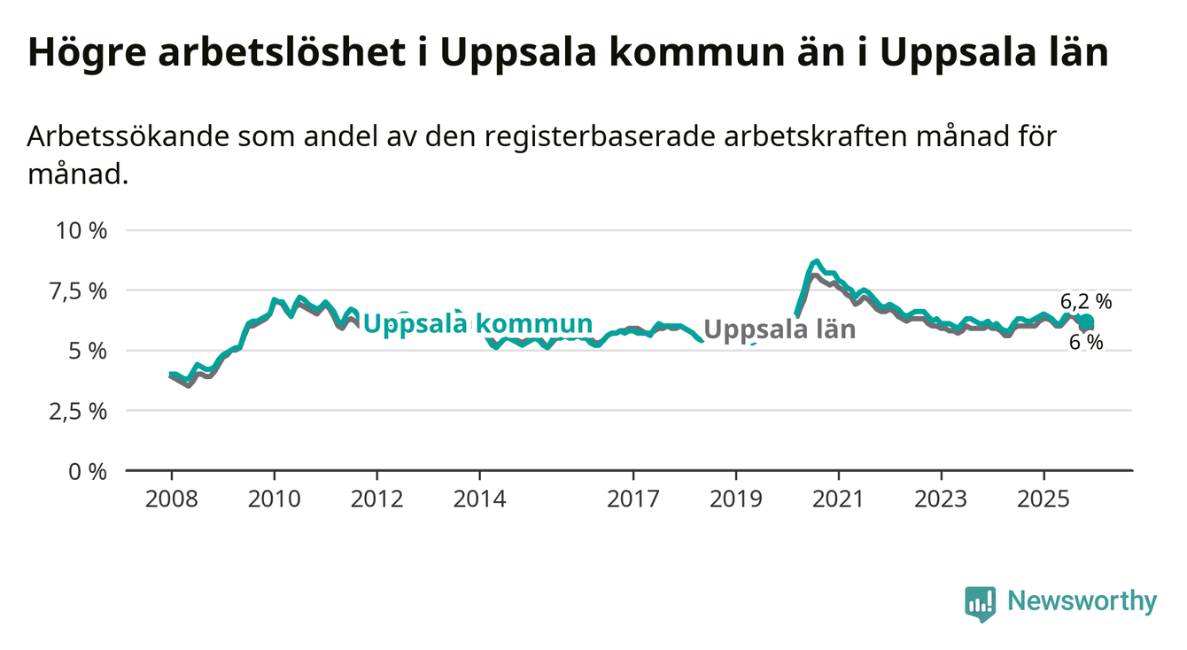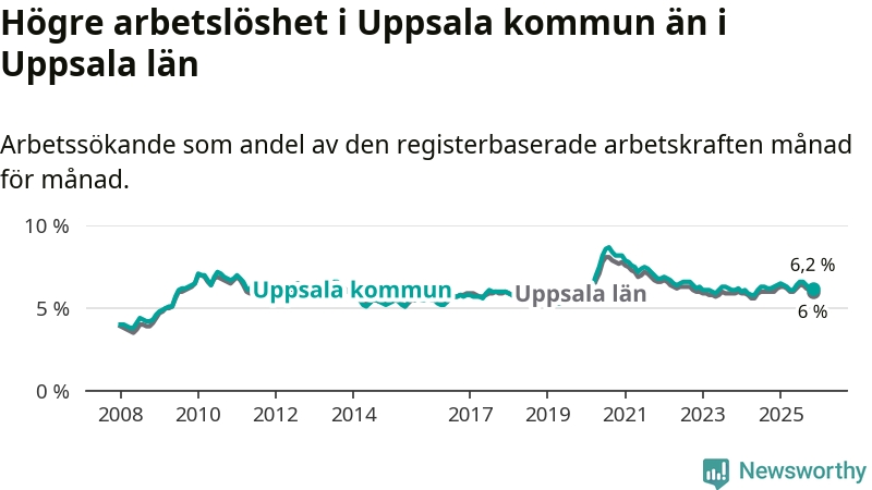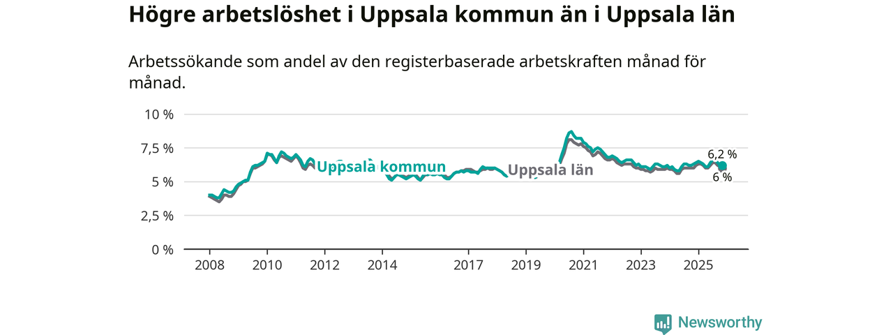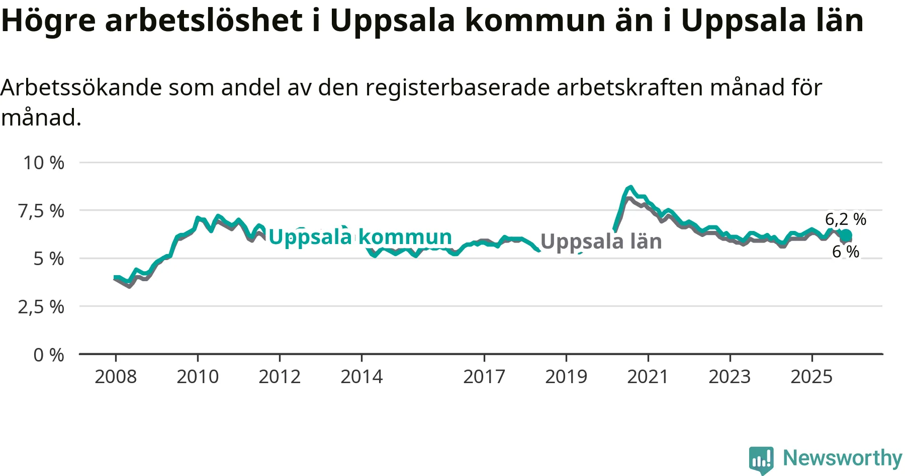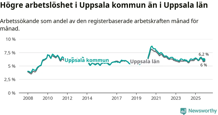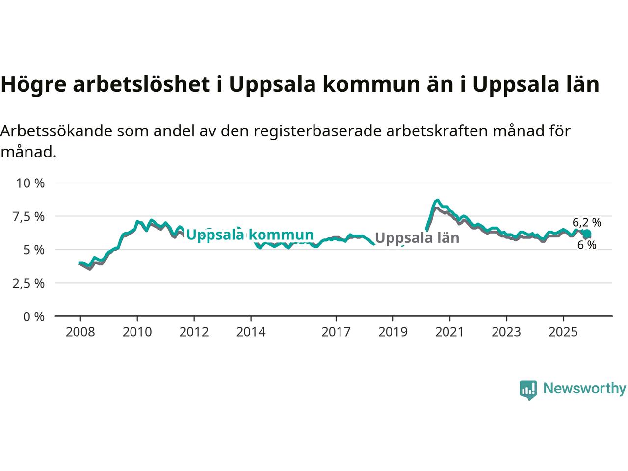 Även om arbetslösheten i Uppsala alltså minskar, så ligger den fortfarande över snittet i hela Uppsala län (6,2 procent i kommunen, jämfört med 6,0 procent i hela länet). Östhammar har den lägsta arbetslösheten i länet (3,8 procent), medan Älvkarleby har den högsta (7,6 procent). För att Uppsala skulle komma ner i samma arbetslöshetsnivå som Östhammar skulle 3 034 personer behöva sysselsättas.