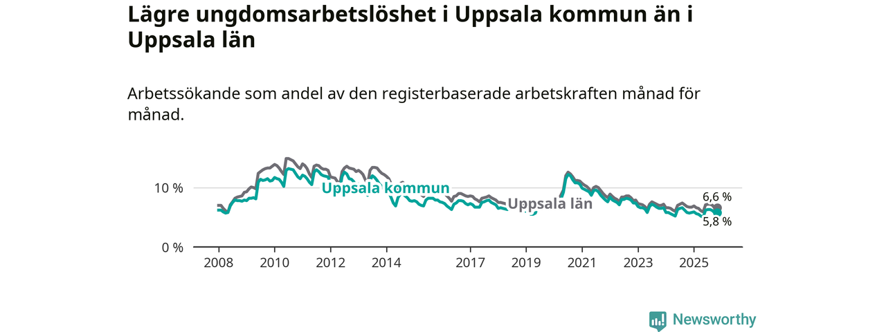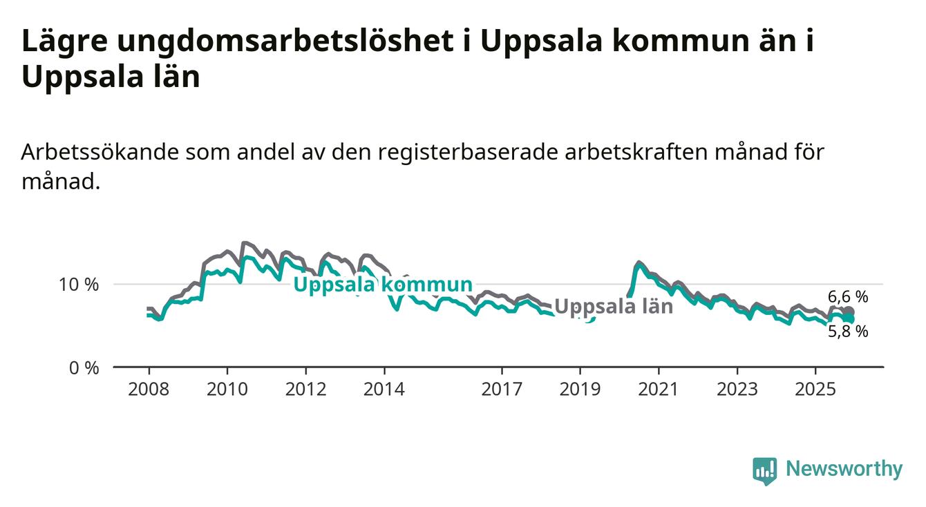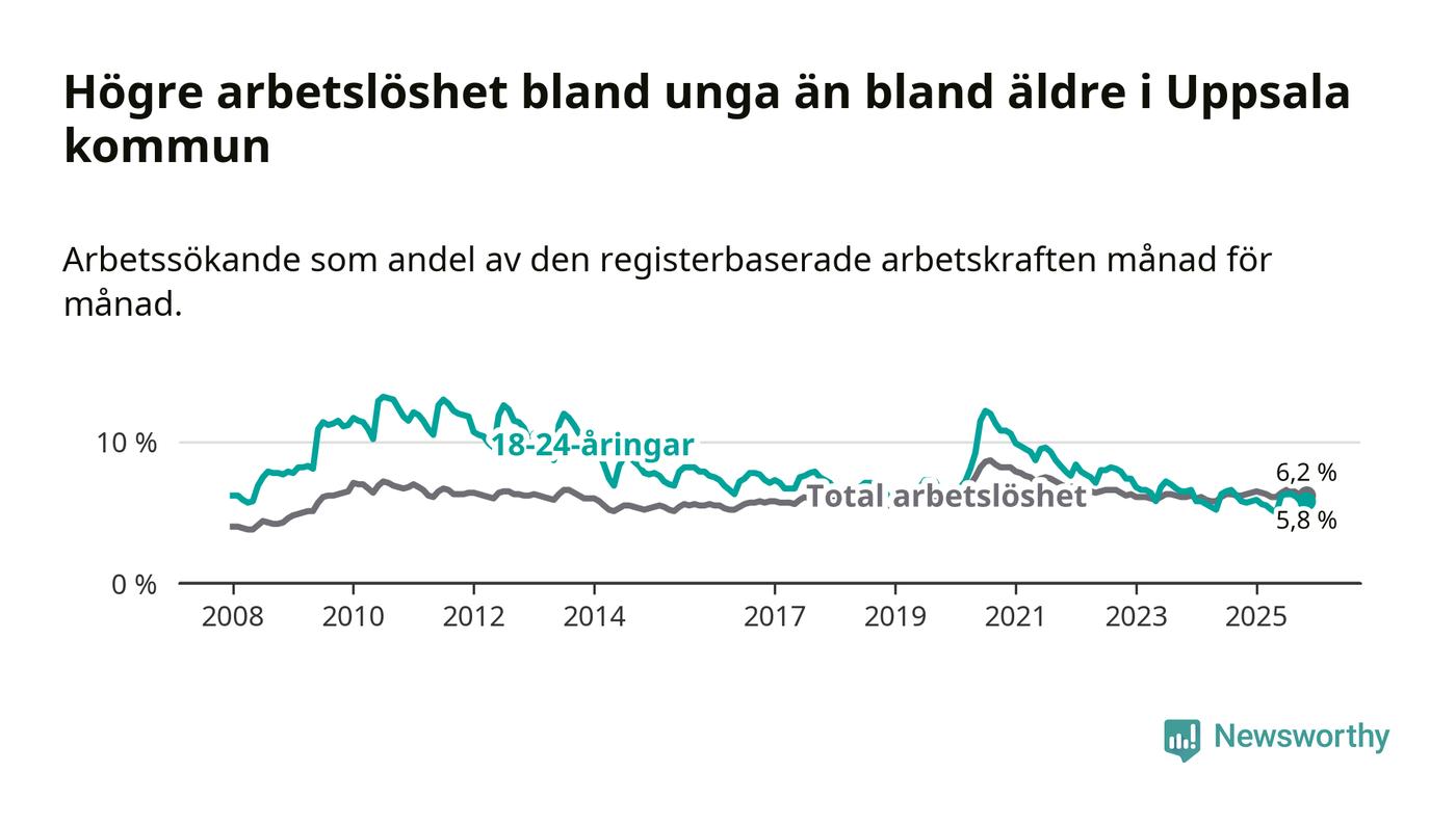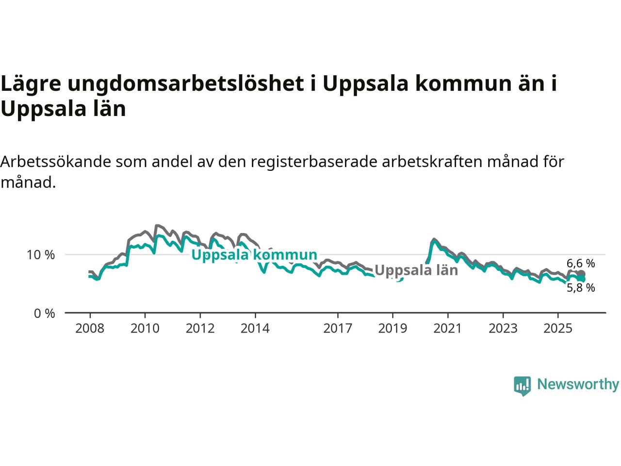 Medan Uppsala har högre total arbetslöshet än Uppsala, ligger ungdomsarbetslösheten 0,8 procentenheter lägre i Uppsala.