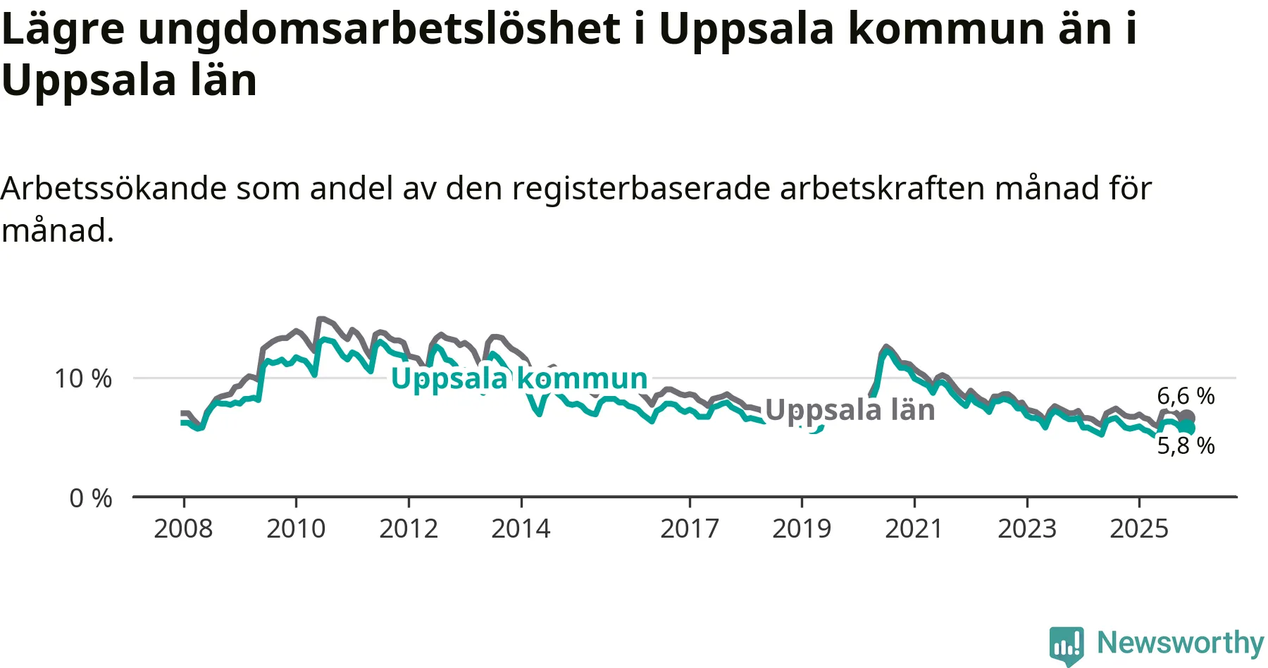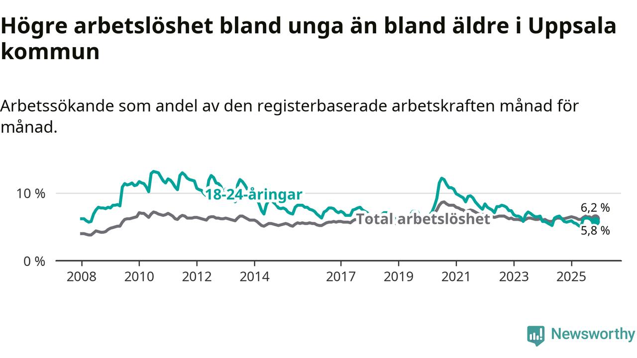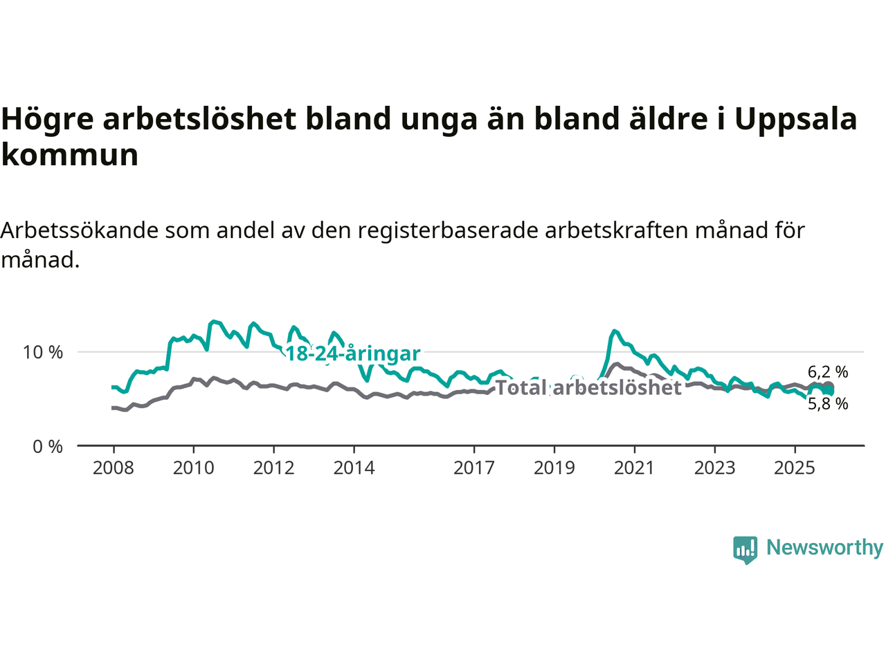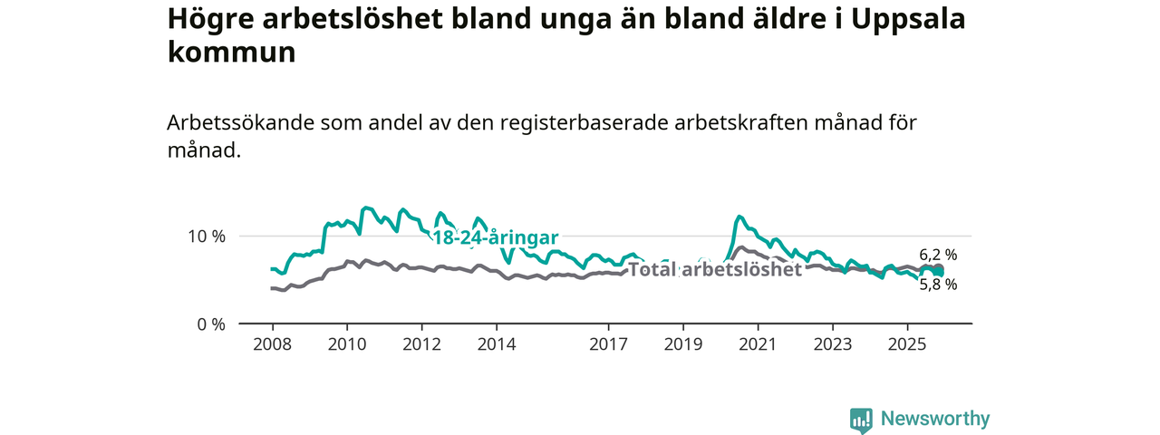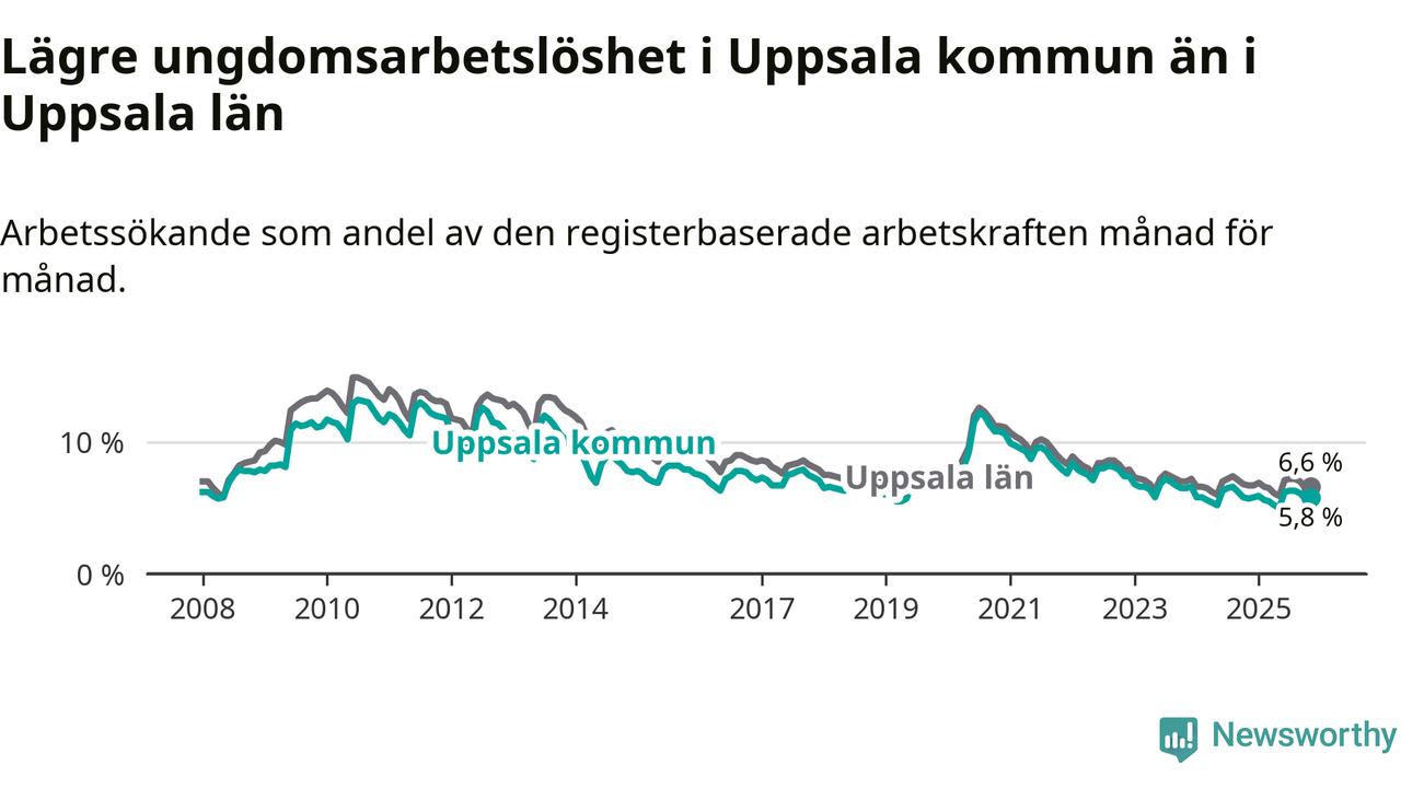 Medan Uppsala har högre total arbetslöshet än Uppsala, ligger ungdomsarbetslösheten 0,8 procentenheter lägre i Uppsala.