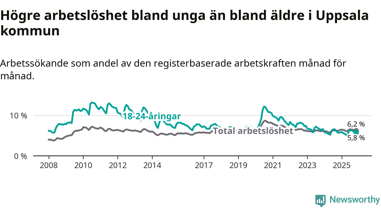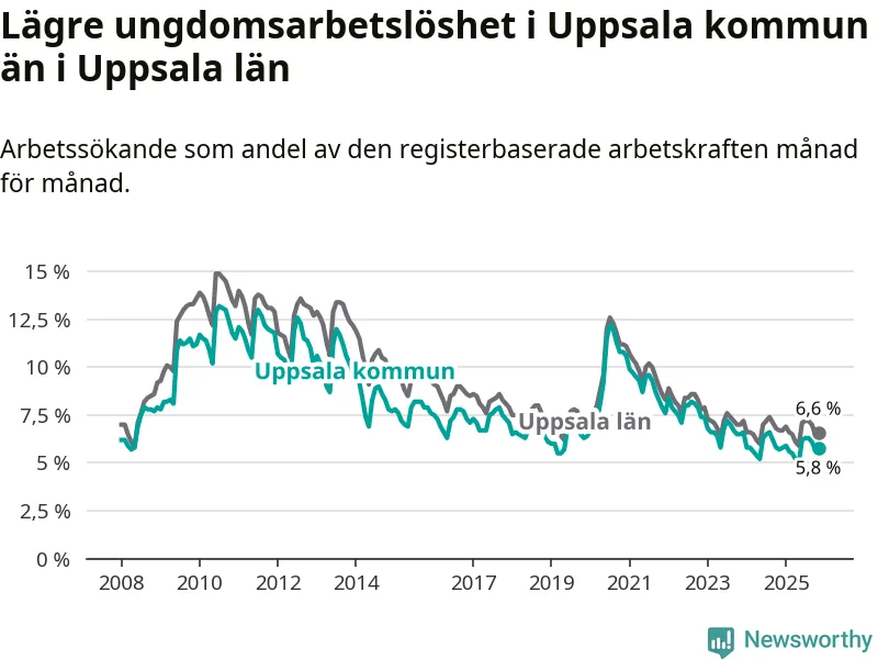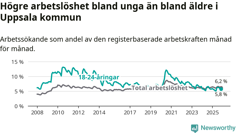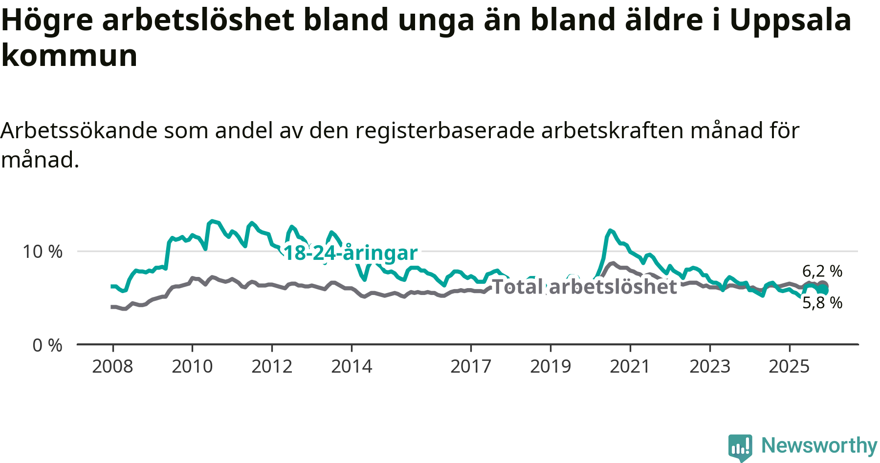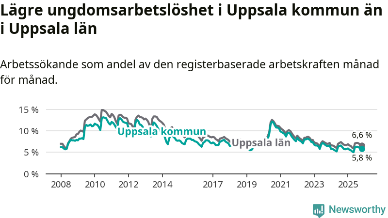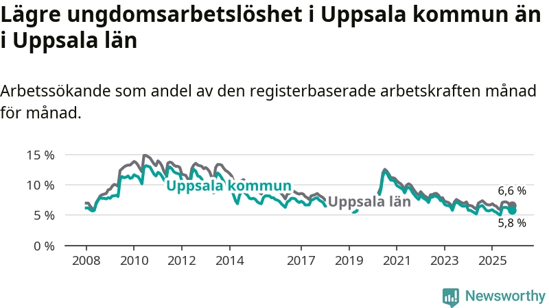Medan Uppsala har högre total arbetslöshet än Uppsala, ligger ungdomsarbetslösheten 0,8 procentenheter lägre i Uppsala.
