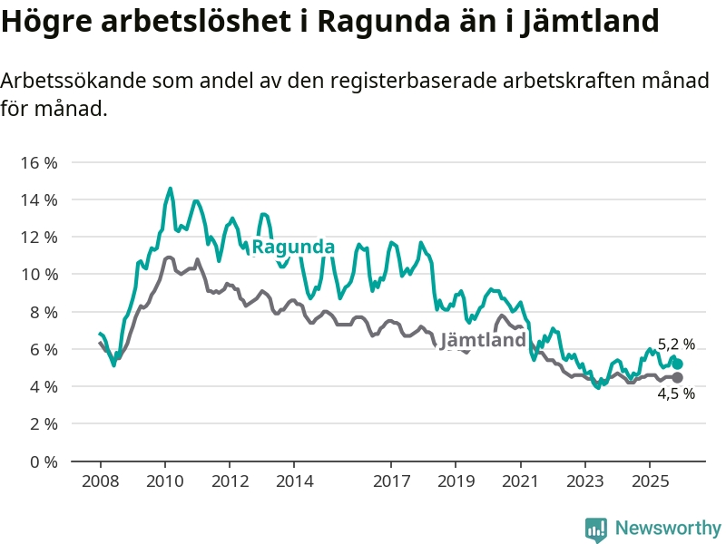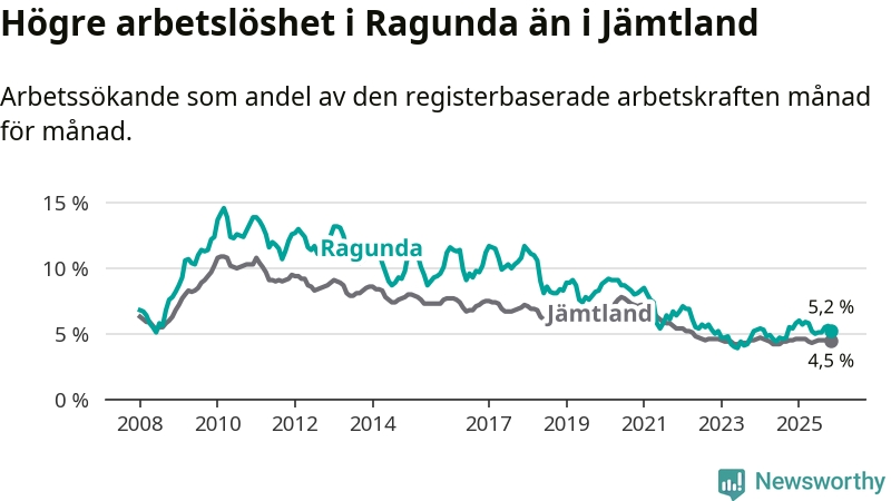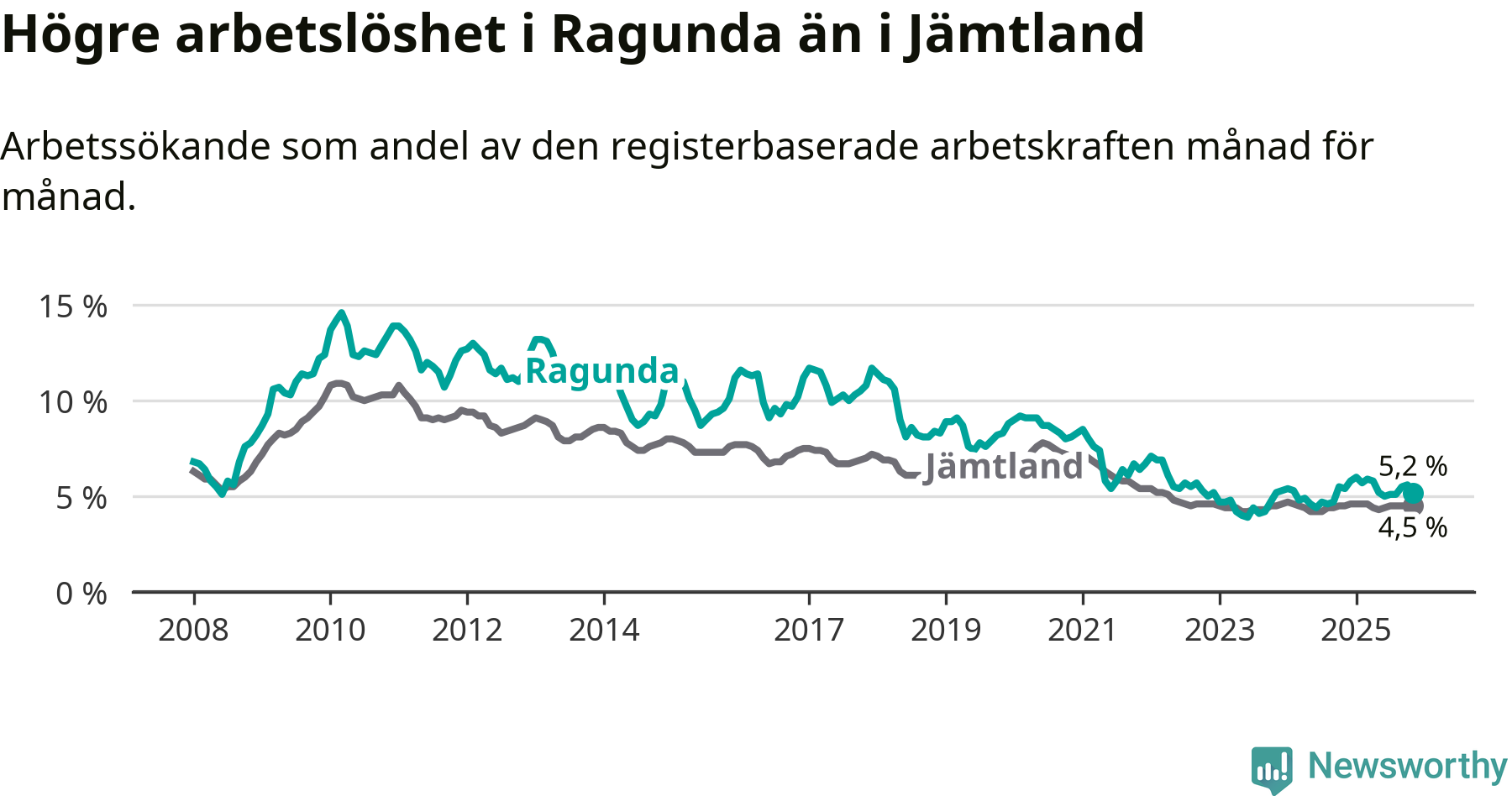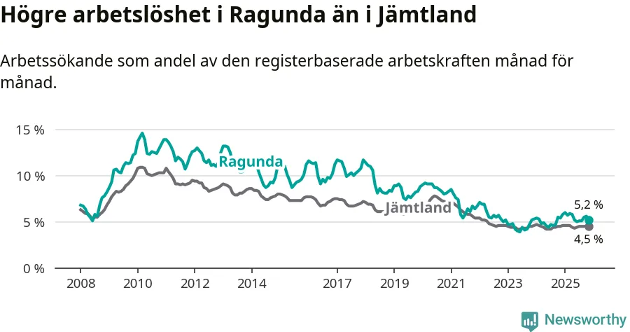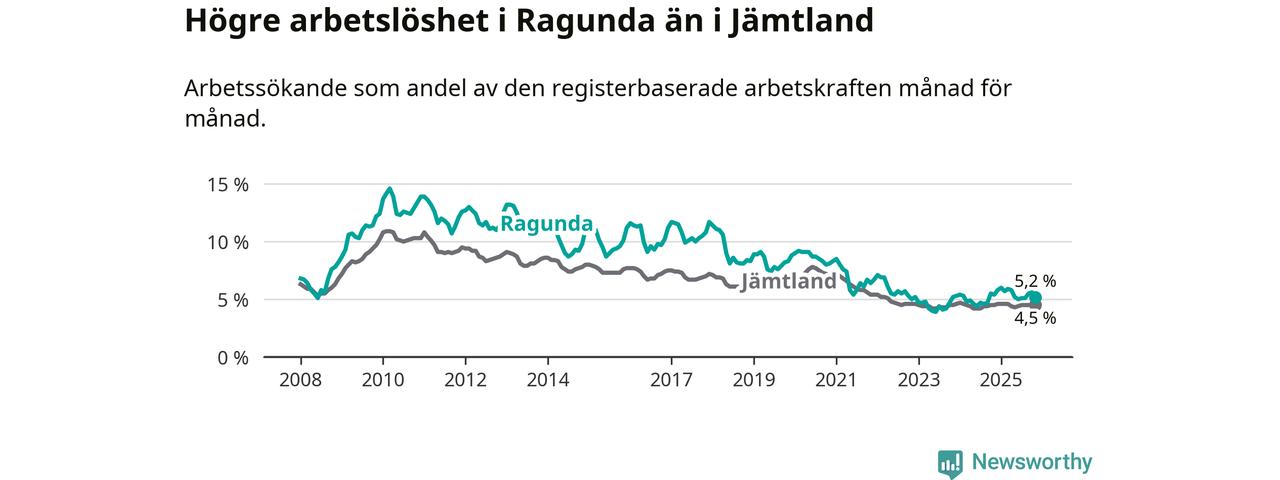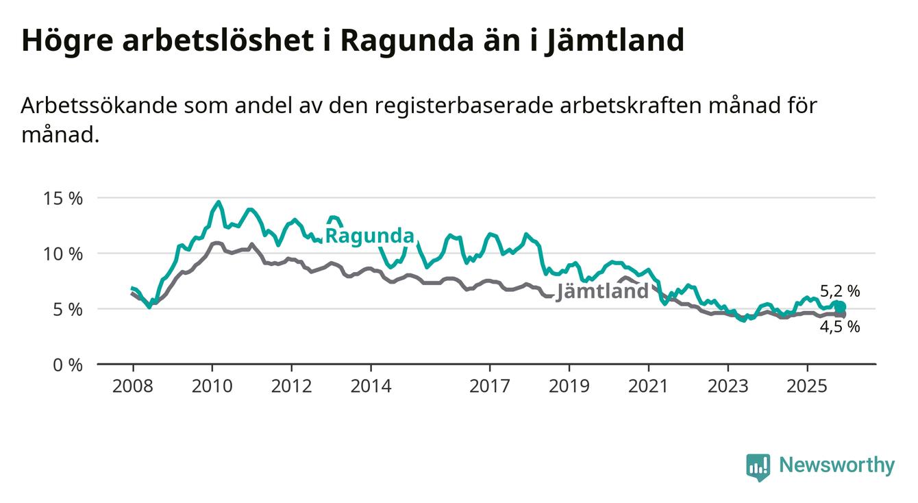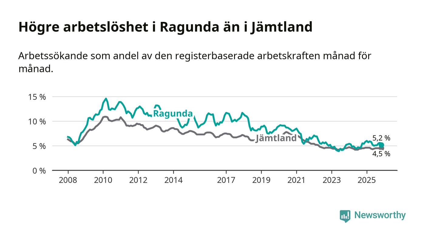 Även om arbetslösheten i Ragunda alltså minskar, så ligger den fortfarande över snittet i hela Jämtlands län (5,2 procent i kommunen, jämfört med 4,5 procent i hela länet). Krokom har den lägsta arbetslösheten i länet (3,1 procent), medan Strömsund har den högsta (6,2 procent). För att Ragunda skulle komma ner i samma arbetslöshetsnivå som Krokom skulle 48 personer behöva sysselsättas.