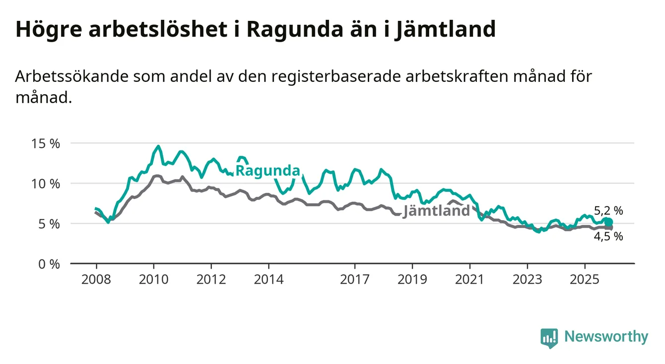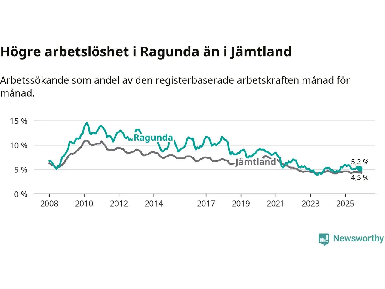 Sedan mars 2024 har arbetslösheten i Ragunda kommun ökat, men i november vände utvecklingen då andelen arbetslösa sjönk jämfört med året innan.