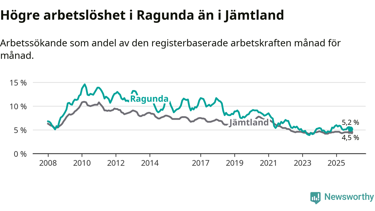Under november månad rapporterade Ragunda kommun en total arbetslöshet på 5,2 procent. Det är en minskning jämfört med samma tidpunkt i fjol (−0,2 procentenheter). I Jämtlands län däremot står arbetslösheten stilla.