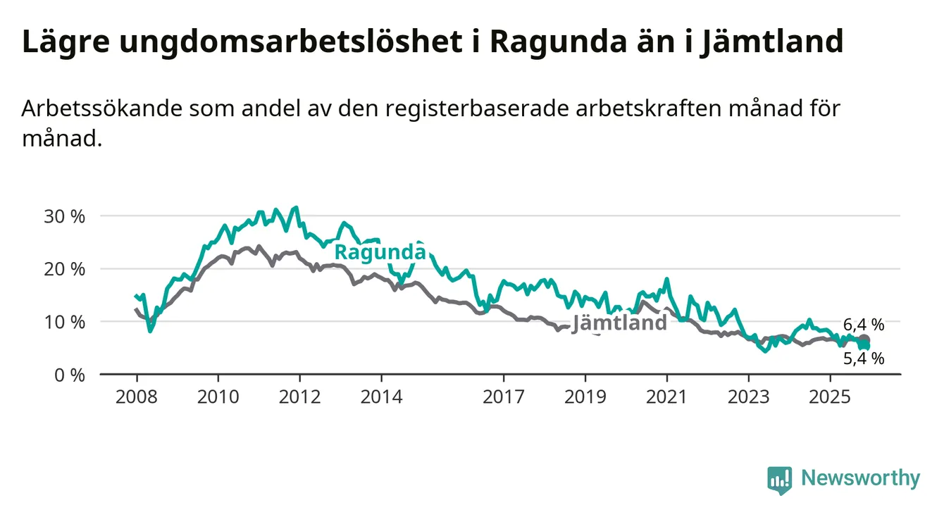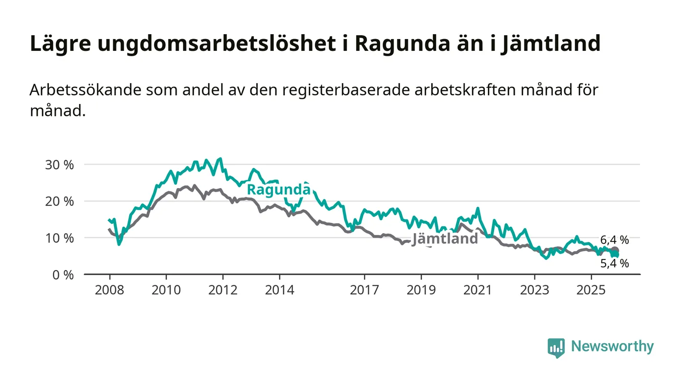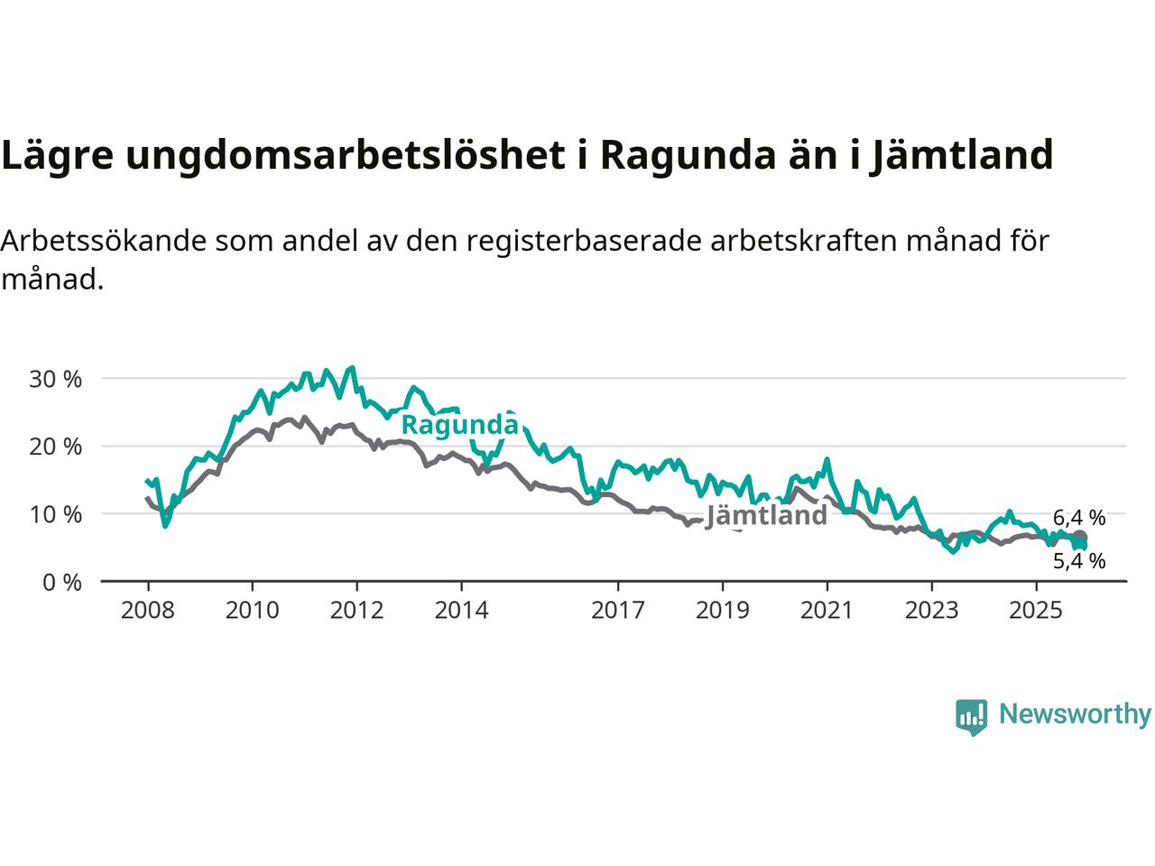 Medan Ragunda har högre total arbetslöshet än Jämtland, ligger ungdomsarbetslösheten 1,0 procentenheter lägre i Ragunda.