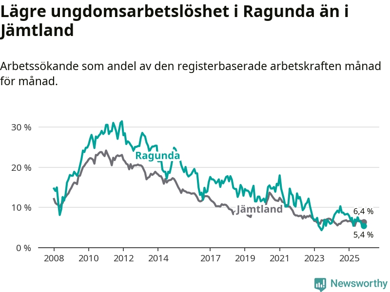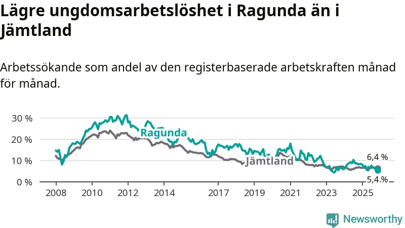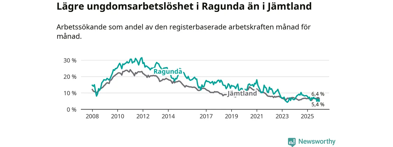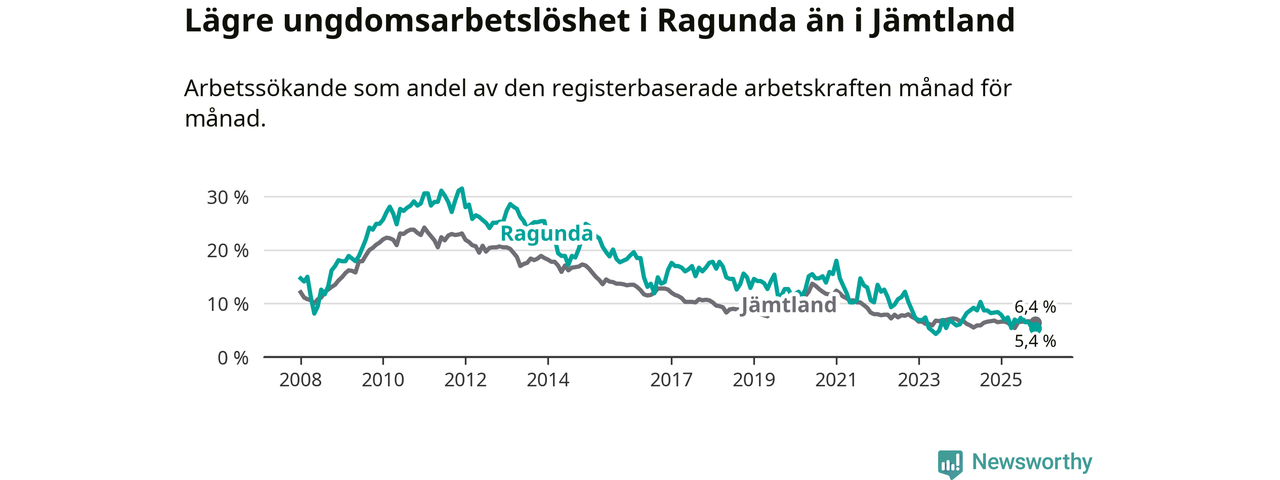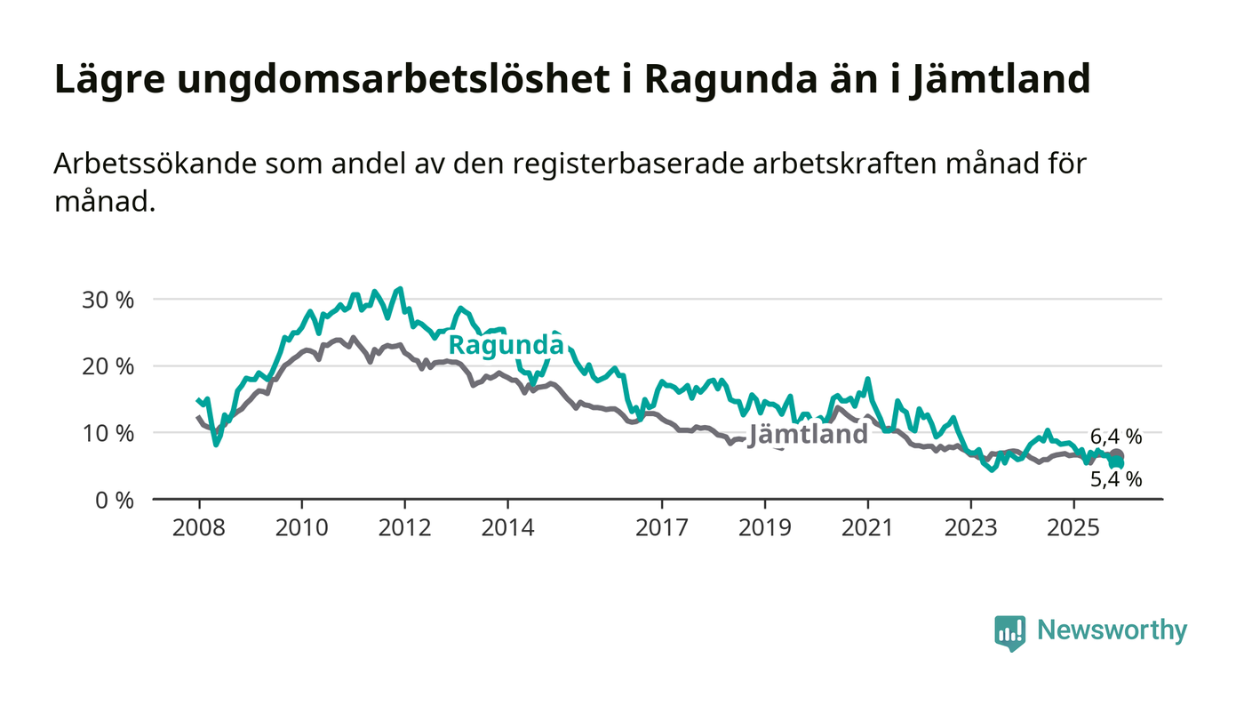 Medan Ragunda har högre total arbetslöshet än Jämtland, ligger ungdomsarbetslösheten 1,0 procentenheter lägre i Ragunda.