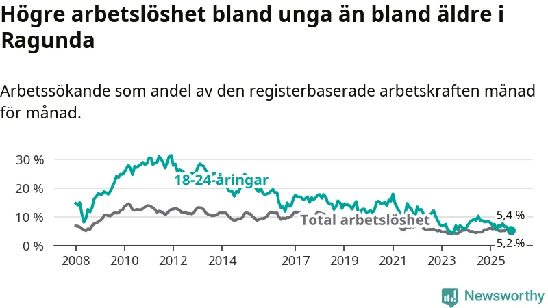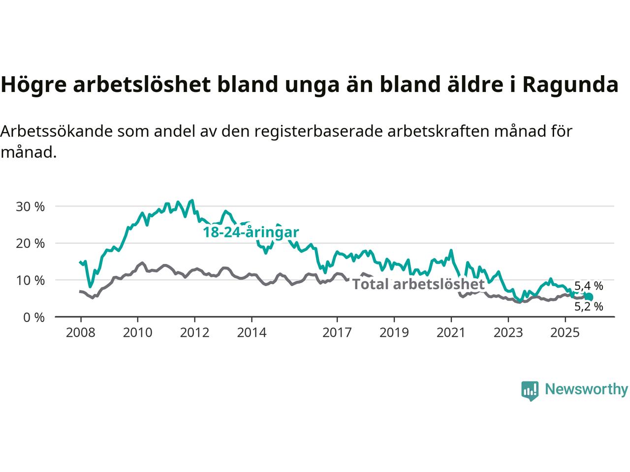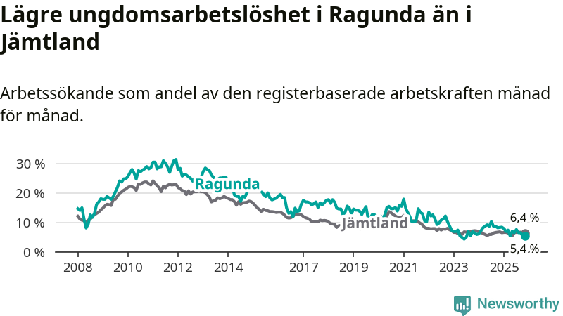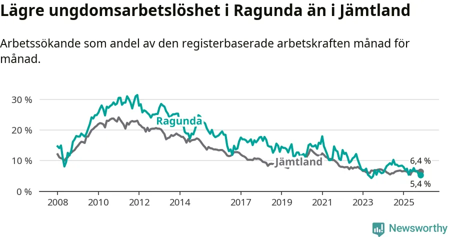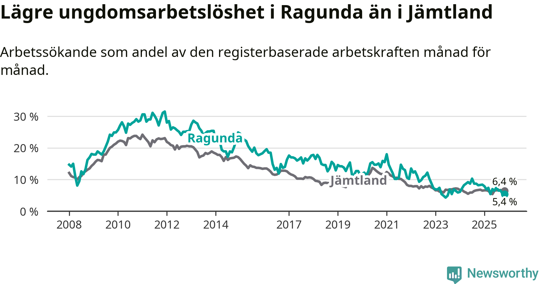 I och med den senaste månadens nedgång har de ungas arbetslöshet i Ragunda sjunkit tio månader i följd (ner från 7,9 procent i januari till 5,4 procent nu).