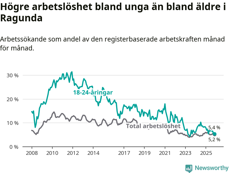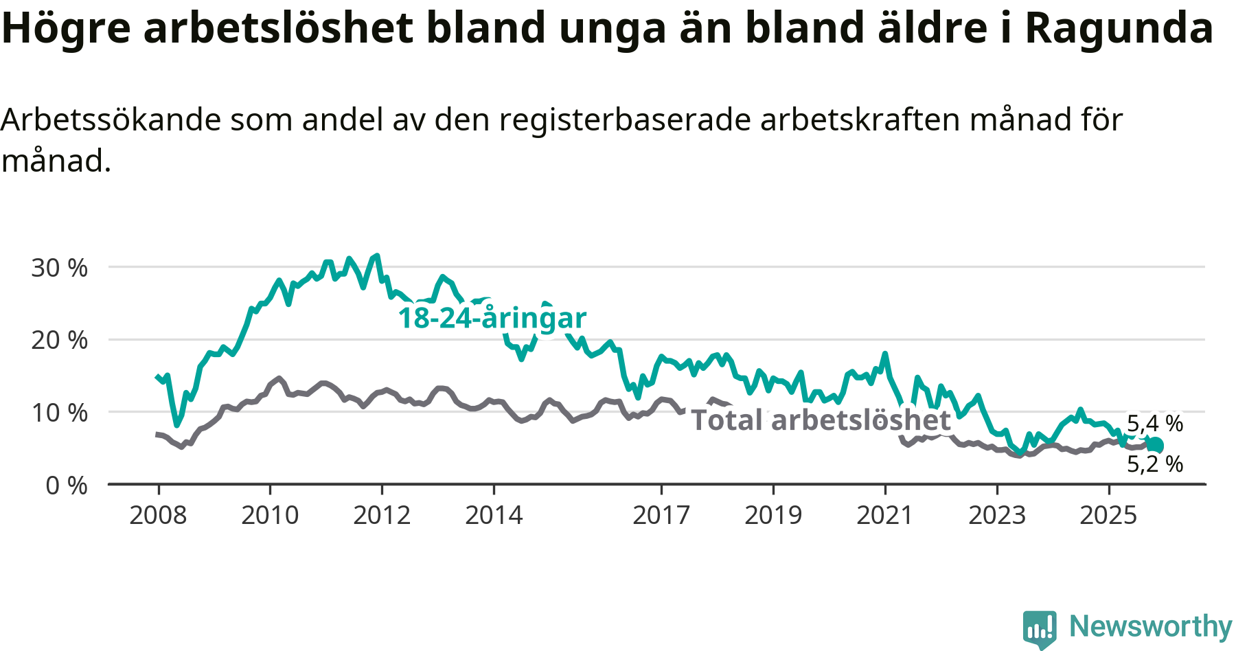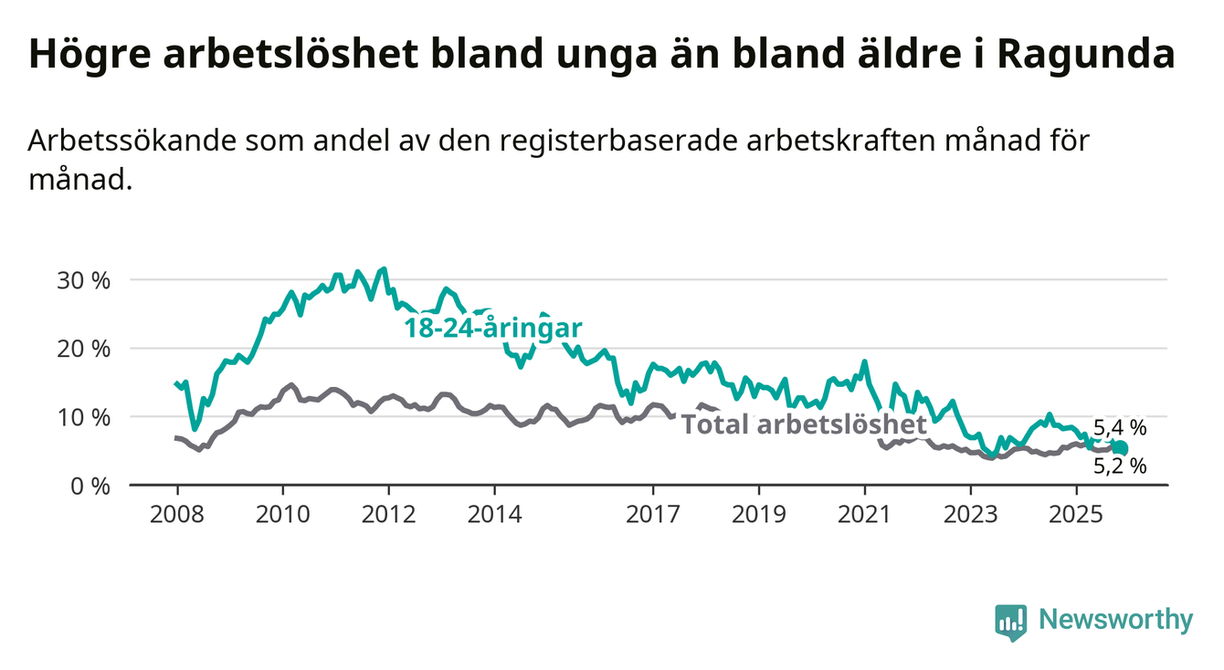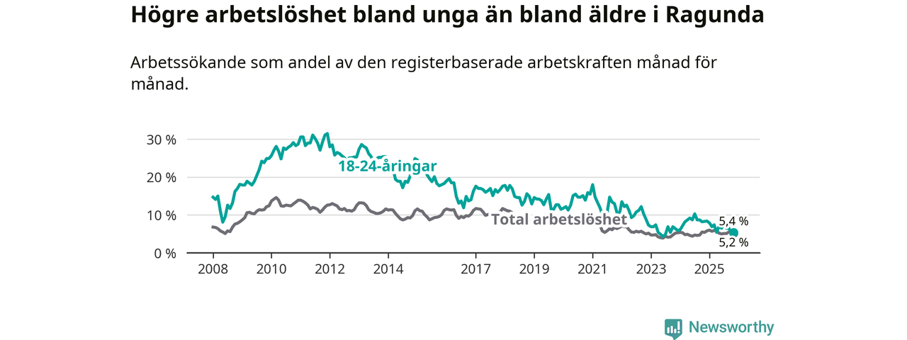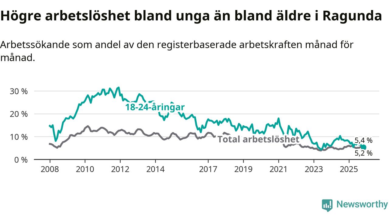 I och med den senaste månadens nedgång har de ungas arbetslöshet i Ragunda sjunkit tio månader i följd (ner från 7,9 procent i januari till 5,4 procent nu).