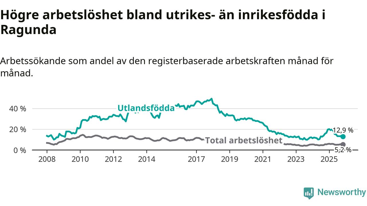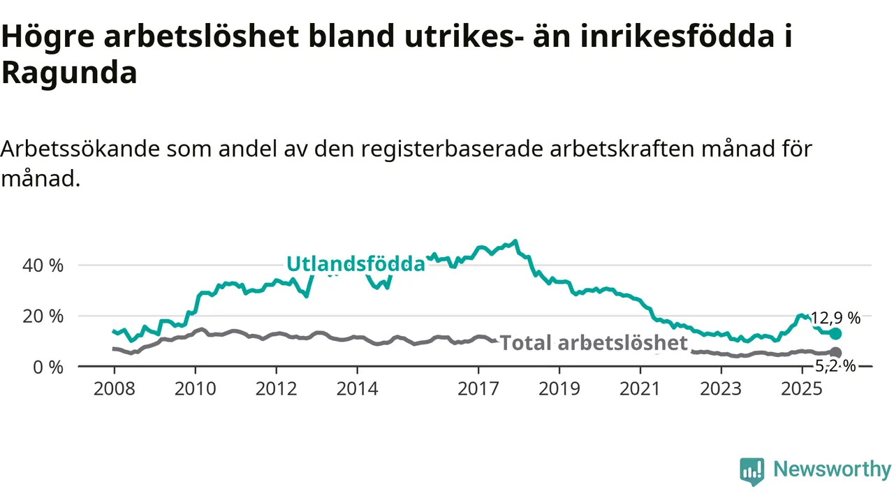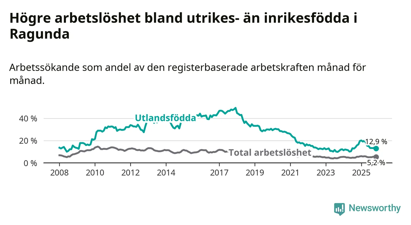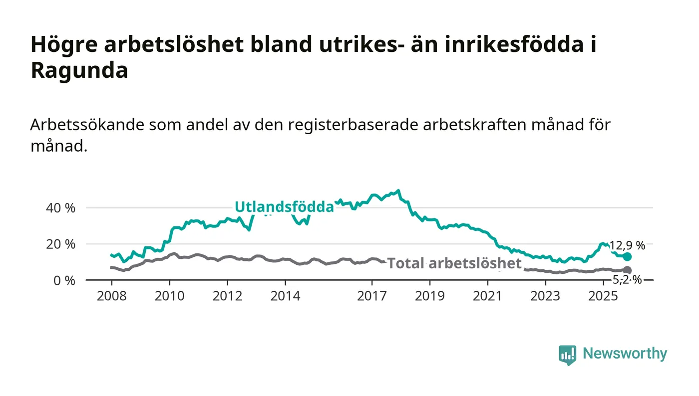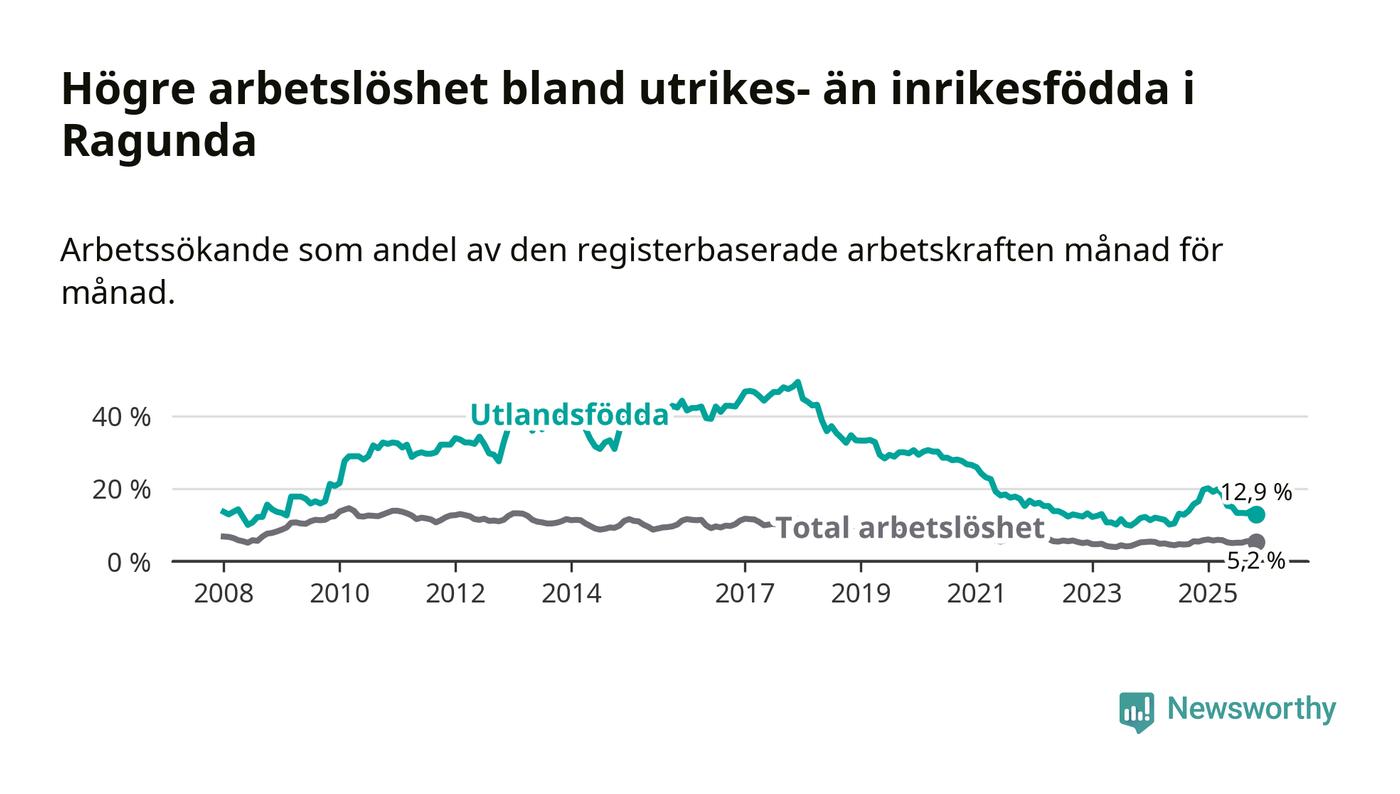 Skillnaden i arbetslöshet mellan utrikesfödda och hela befolkningen är 7,7 procentenheter i Ragunda. Det är en betydligt mindre skillnad än för ett år sedan (−3,4 procentenheter).