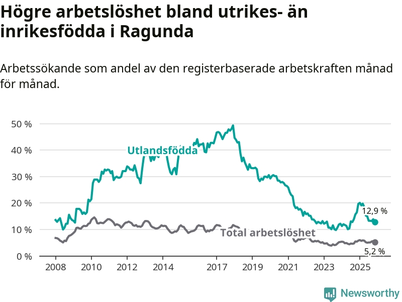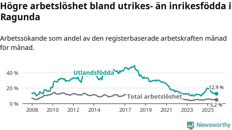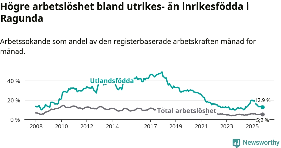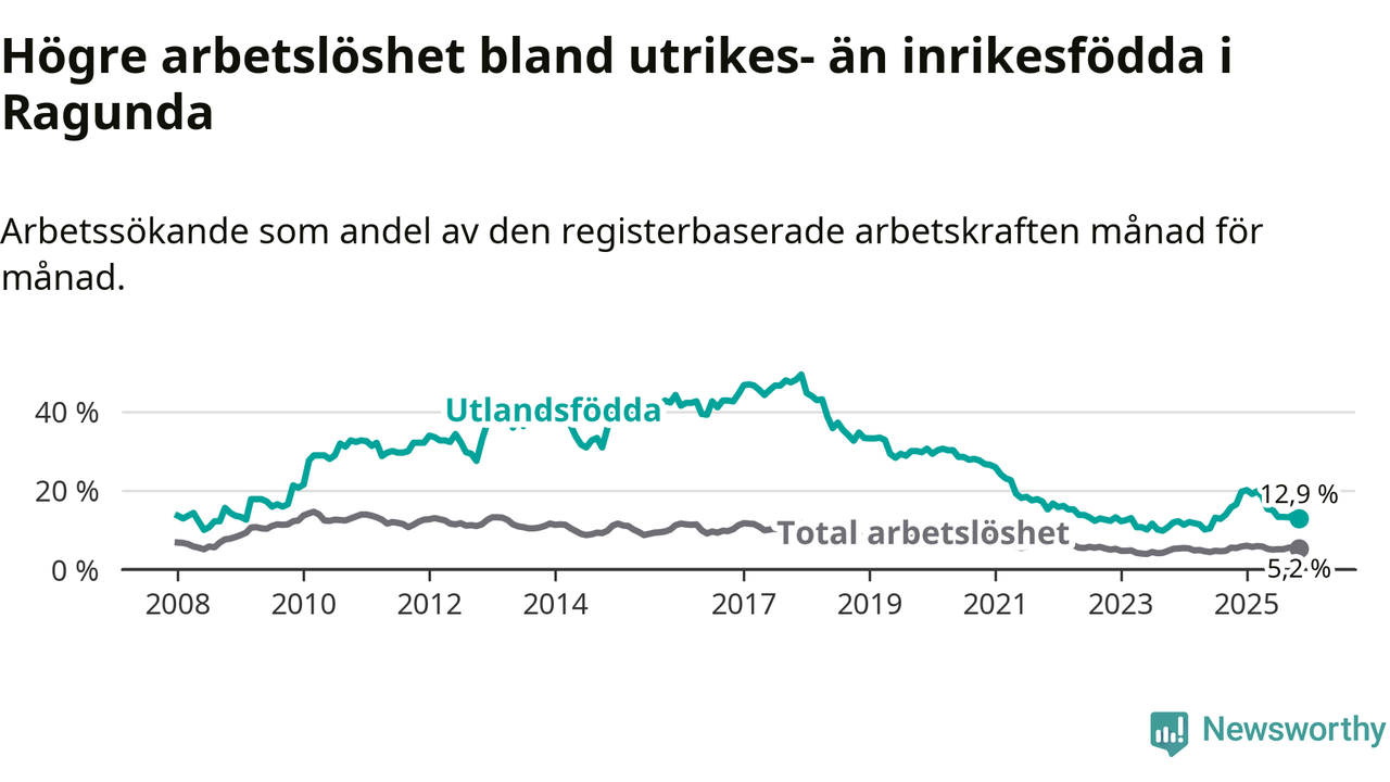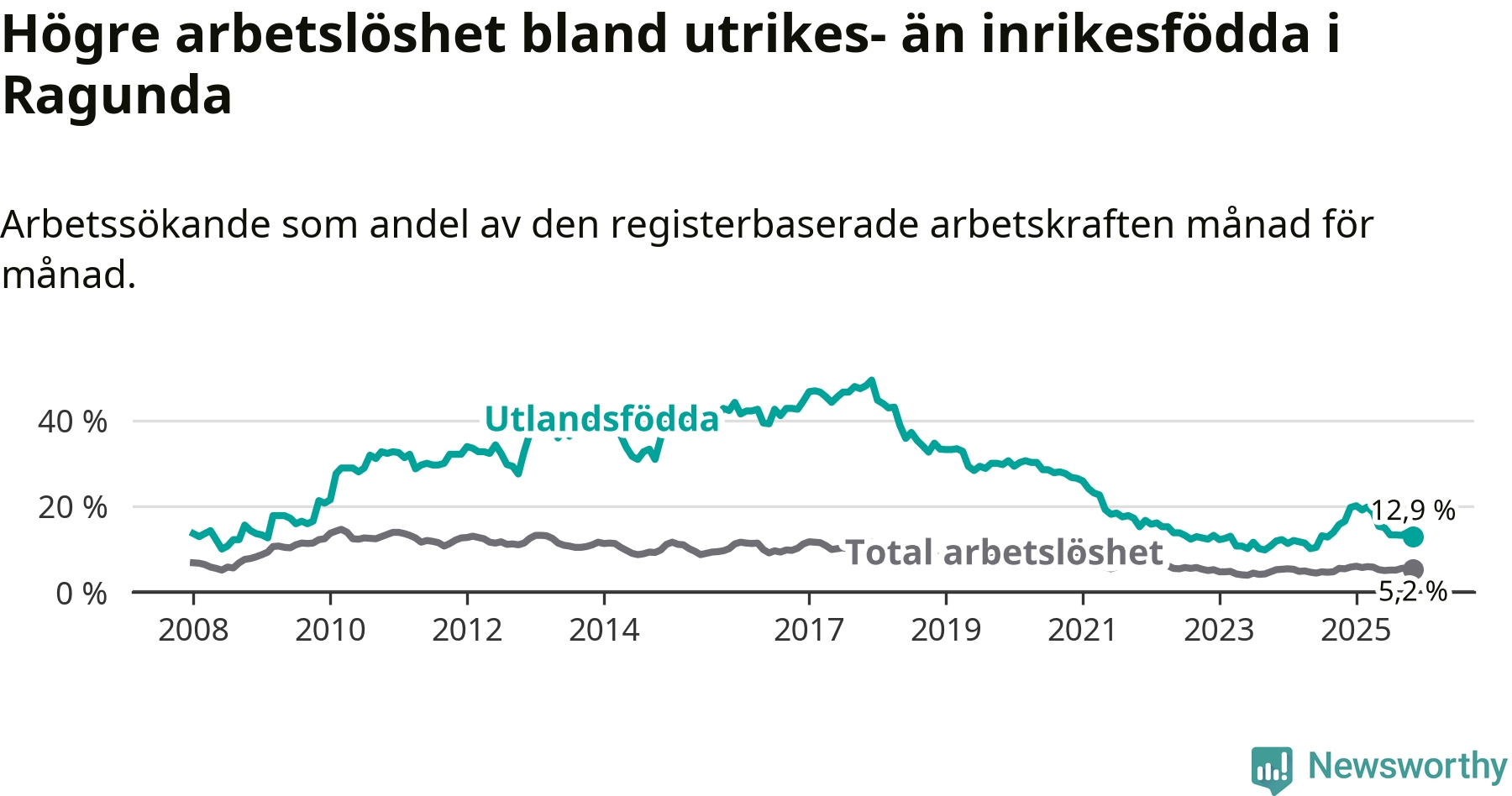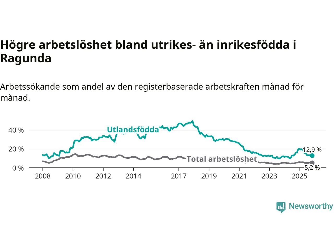 Skillnaden i arbetslöshet mellan utrikesfödda och hela befolkningen är 7,7 procentenheter i Ragunda. Det är en betydligt mindre skillnad än för ett år sedan (−3,4 procentenheter).