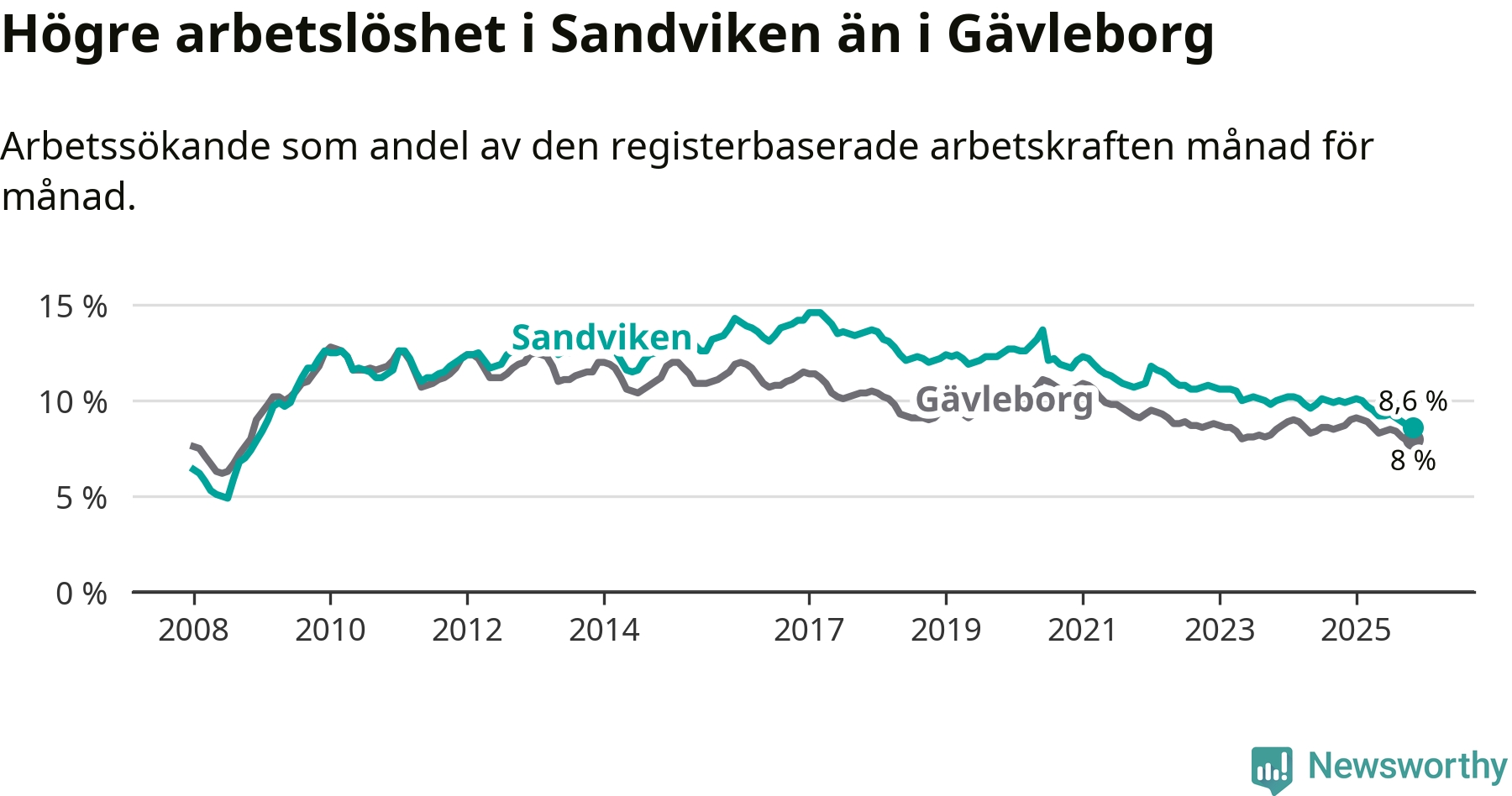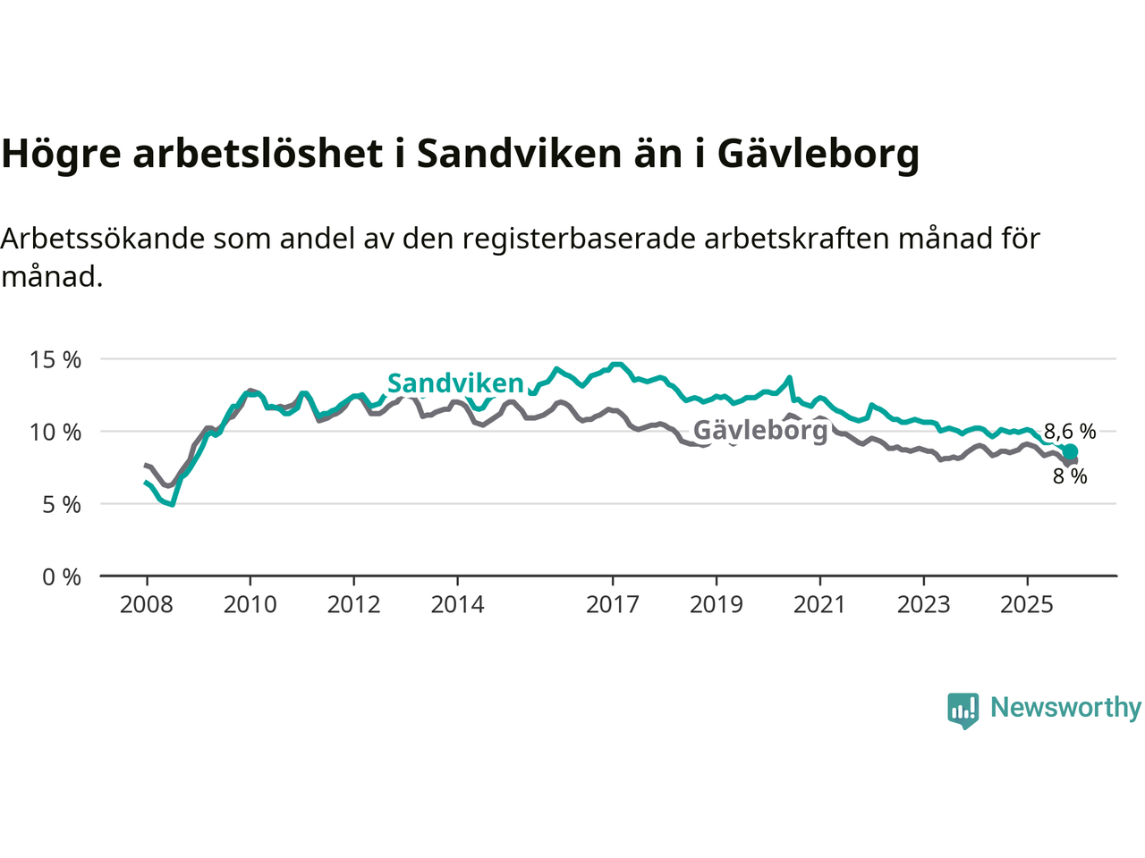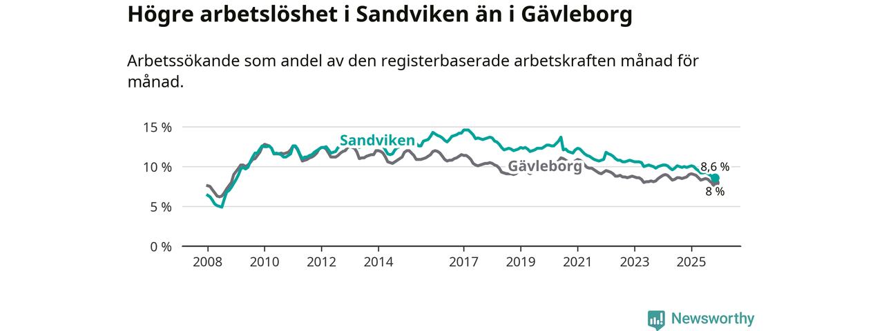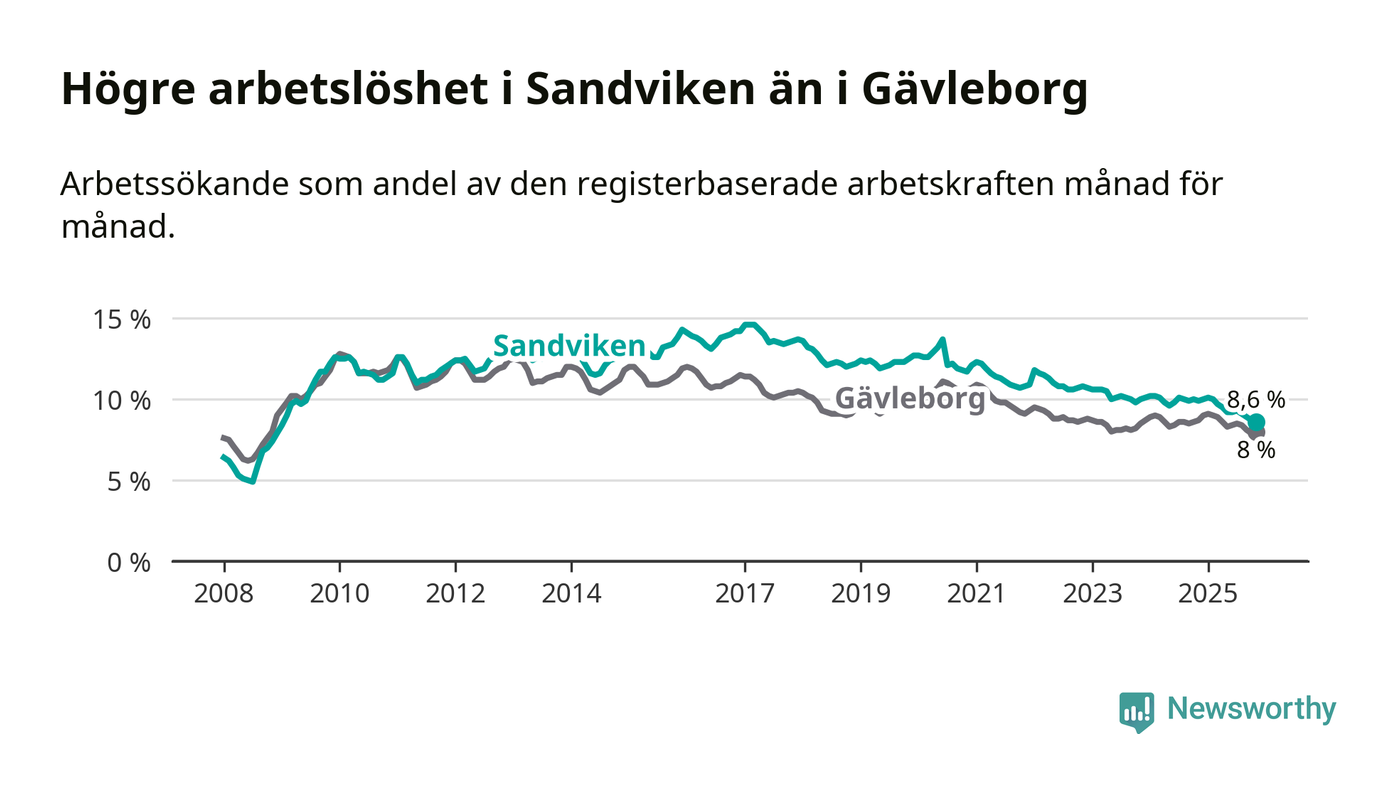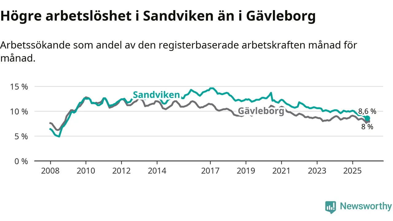 Det är 13:e månaden i följd som arbetslösheten i Sandviken är lägre än den var under samma tidpunkt året innan. Sedan oktober 2024 har arbetslösheten gått ner från 10,0 till 8,6 procent. Den nuvarande arbetslöshetsnivån är därmed den lägsta sedan januari 2009.